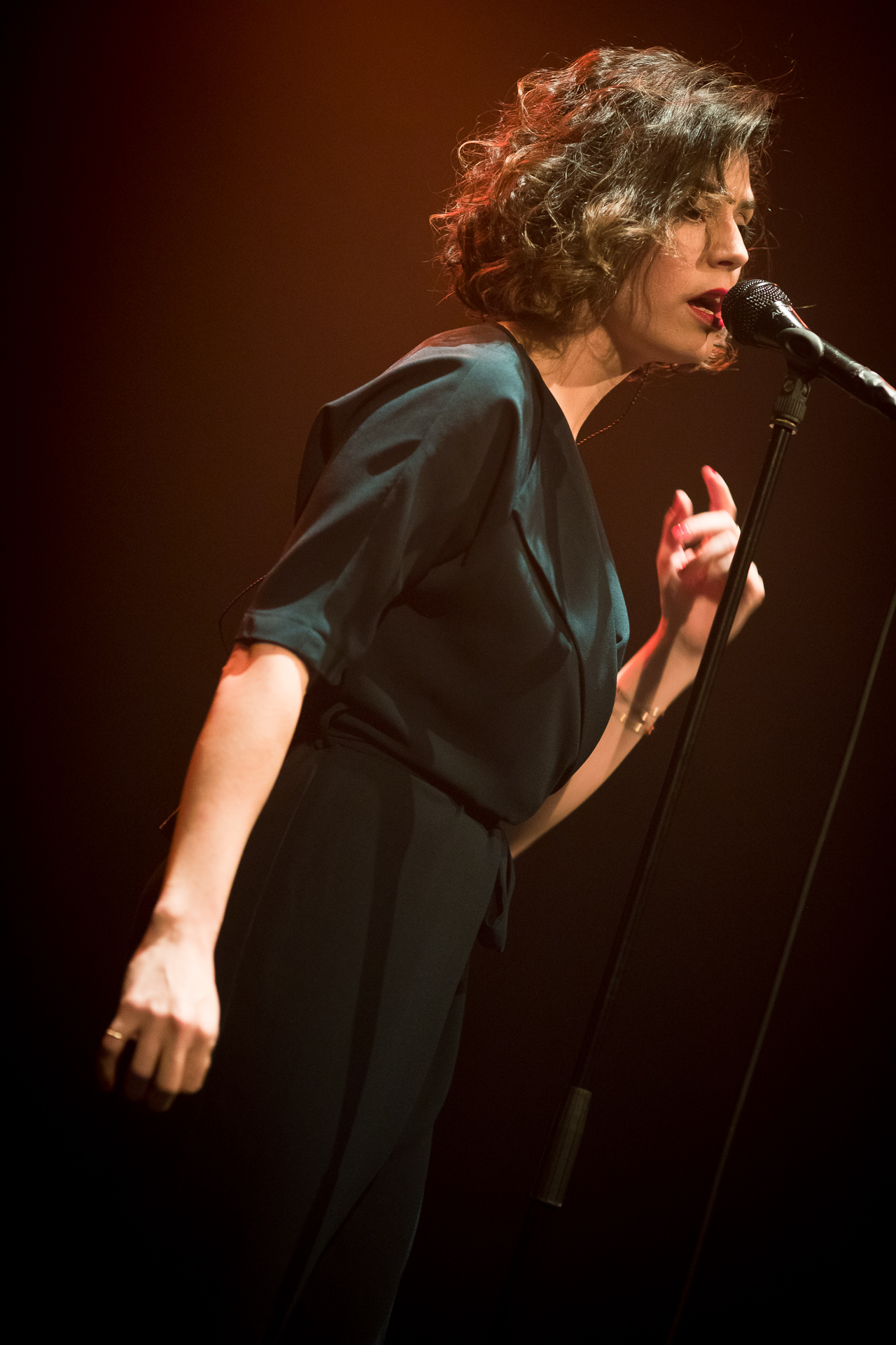C’est très malin d’utiliser la séquence du club Silencio de Mulholland Drive en introduction. Il n’y a pas d’orchestre dit le présentateur, vous entendez des instruments mais ils ne sont pas là, il n’y a pas de groupe, c’est une illusion. Et effectivement Angèle Osinski est tout seule sur scène et elle chante sur les "bandes" toutes fraîches de son EP à sortir sur le label de Katel (qui réalise et lance ce soir en coulisses les bandes en question). Les concerts suivants se feront a priori avec un ou plusieurs musiciens en plus mais même dans cette configuration minimaliste, la voix et le charisme de la chanteuse font mouche. Le set est un peu court pour se faire un avis définitif sur la musique mais on note déjà une certaine sophistication dans les constructions mélodiques qui n’est pas sans rappeler le dernier album de Katel justement.