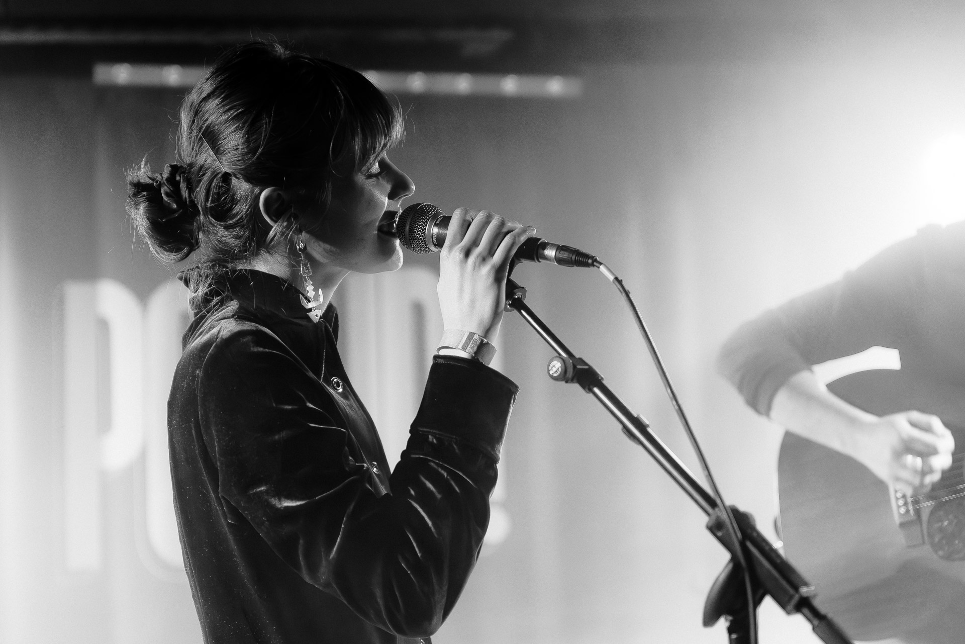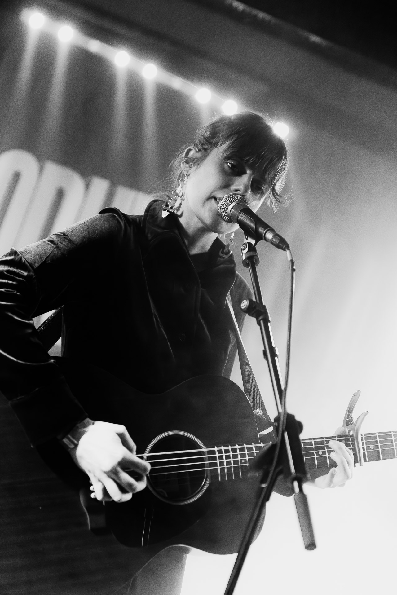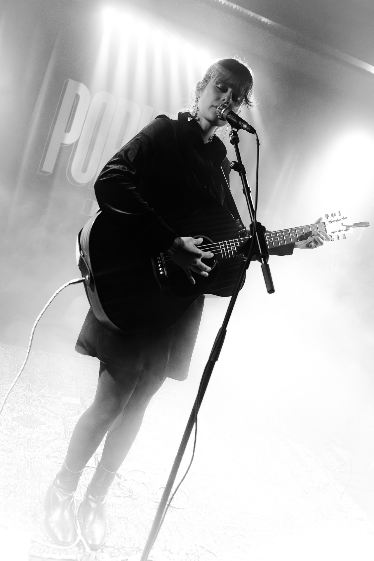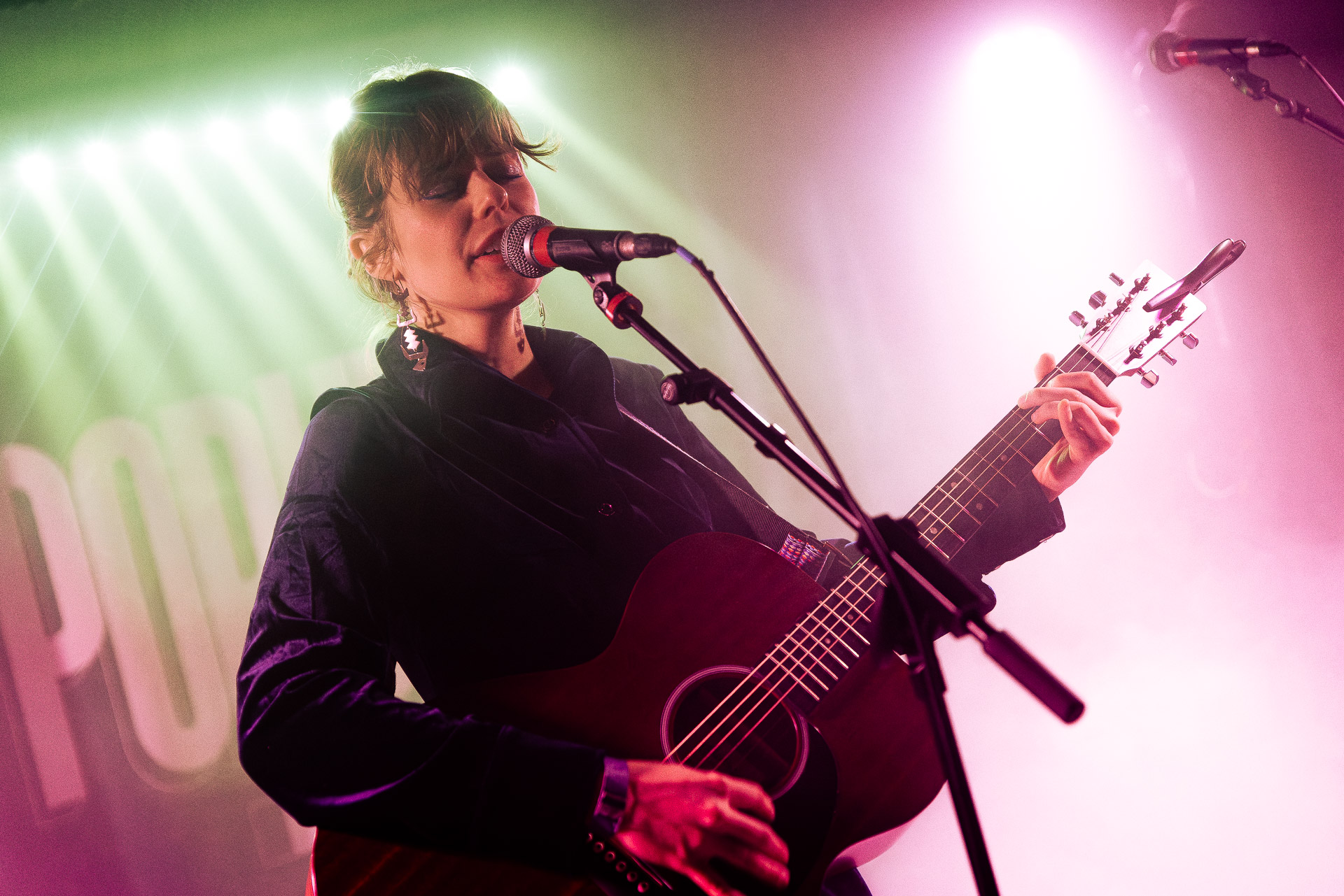 On était curieux de voir comment une telle proposition pouvait fonctionner sur la scène du PopUp, décor plutôt "industriel" que "terroir", ses éclairages intenses, son brouillard mais aucune inquiétude, déjà plutôt à l’aise avec la scène, Barbara déroule ses chansons dans cette même formule guitare-voix que sur disque et ça marche, on écoute religieusement, tout simplement parce que la voix est belle et les chansons bien écrites (avec la particularité de rarement dépasser les trois minutes, pas de refrains répétés maintes fois ici, peu de parties instrumentales, on a l’impression que c’est le fait de raconter l’histoire qui prime)