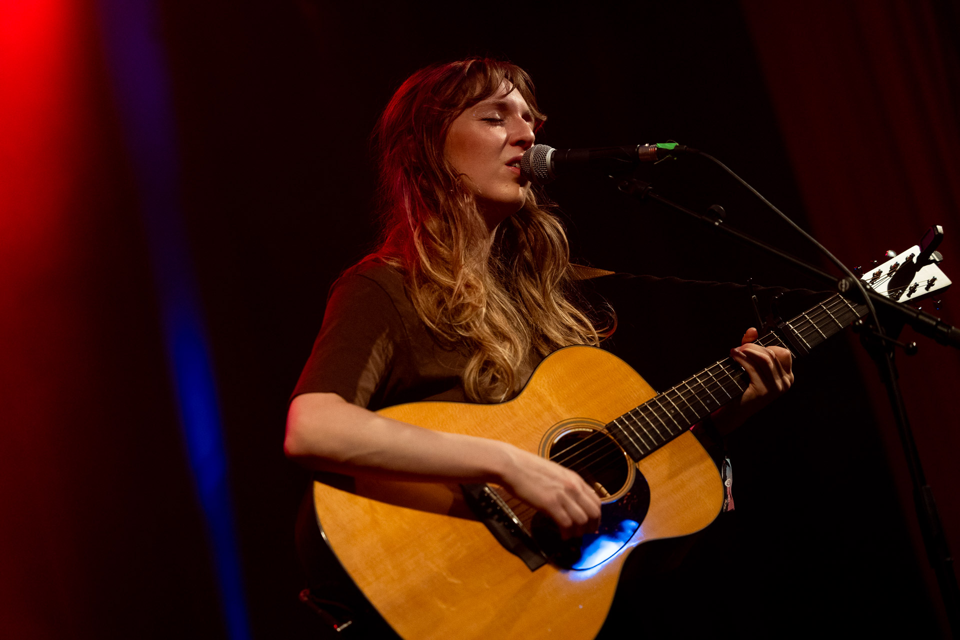 Notre premier concert de cette édition 2025 du MaMa est peut être aussi celui qu’on attendait le plus : Benni n’a qu’un single et un EP au compteur mais avec ces huit chansons tout rond, elle nous a fait une sacrée impression (pour plus de louanges on vous renvoie à notre chronique de son EP Bleeding Colours), c’est d’ors et déjà un des disques qu’on aura le plus écouté cette année, parfois deux ou trois fois d’affilée, sans être jamais rassasié, en prenant toujours le même plaisir à se plonger dans l’univers fragile et mélancolique de cette jeune artiste belge, à tressaillir au fil de toutes les émotions qui habite sa si jolie voix, les arrangements élégants tissés tout autour.
