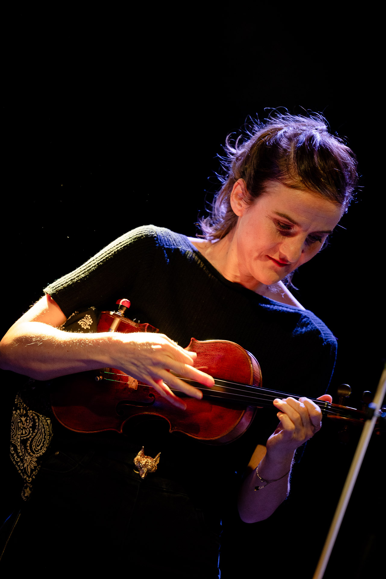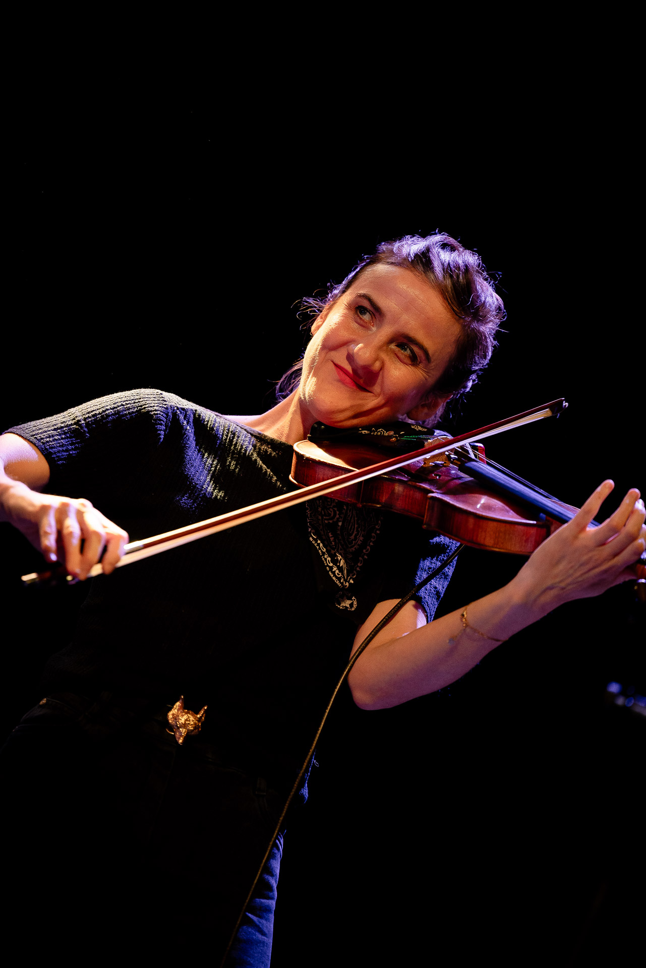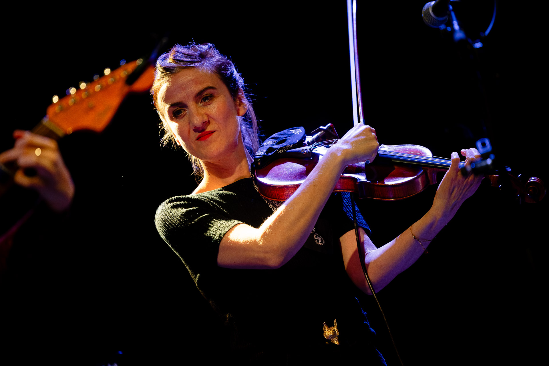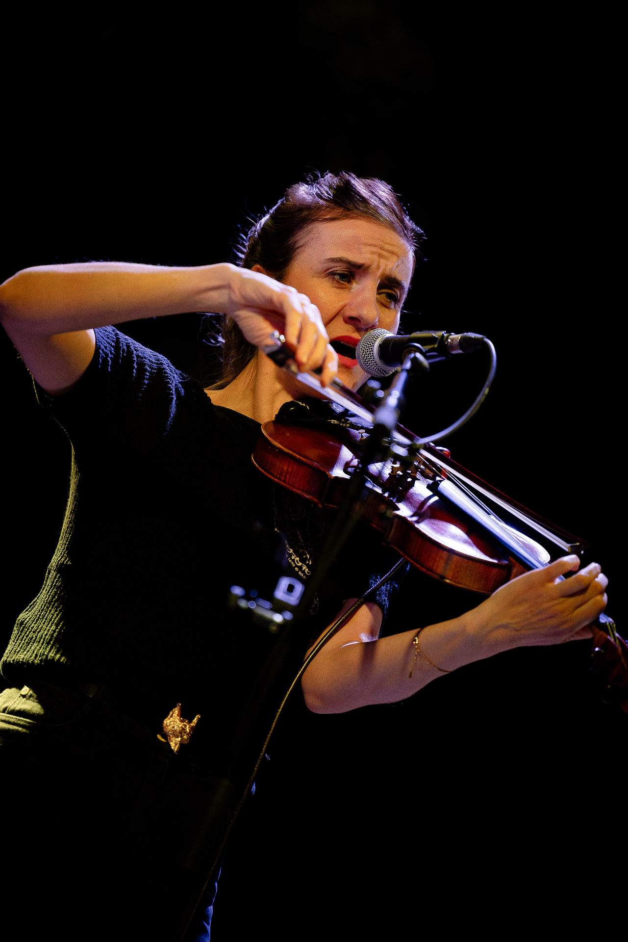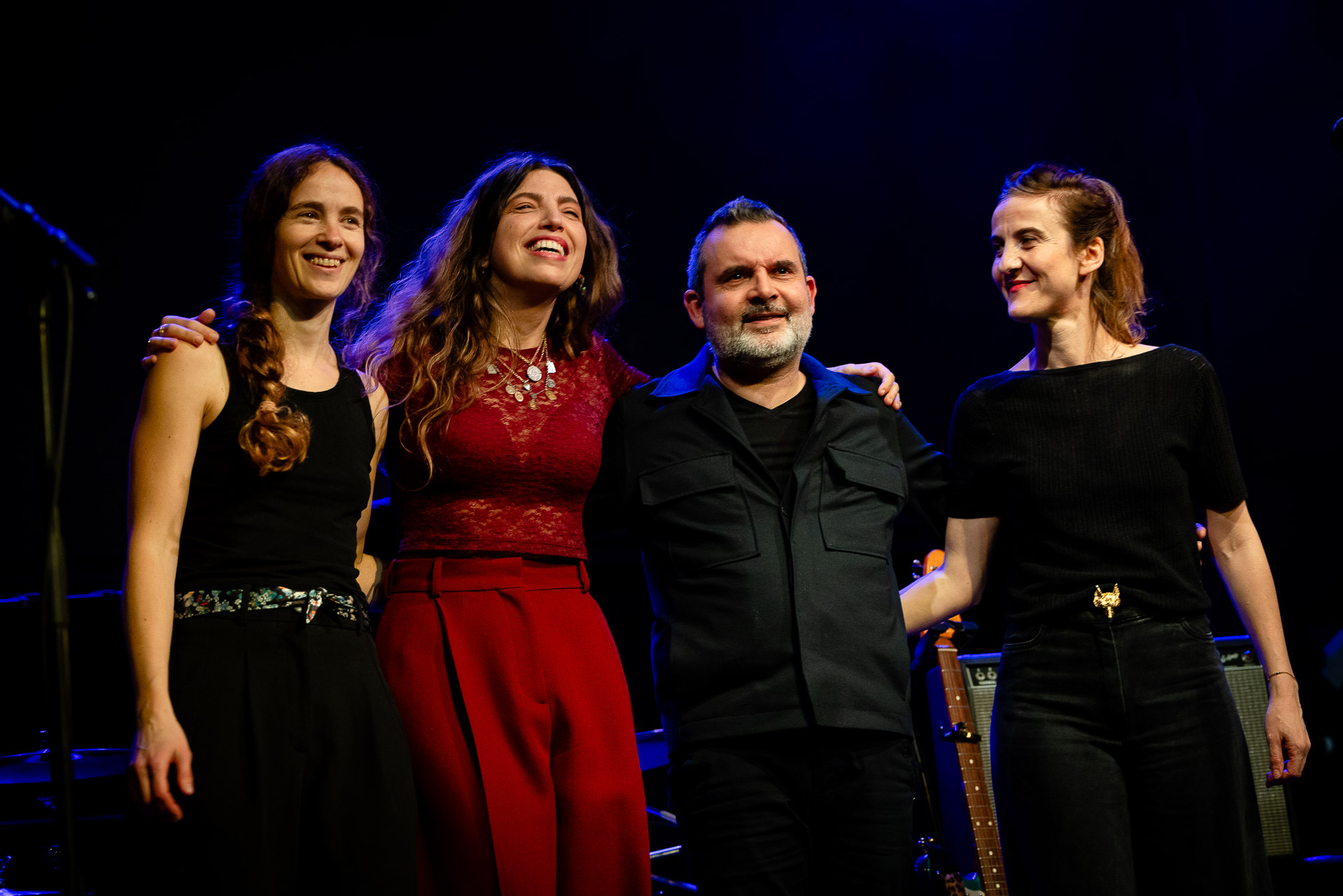 On ne l’a plus entendu après le début du concert : si la musique de Clou reste plutôt pop/folk, la talentueuse bande qui l’accompagne depuis le début de la tournée s’est depuis totalement approprié les morceaux des deux albums de Clou qu’ils interprètent, les approches sont variées, du "Chant de Noël", toute suave et gentil en apparence mais qui dresse un portait au vitriol les Noëls en famille de l’enfance de la chanteuse, à des parties instrumentales qui montent en puissance, en passant par un rythme presque zouk le temps d’un morceau. La basse de Marie Lalonde toujours souriante et décontractée, est souvent sur le devant, tandis que Christelle Lassort nous régale au violon d’arrangements qui n’appartiennent qu’à ces version live. Derrière les fûts, David Gerbi adapte parfaitement sa frappe aux titres le plus doux comme aux moments où il faut amener un peu plus de force et de présence rythmique. Il chante aussi la partie de PML sur le titre "Sans Avion" sorti récemment. Et Comme il donne des cours de batterie au Blanc-Mesnil et que certains de ces élèves présents ce soir, il se fera chambrer toute la soirée par Clou.