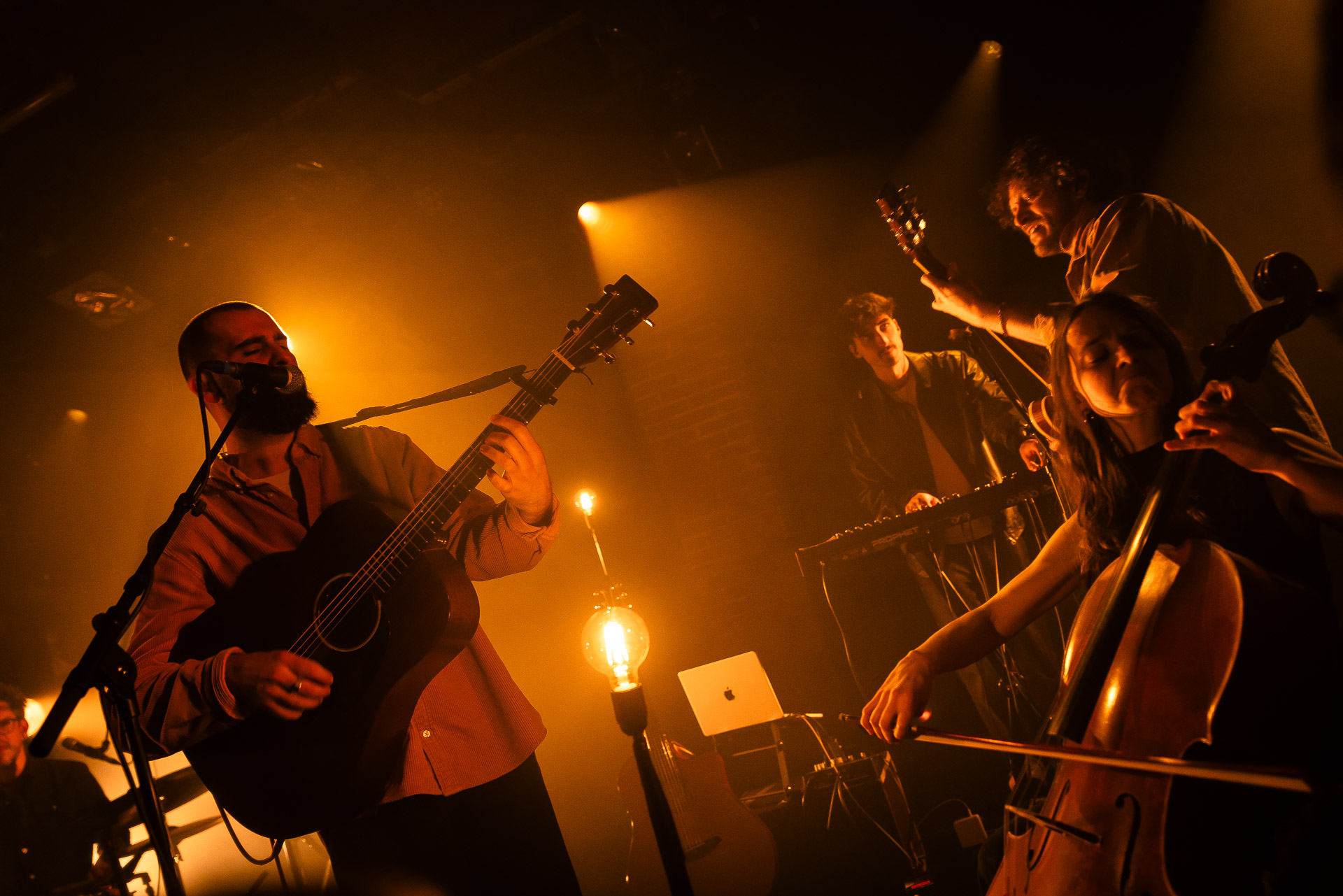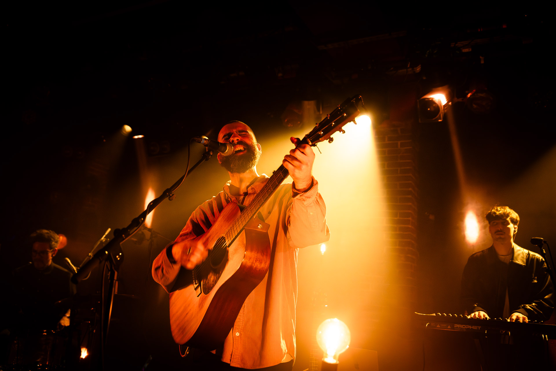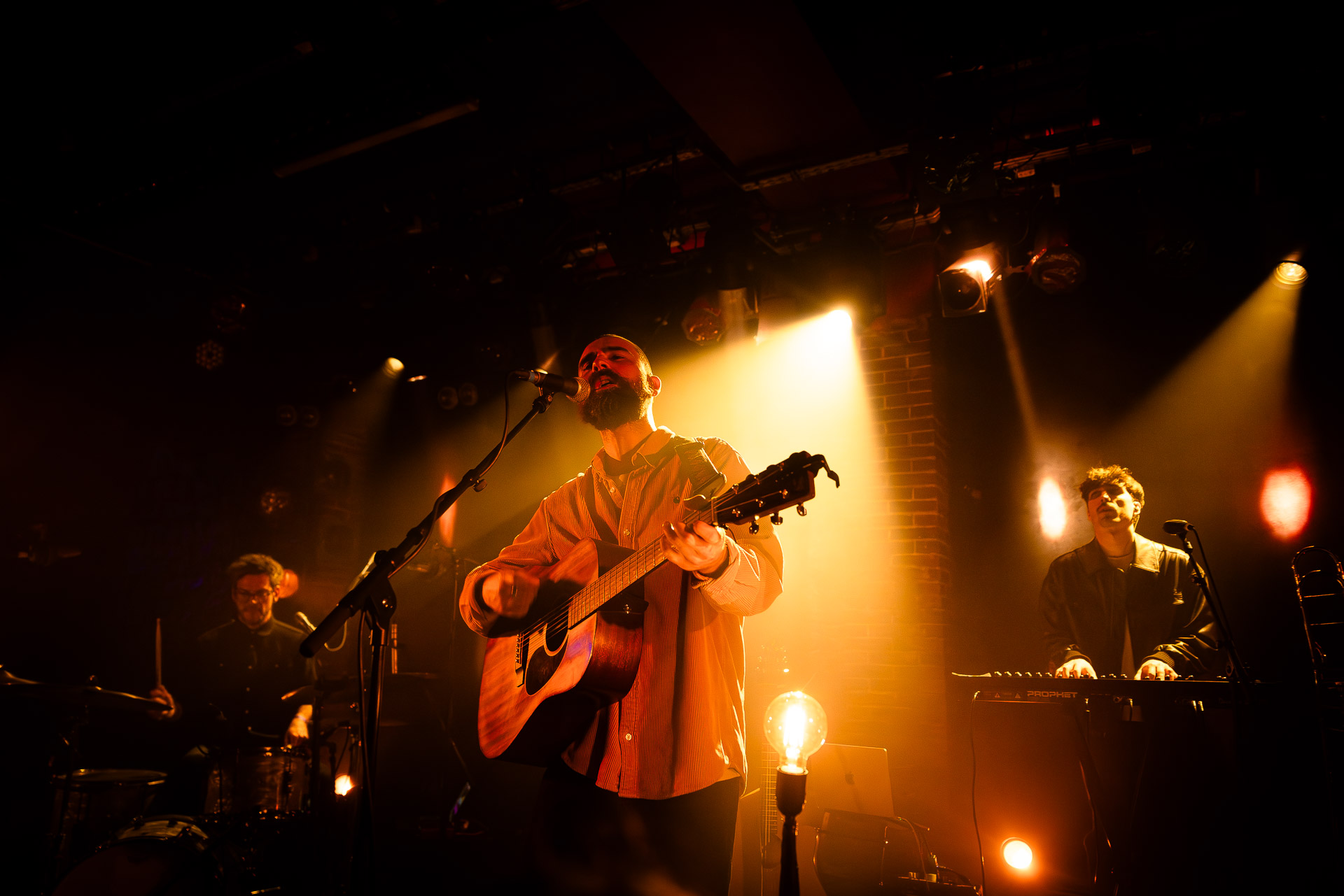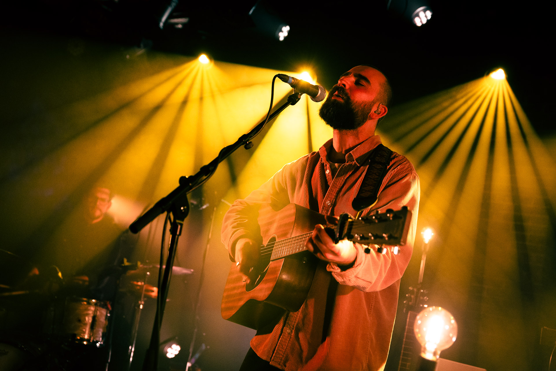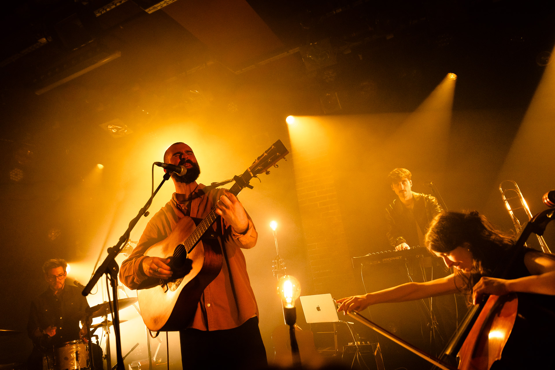 Ca commence avec la Maroquinerie dans le noir complet, et une simple ampoule qui vient éclairer progressivement la silhouette puis la barbe si reconnaissable de Hugo Barriol. Il débute ce concert seul avec sa guitare acoustique. Une entrée en matière intimiste qui laisse toute la place à la chaleur et l’émotion dans la voix de Hugo mais il est vite rejoint par ses musiciens : à la batterie et à la guitare on retrouve les complices habituels : Antoine Kerninon et Diego Lipnizky, plus un nouveau (pour nous en tout cas) aux cuivres et au clavier Ossian Macary. On sent que tout ce petit monde a l’habitude de jouer ensemble et le groupe apporte une surplus d’énergie, des couleurs supplémentaires qui font que si la musique reste folk, les ambiances et les intensités changent, avec des moments tout en retenu focalisées sur la voix et des parties instrumentales où tout le monde peut se lâcher un peu plus.