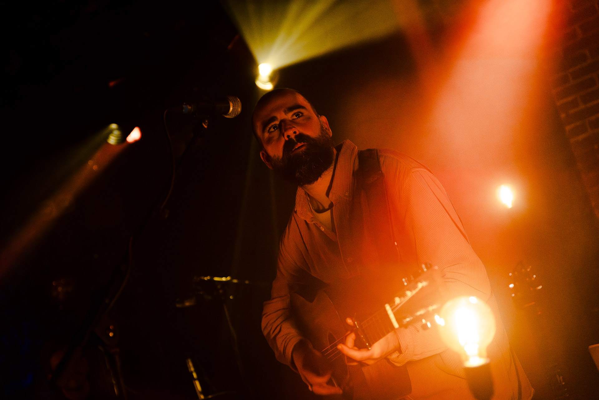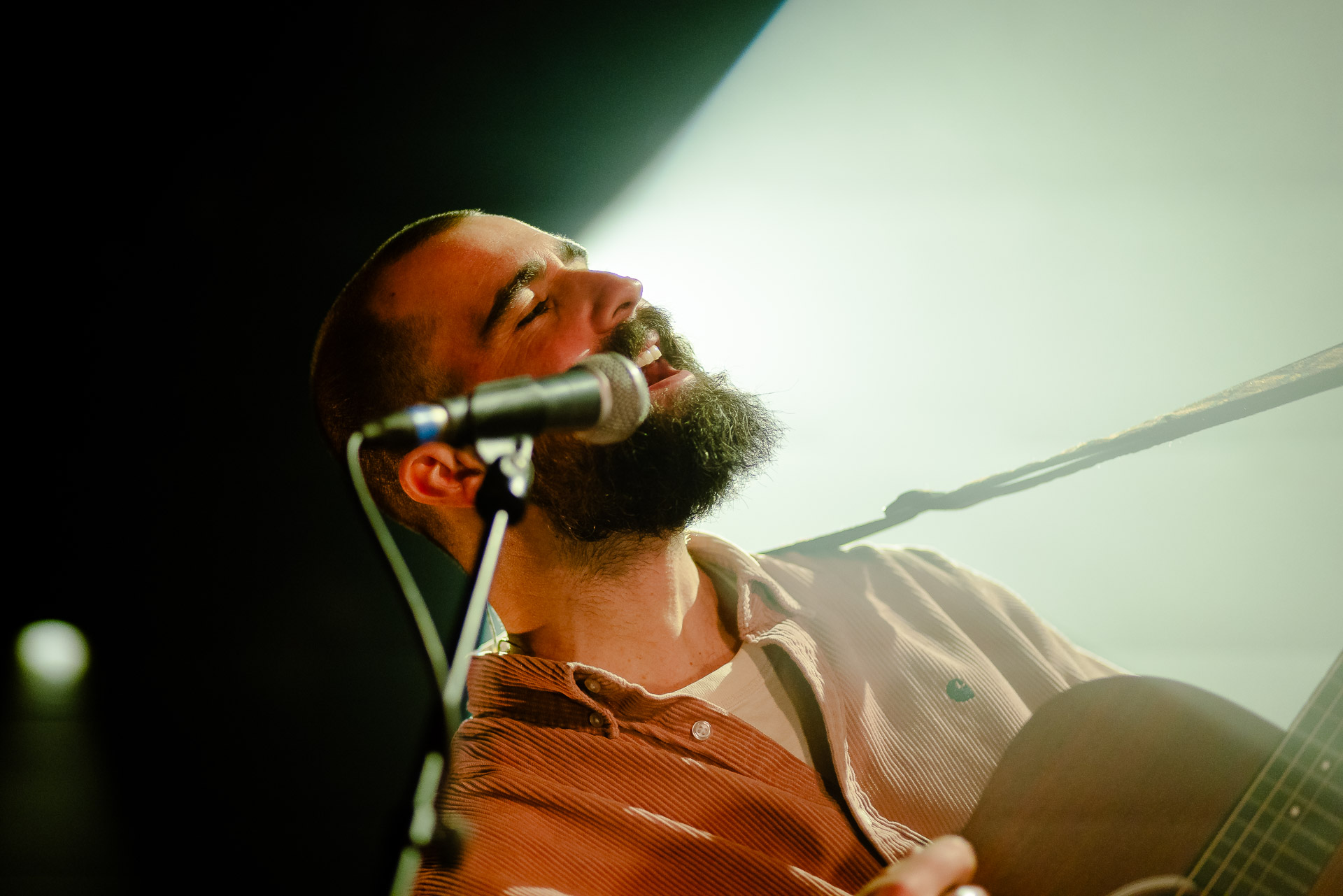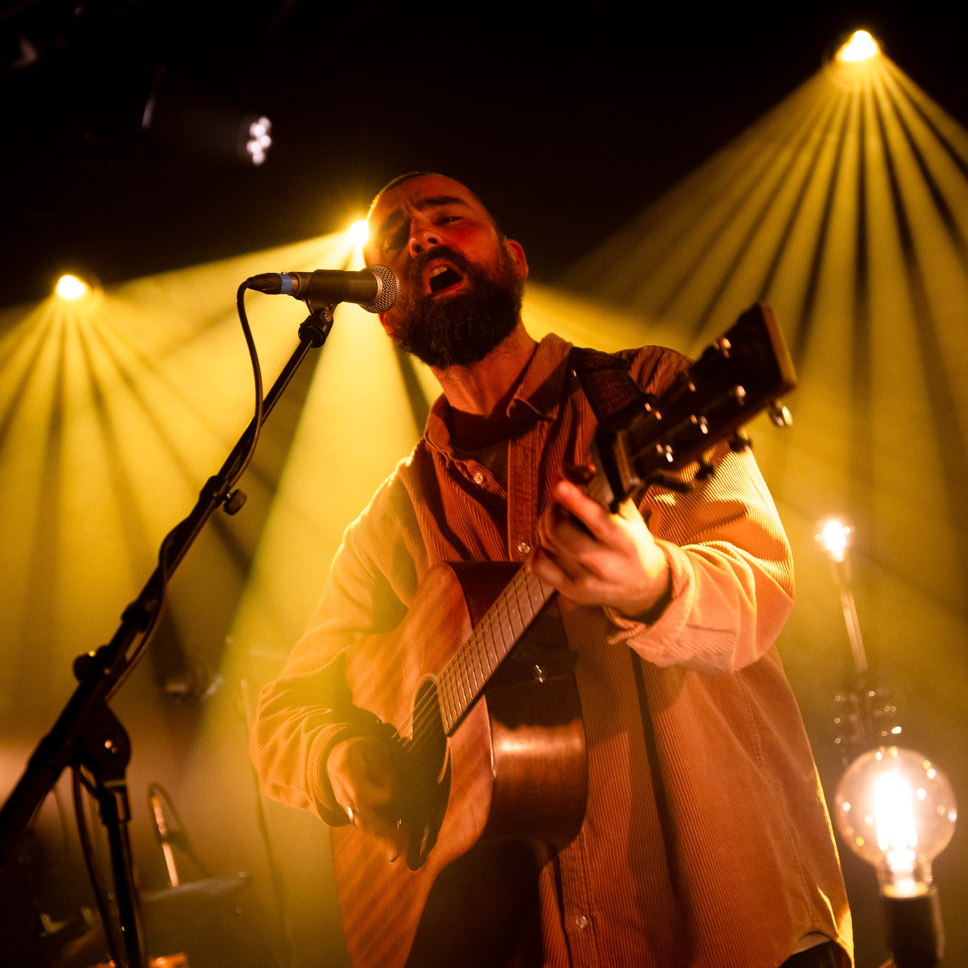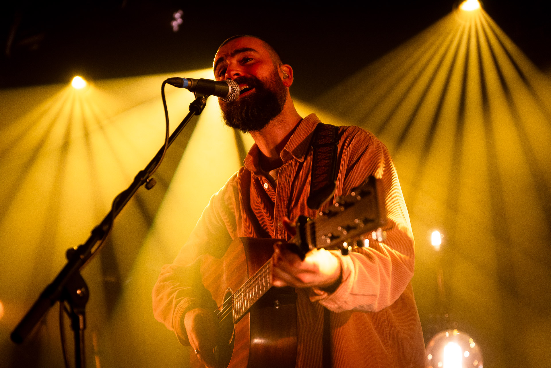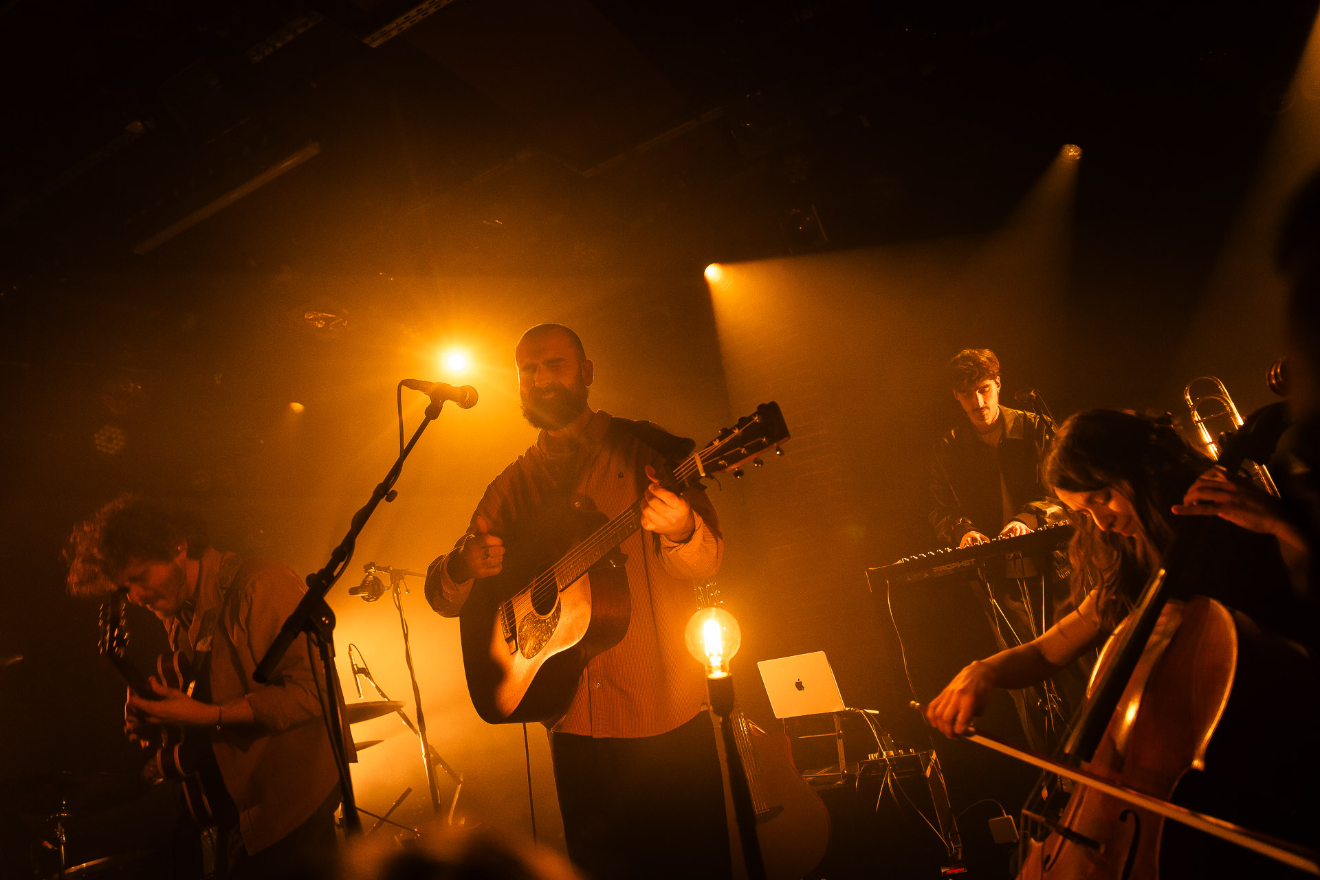 Ca commence avec la Maroquinerie dans le noir complet, et une simple ampoule qui vient éclairer progressivement la silhouette puis la barbe si reconnaissable de Hugo Barriol. Il débute ce concert seul avec sa guitare acoustique. Une entrée en matière intimiste qui laisse toute la place à la chaleur et l’émotion dans la voix de Hugo mais il est vite rejoint par ses musiciens : à la batterie et à la guitare on retrouve les complices habituels : Antoine Kerninon et Diego Lipnizky, plus un nouveau (pour nous en tout cas) aux cuivres et au clavier Ossian Macary. On sent que tout ce petit monde a l’habitude de jouer ensemble et le groupe apporte une surplus d’énergie, des couleurs supplémentaires qui font que si la musique reste folk, les ambiances et les intensités changent, avec des moments tout en retenu focalisées sur la voix et des parties instrumentales où tout le monde peut se lâcher un peu plus.