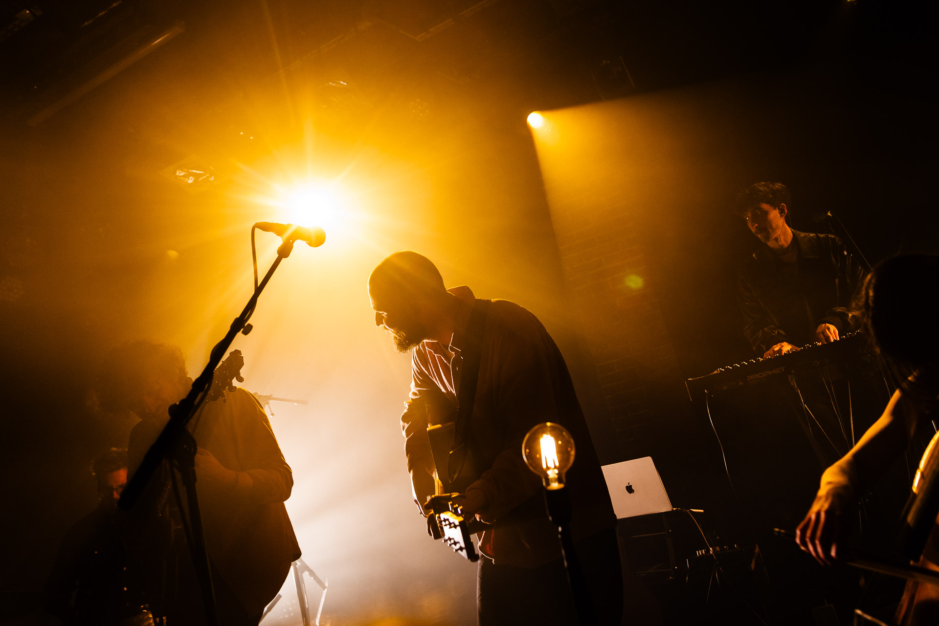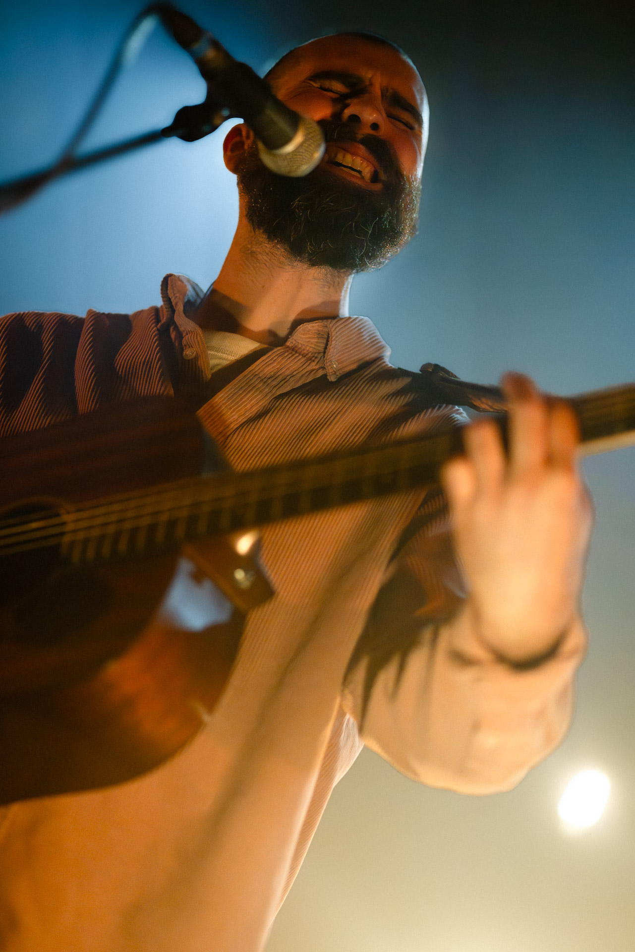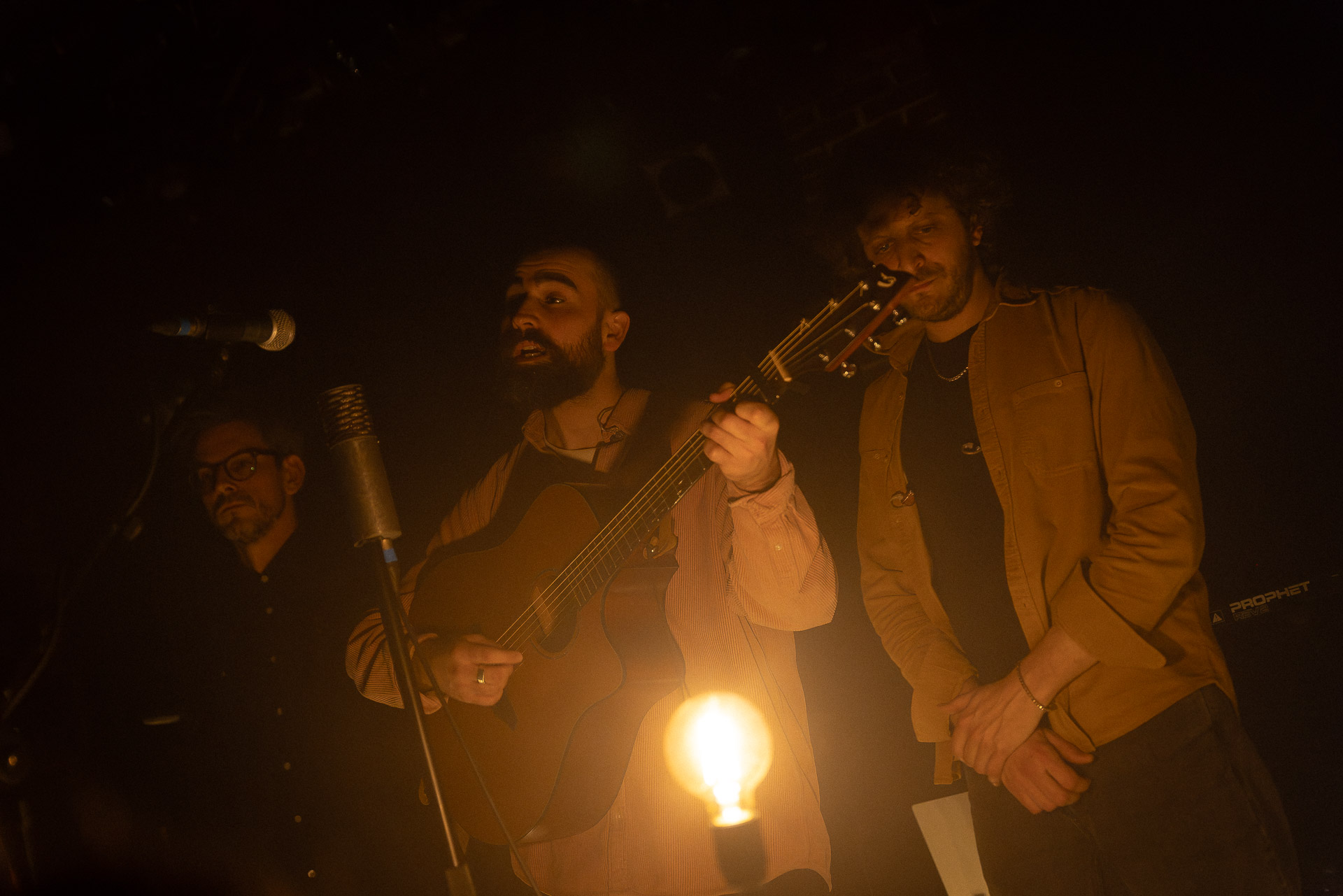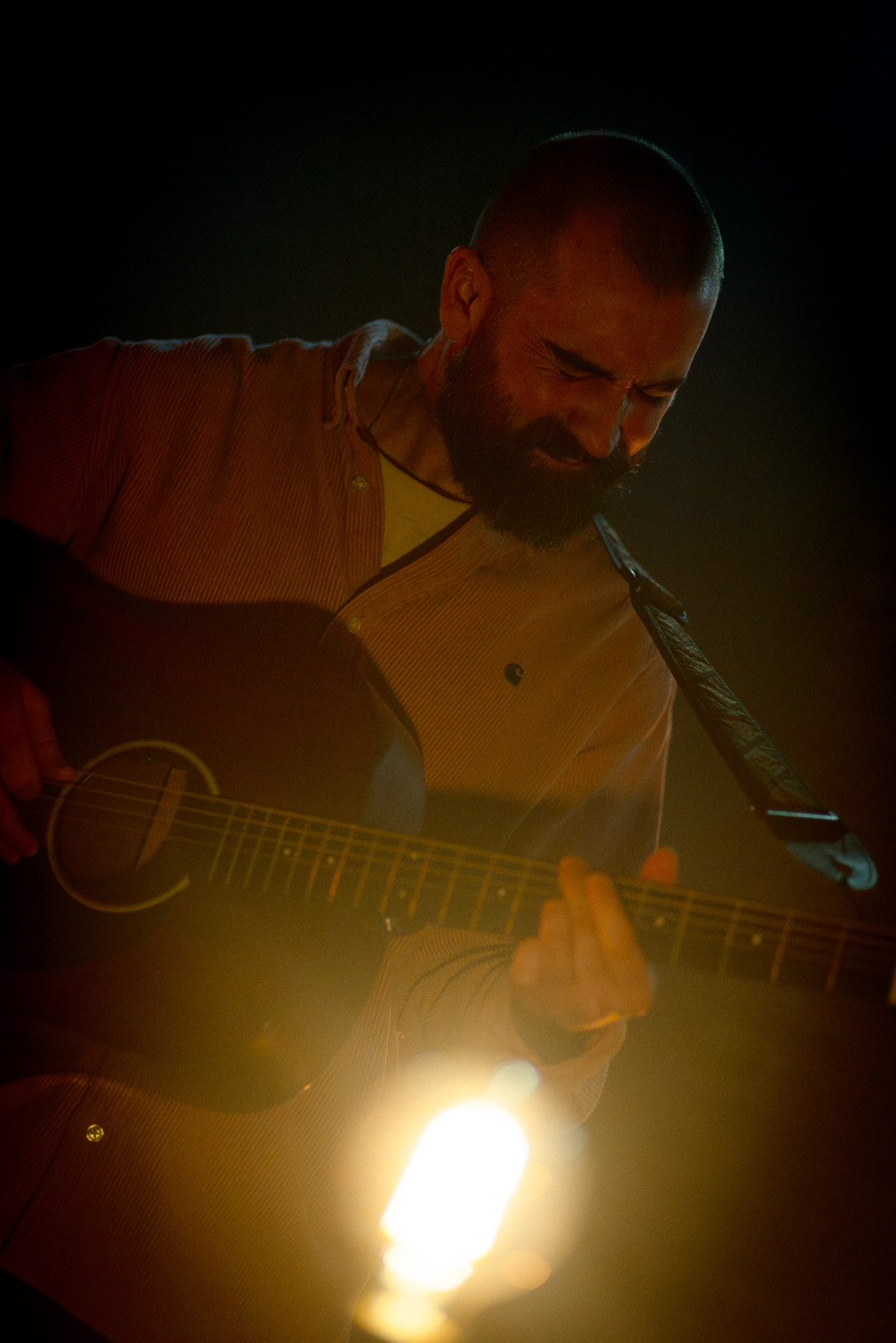 Ca commence avec la Maroquinerie dans le noir complet, et une simple ampoule qui vient éclairer progressivement la silhouette puis la barbe si reconnaissable de Hugo Barriol. Il débute ce concert seul avec sa guitare acoustique. Une entrée en matière intimiste qui laisse toute la place à la chaleur et l’émotion dans la voix de Hugo mais il est vite rejoint par ses musiciens : à la batterie et à la guitare on retrouve les complices habituels : Antoine Kerninon et Diego Lipnizky, plus un nouveau (pour nous en tout cas) aux cuivres et au clavier Ossian Macary. On sent que tout ce petit monde a l’habitude de jouer ensemble et le groupe apporte une surplus d’énergie, des couleurs supplémentaires qui font que si la musique reste folk, les ambiances et les intensités changent, avec des moments tout en retenu focalisées sur la voix et des parties instrumentales où tout le monde peut se lâcher un peu plus.