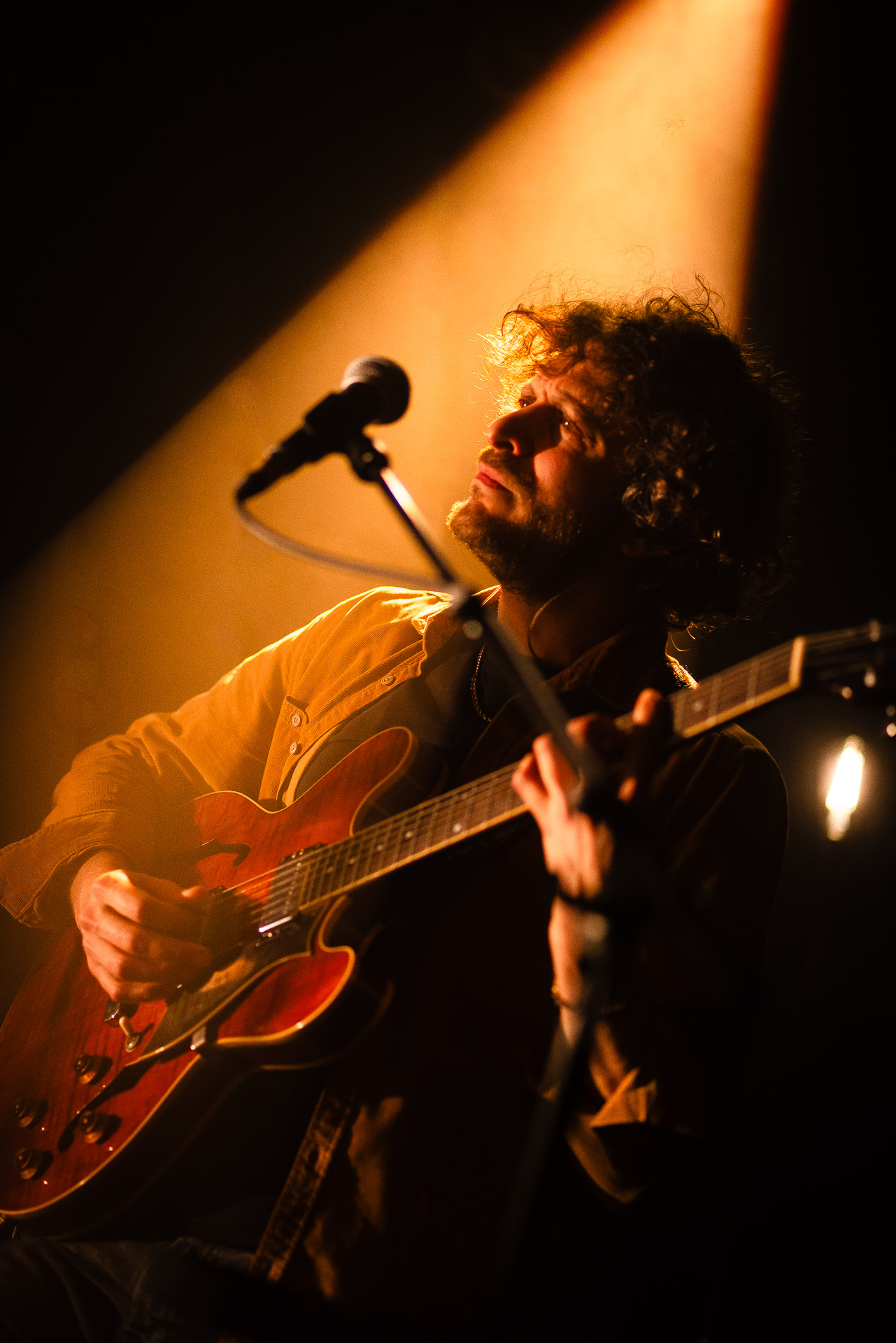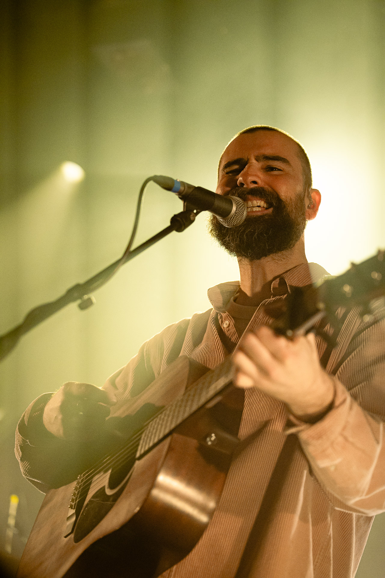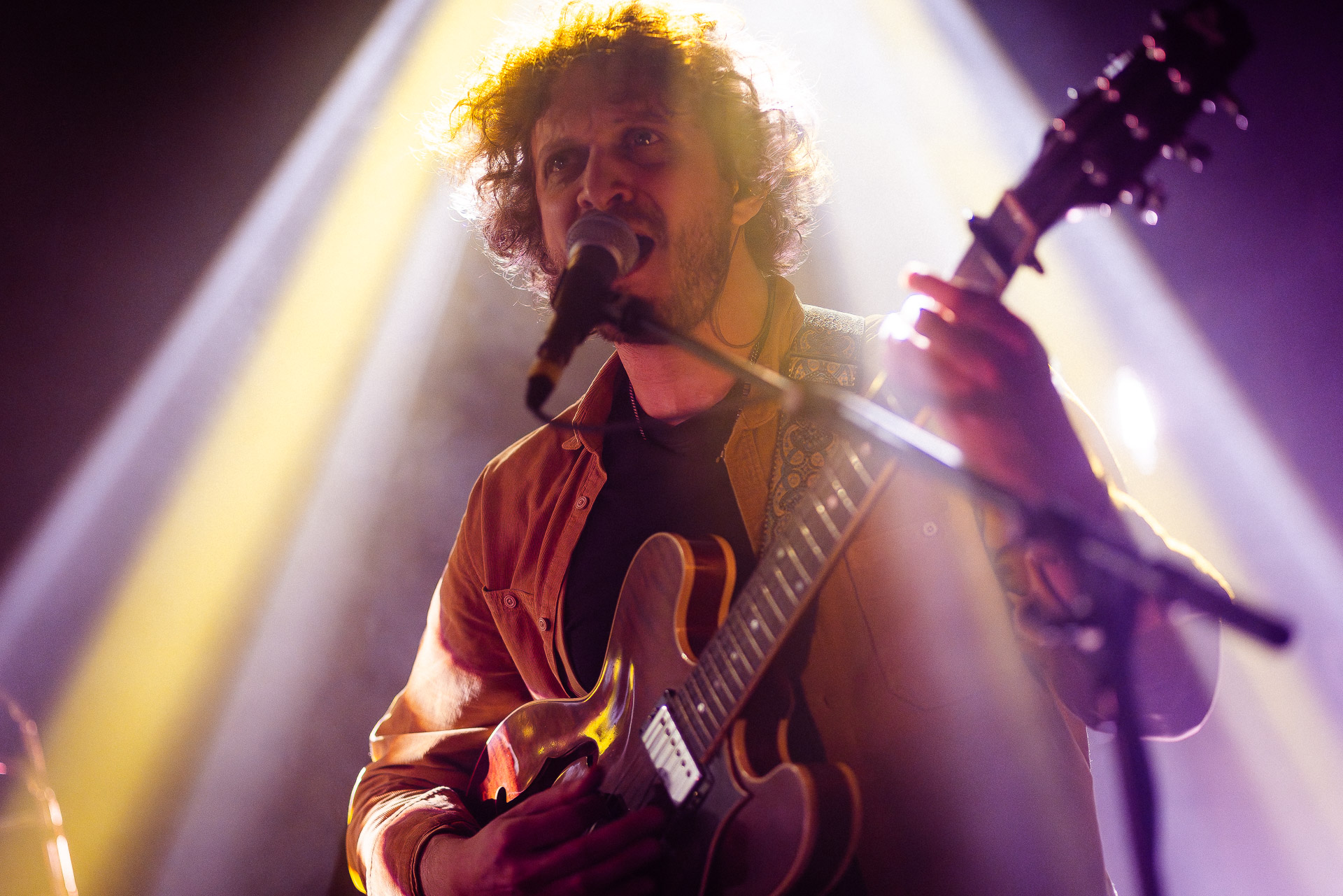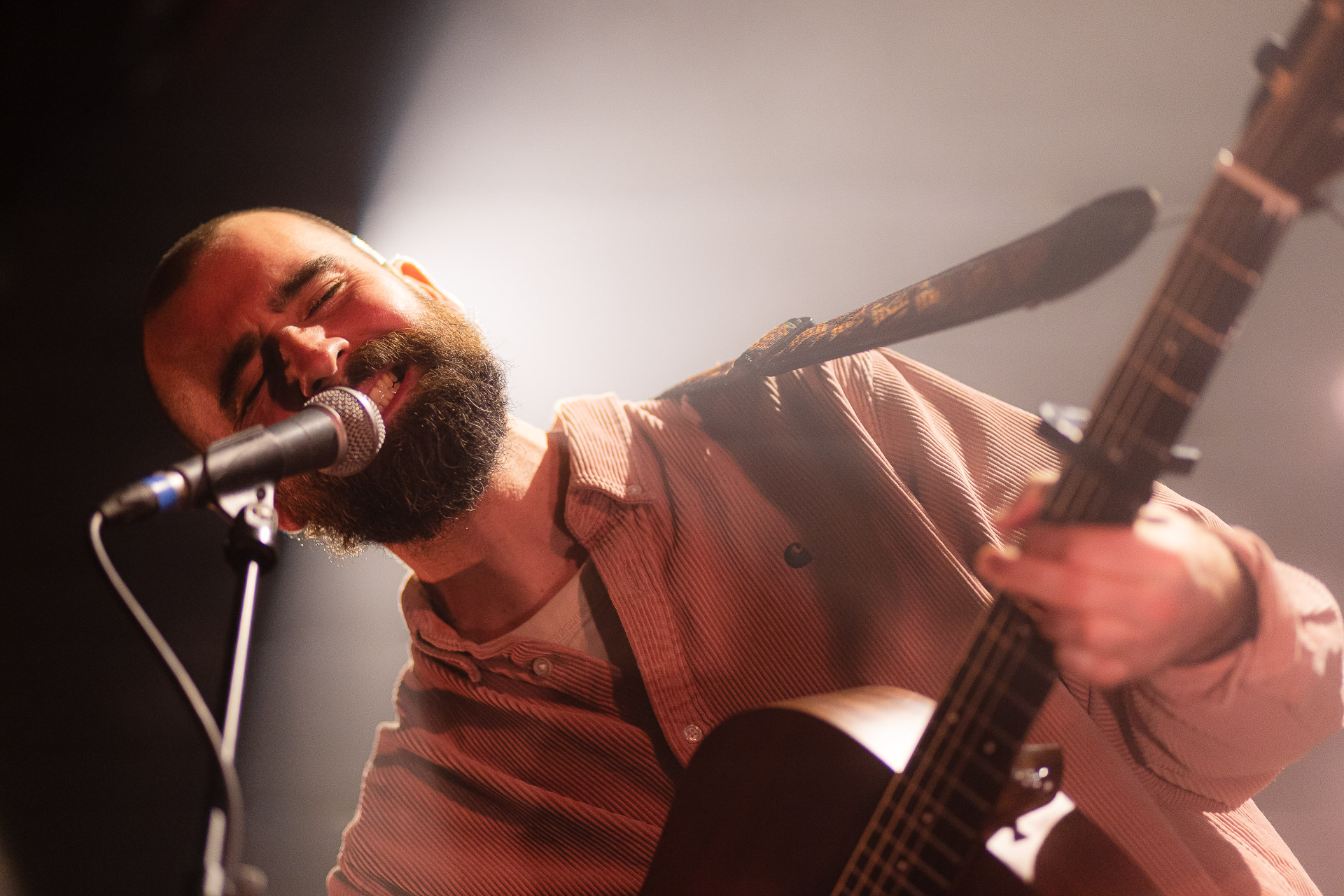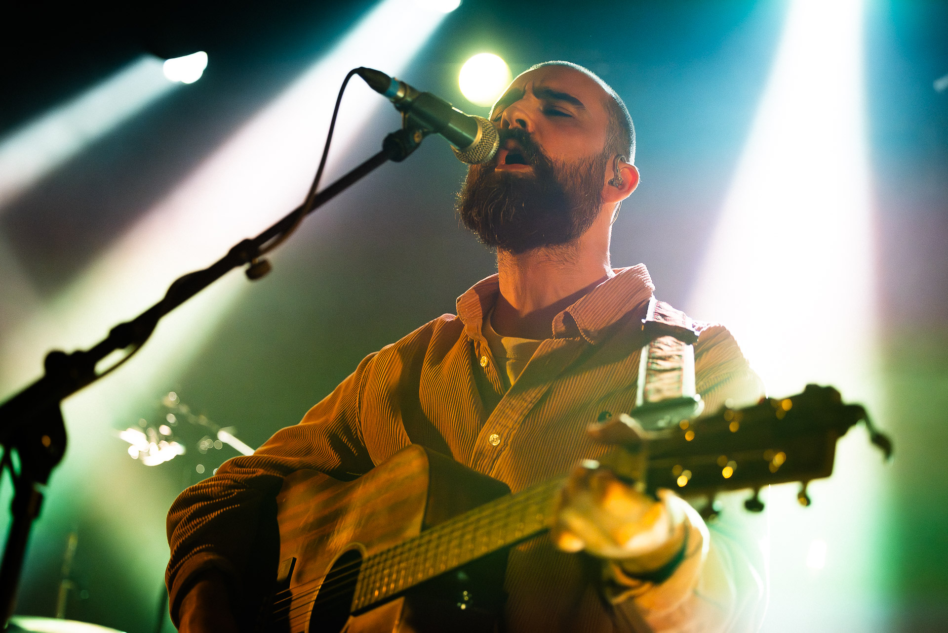 Ca commence avec la Maroquinerie dans le noir complet, et une simple ampoule qui vient éclairer progressivement la silhouette puis la barbe si reconnaissable de Hugo Barriol. Il débute ce concert seul avec sa guitare acoustique. Une entrée en matière intimiste qui laisse toute la place à la chaleur et l’émotion dans la voix de Hugo mais il est vite rejoint par ses musiciens : à la batterie et à la guitare on retrouve les complices habituels : Antoine Kerninon et Diego Lipnizky, plus un nouveau (pour nous en tout cas) aux cuivres et au clavier Ossian Macary. On sent que tout ce petit monde a l’habitude de jouer ensemble et le groupe apporte une surplus d’énergie, des couleurs supplémentaires qui font que si la musique reste folk, les ambiances et les intensités changent, avec des moments tout en retenu focalisées sur la voix et des parties instrumentales où tout le monde peut se lâcher un peu plus.