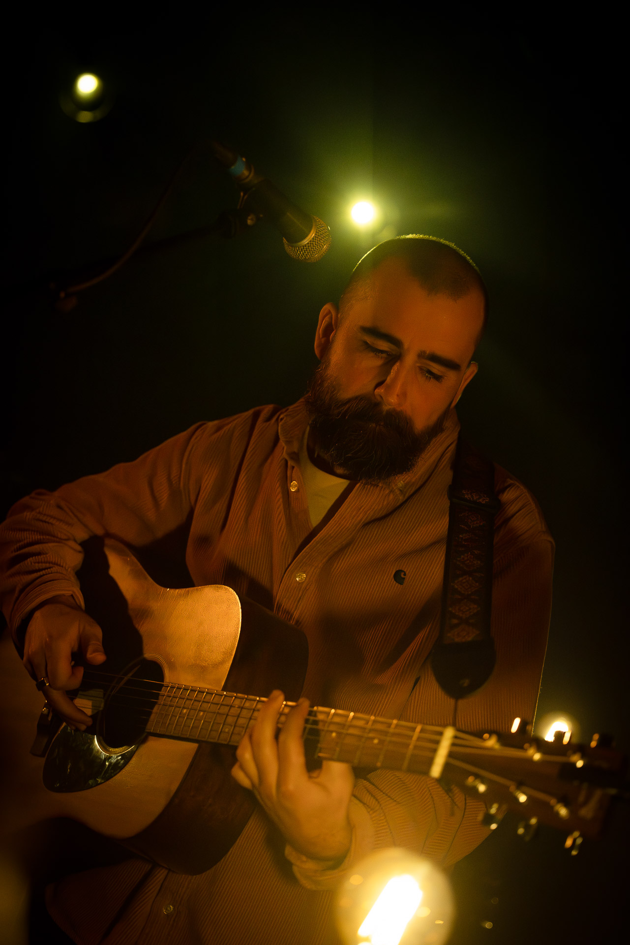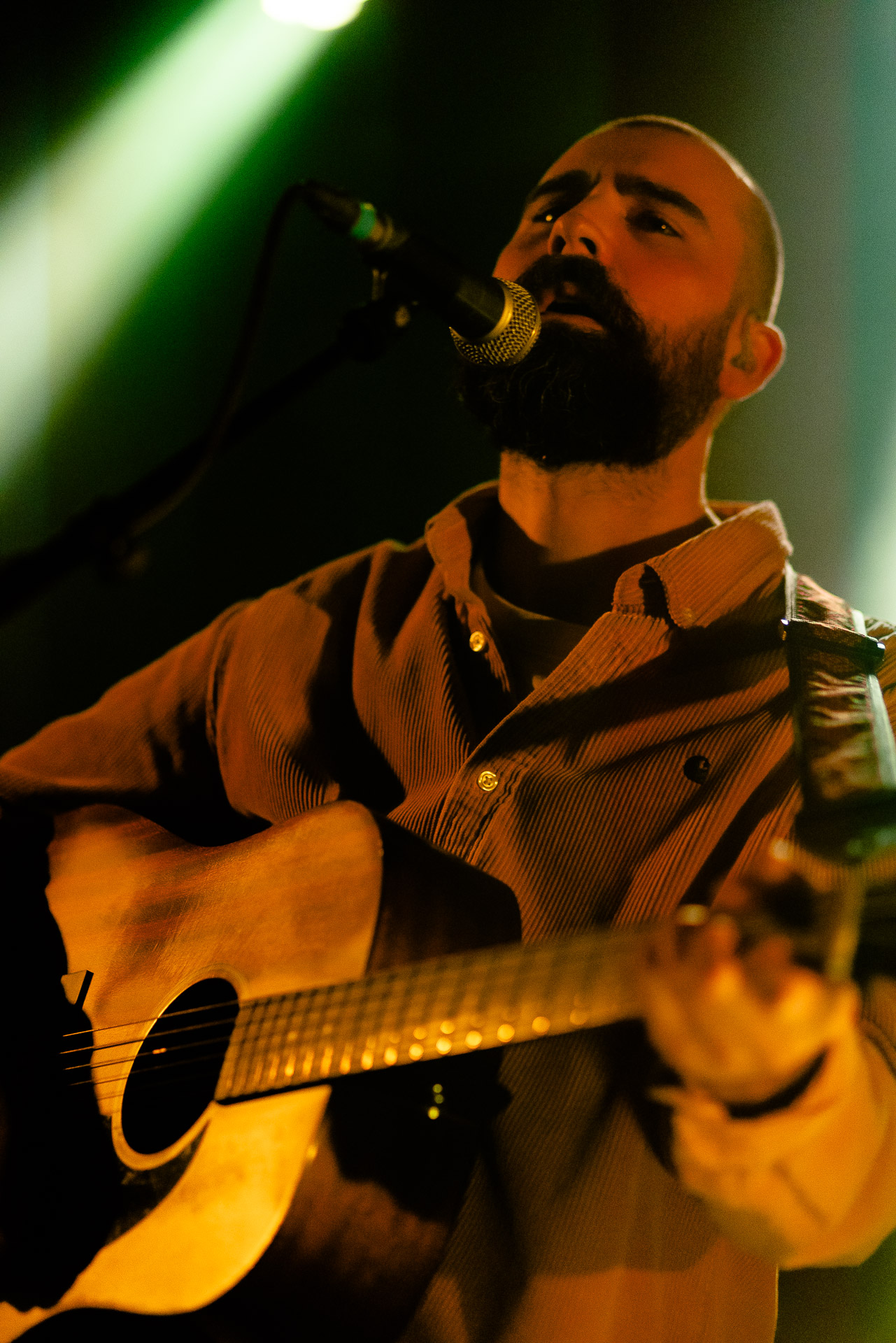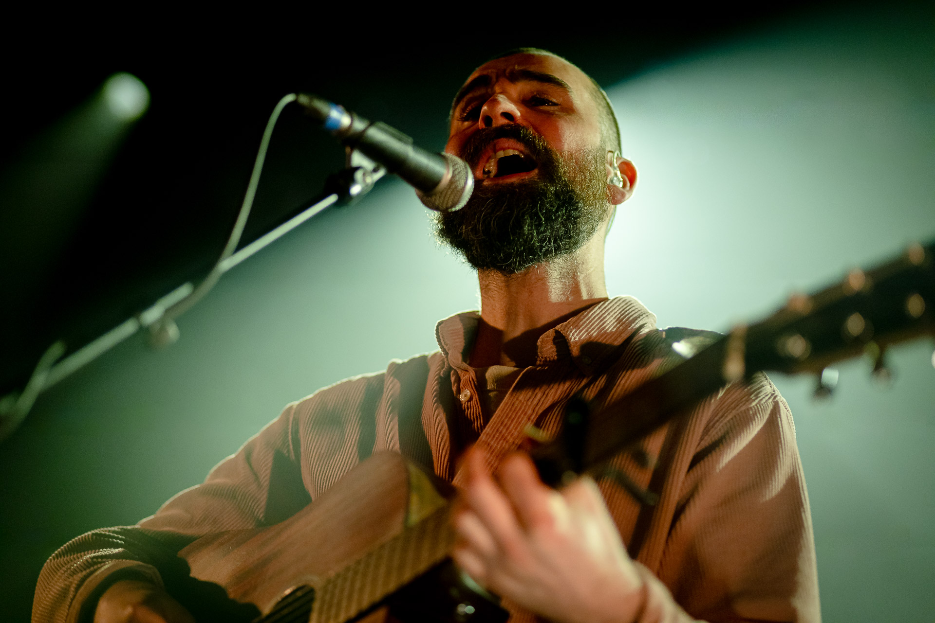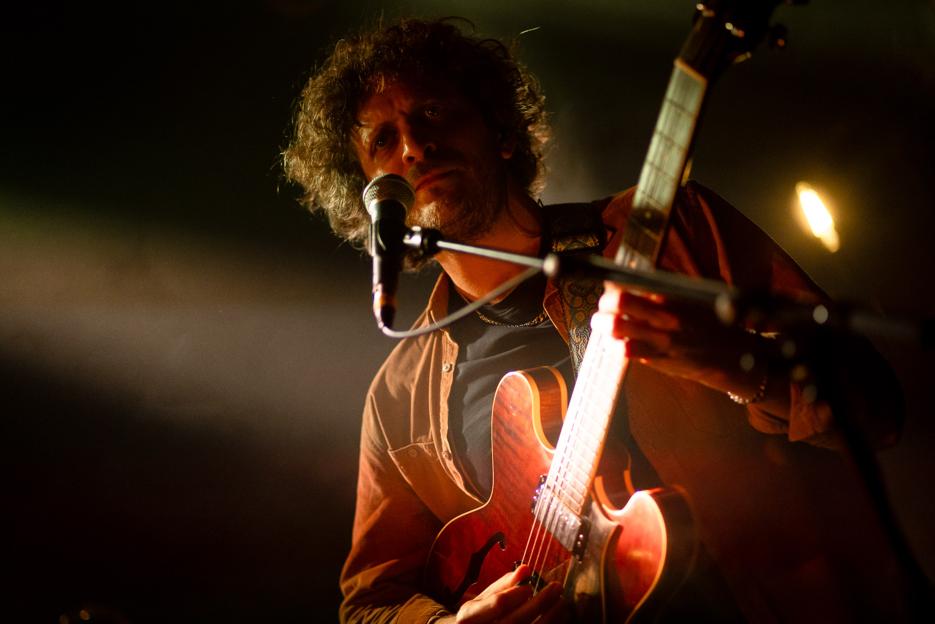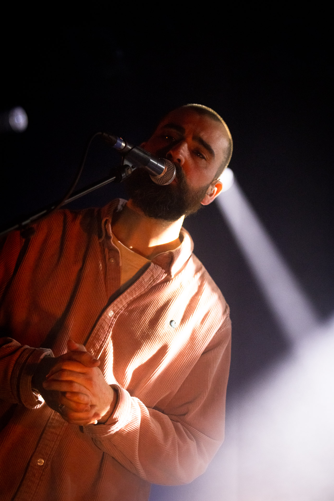 Ca commence avec la Maroquinerie dans le noir complet, et une simple ampoule qui vient éclairer progressivement la silhouette puis la barbe si reconnaissable de Hugo Barriol. Il débute ce concert seul avec sa guitare acoustique. Une entrée en matière intimiste qui laisse toute la place à la chaleur et l’émotion dans la voix de Hugo mais il est vite rejoint par ses musiciens : à la batterie et à la guitare on retrouve les complices habituels : Antoine Kerninon et Diego Lipnizky, plus un nouveau (pour nous en tout cas) aux cuivres et au clavier Ossian Macary. On sent que tout ce petit monde a l’habitude de jouer ensemble et le groupe apporte une surplus d’énergie, des couleurs supplémentaires qui font que si la musique reste folk, les ambiances et les intensités changent, avec des moments tout en retenu focalisées sur la voix et des parties instrumentales où tout le monde peut se lâcher un peu plus.