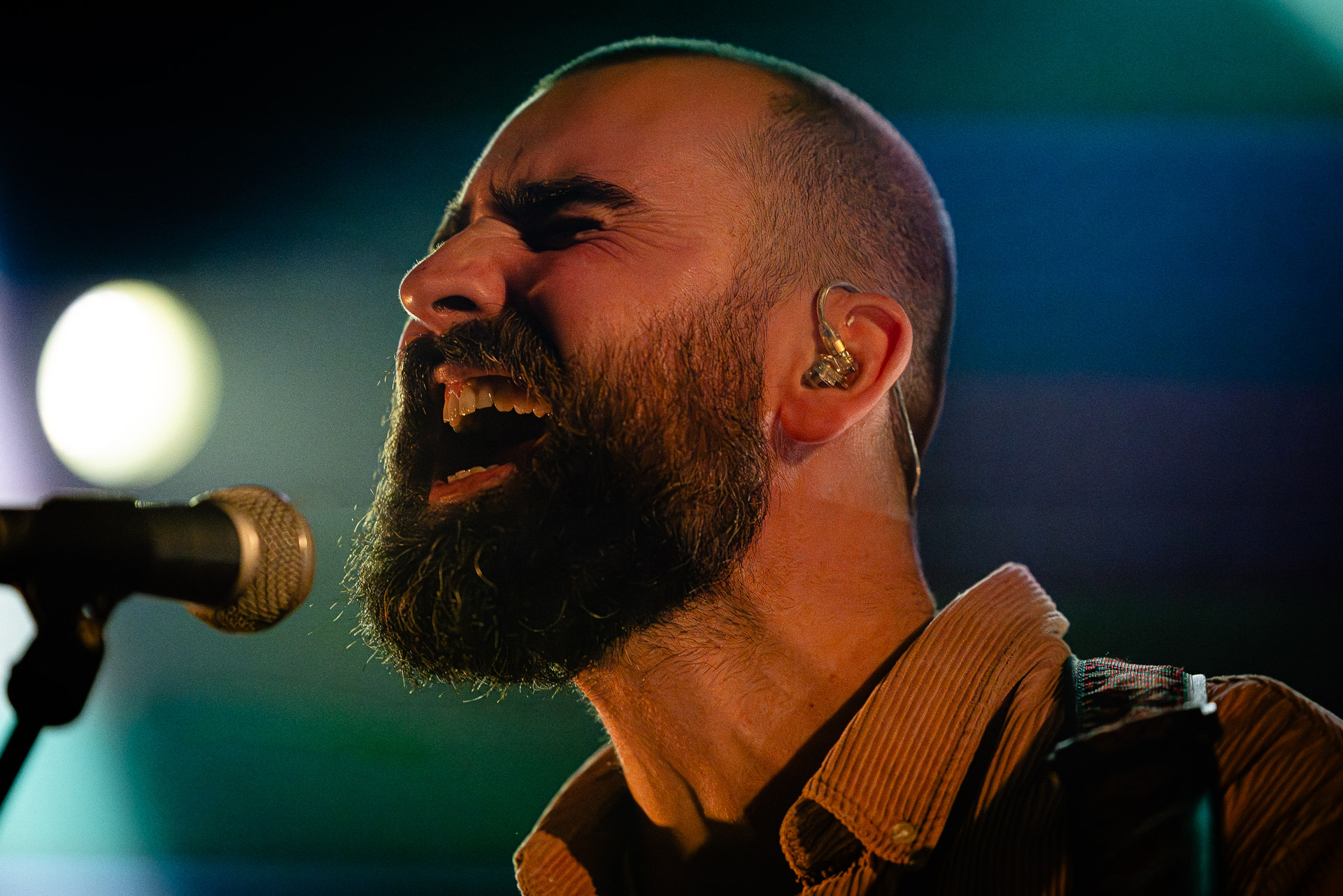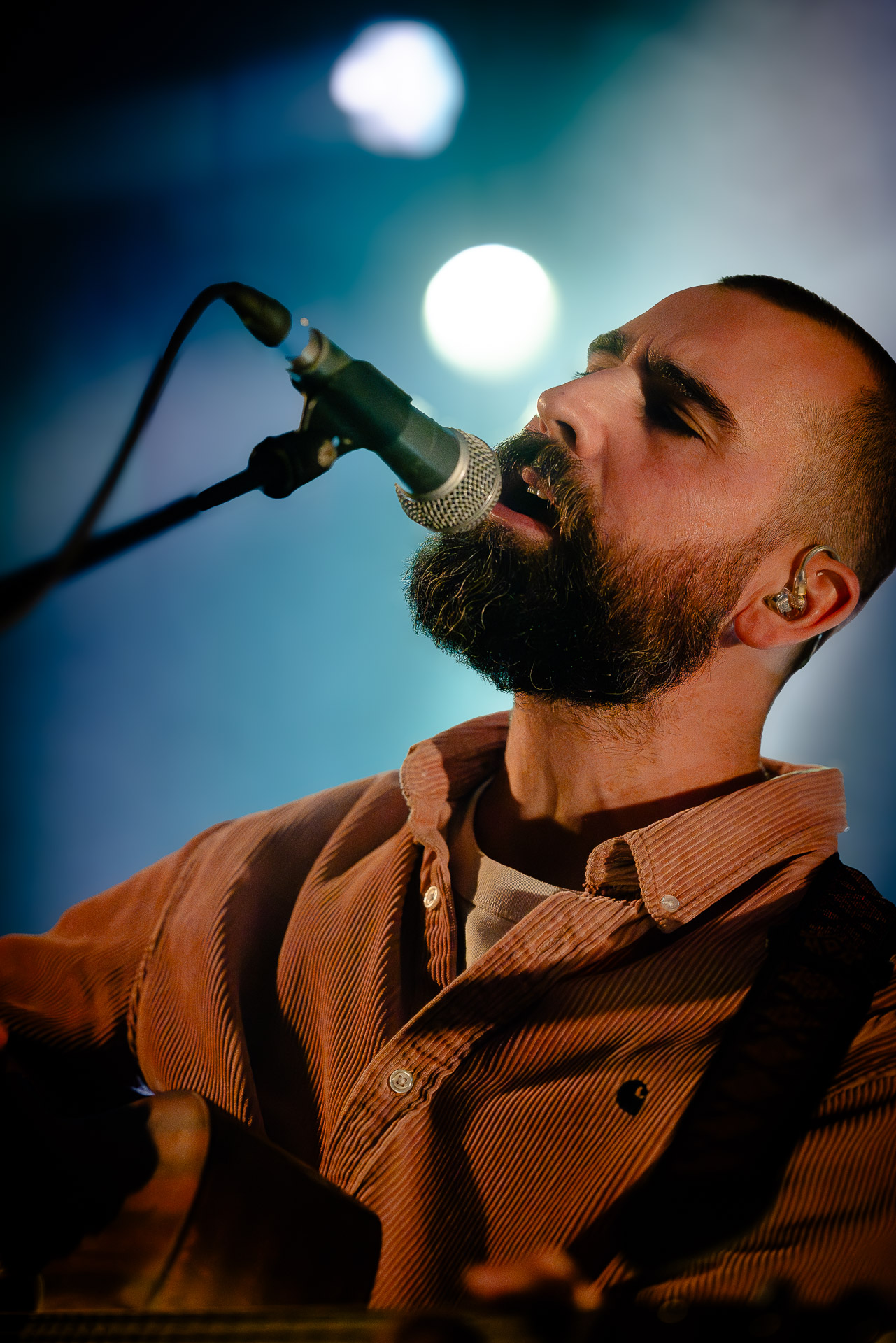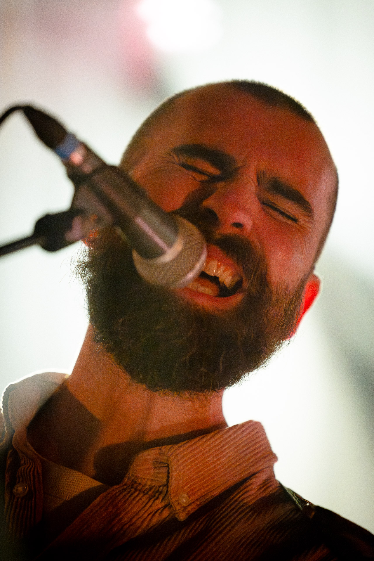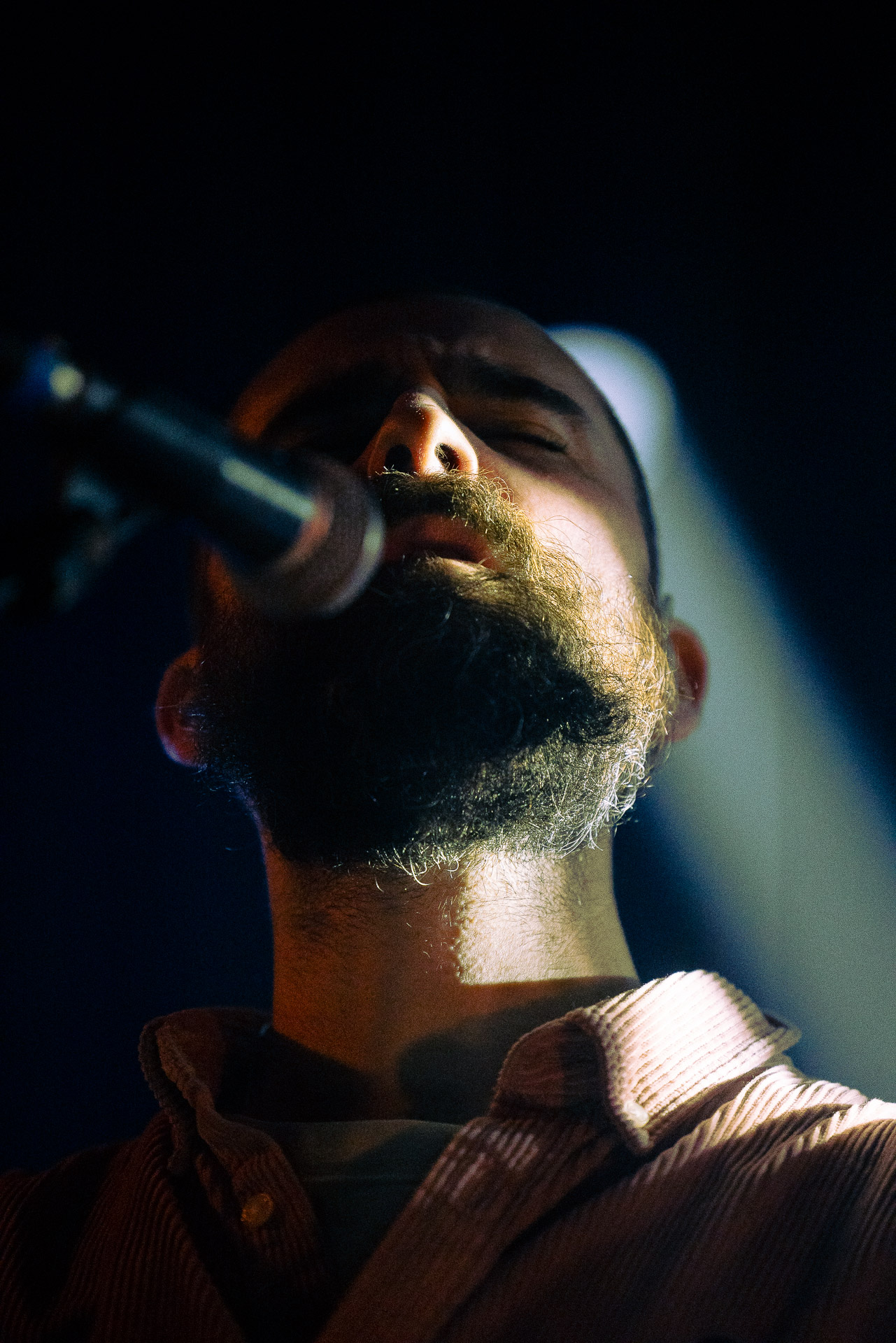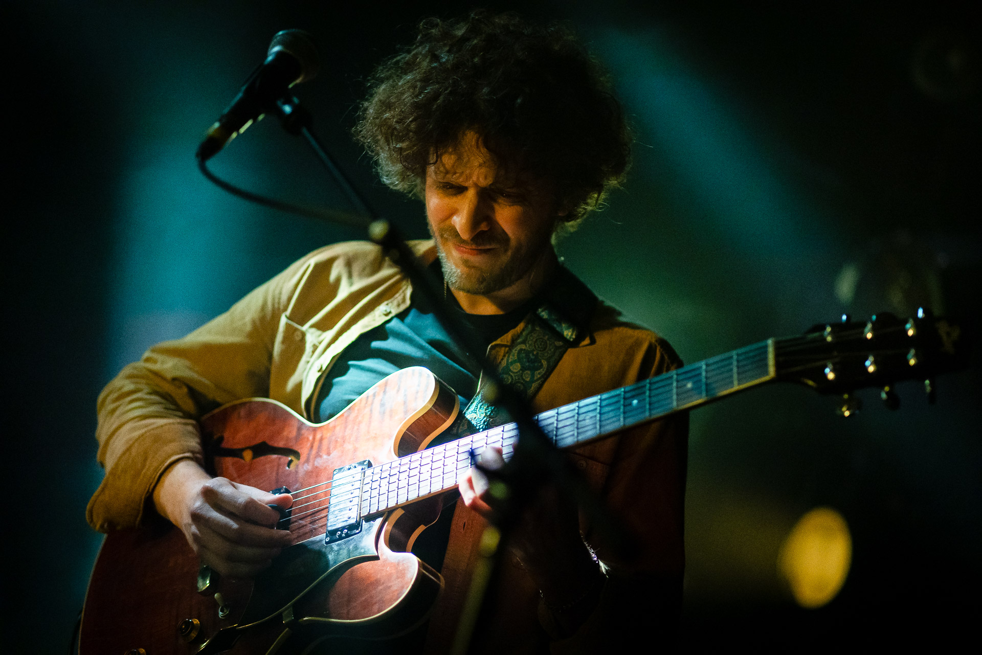 Ca commence avec la Maroquinerie dans le noir complet, et une simple ampoule qui vient éclairer progressivement la silhouette puis la barbe si reconnaissable de Hugo Barriol. Il débute ce concert seul avec sa guitare acoustique. Une entrée en matière intimiste qui laisse toute la place à la chaleur et l’émotion dans la voix de Hugo mais il est vite rejoint par ses musiciens : à la batterie et à la guitare on retrouve les complices habituels : Antoine Kerninon et Diego Lipnizky, plus un nouveau (pour nous en tout cas) aux cuivres et au clavier Ossian Macary. On sent que tout ce petit monde a l’habitude de jouer ensemble et le groupe apporte une surplus d’énergie, des couleurs supplémentaires qui font que si la musique reste folk, les ambiances et les intensités changent, avec des moments tout en retenu focalisées sur la voix et des parties instrumentales où tout le monde peut se lâcher un peu plus.