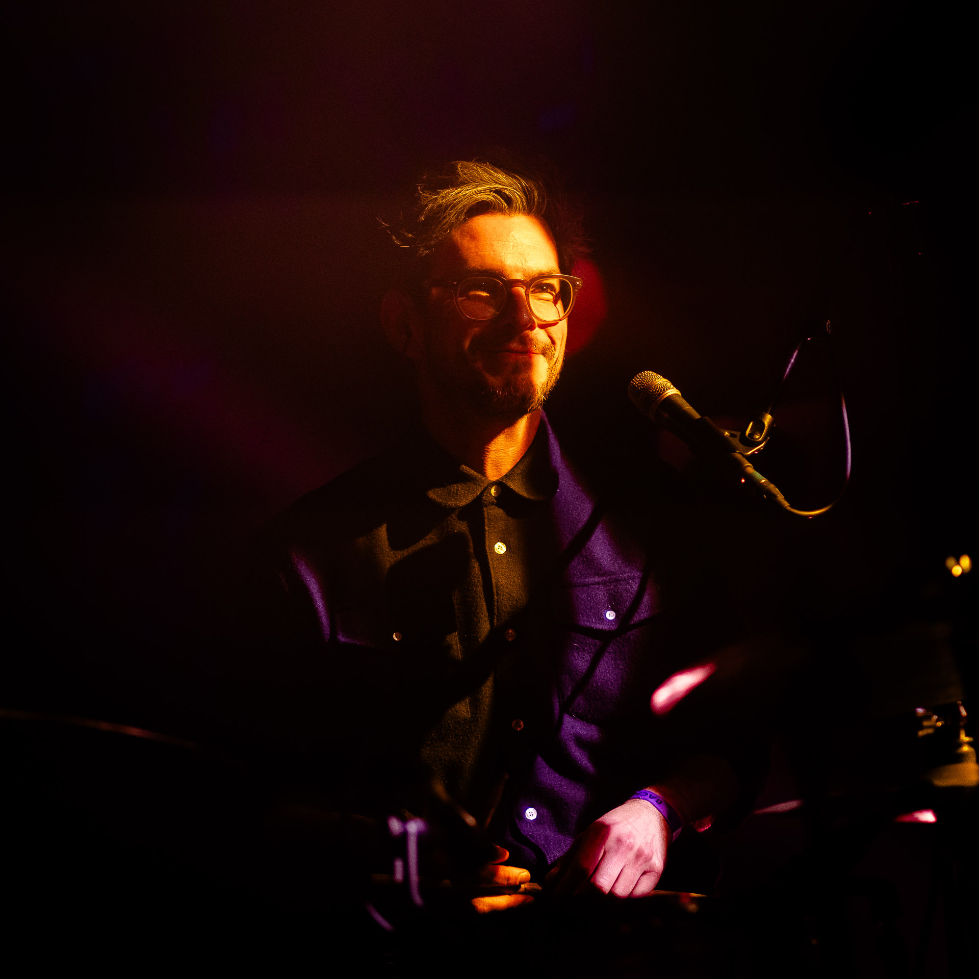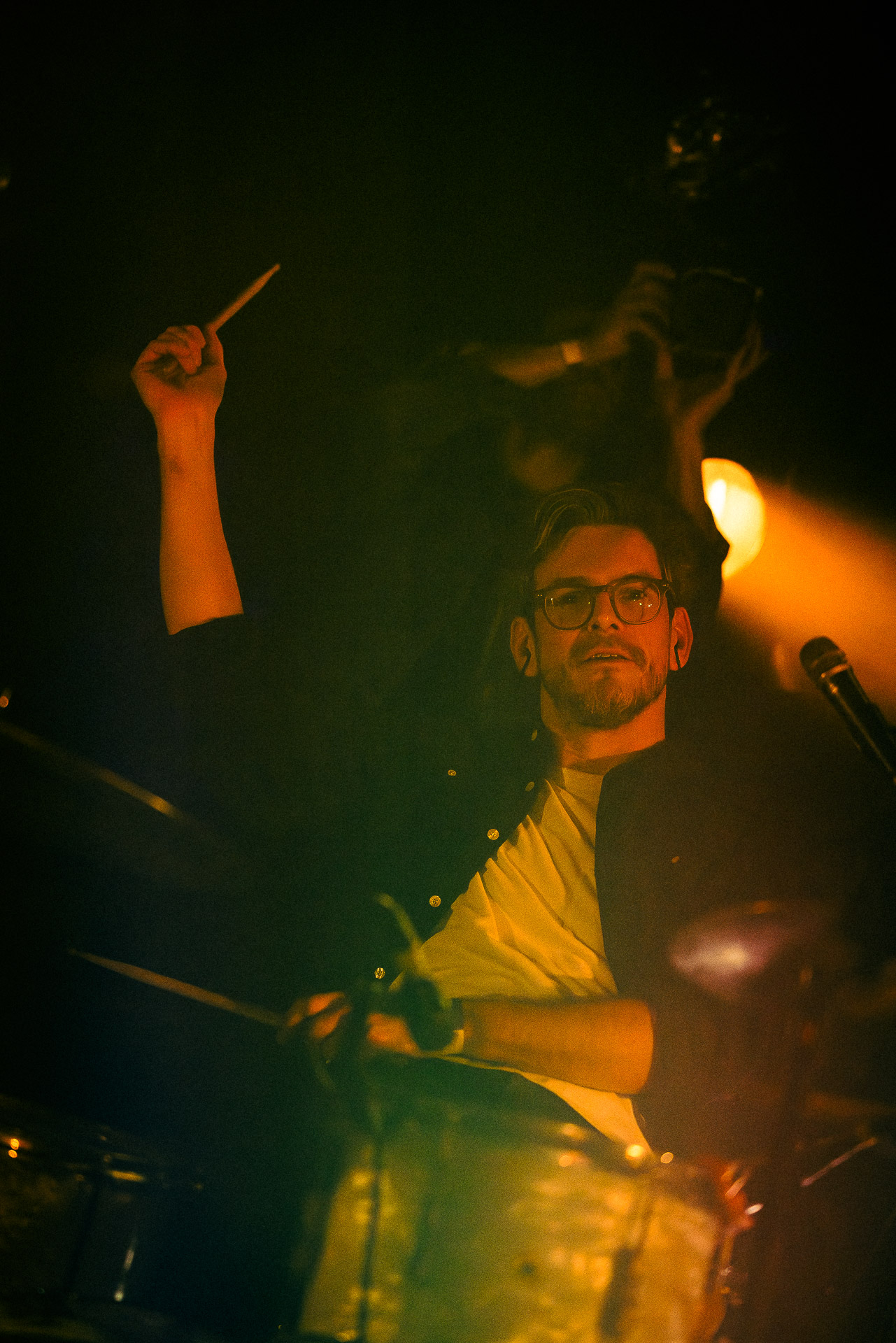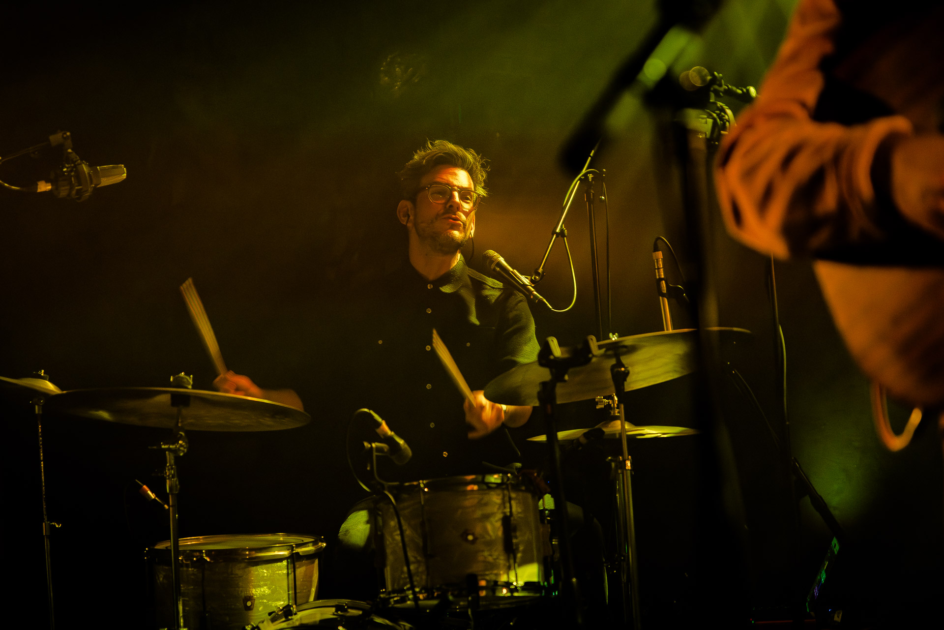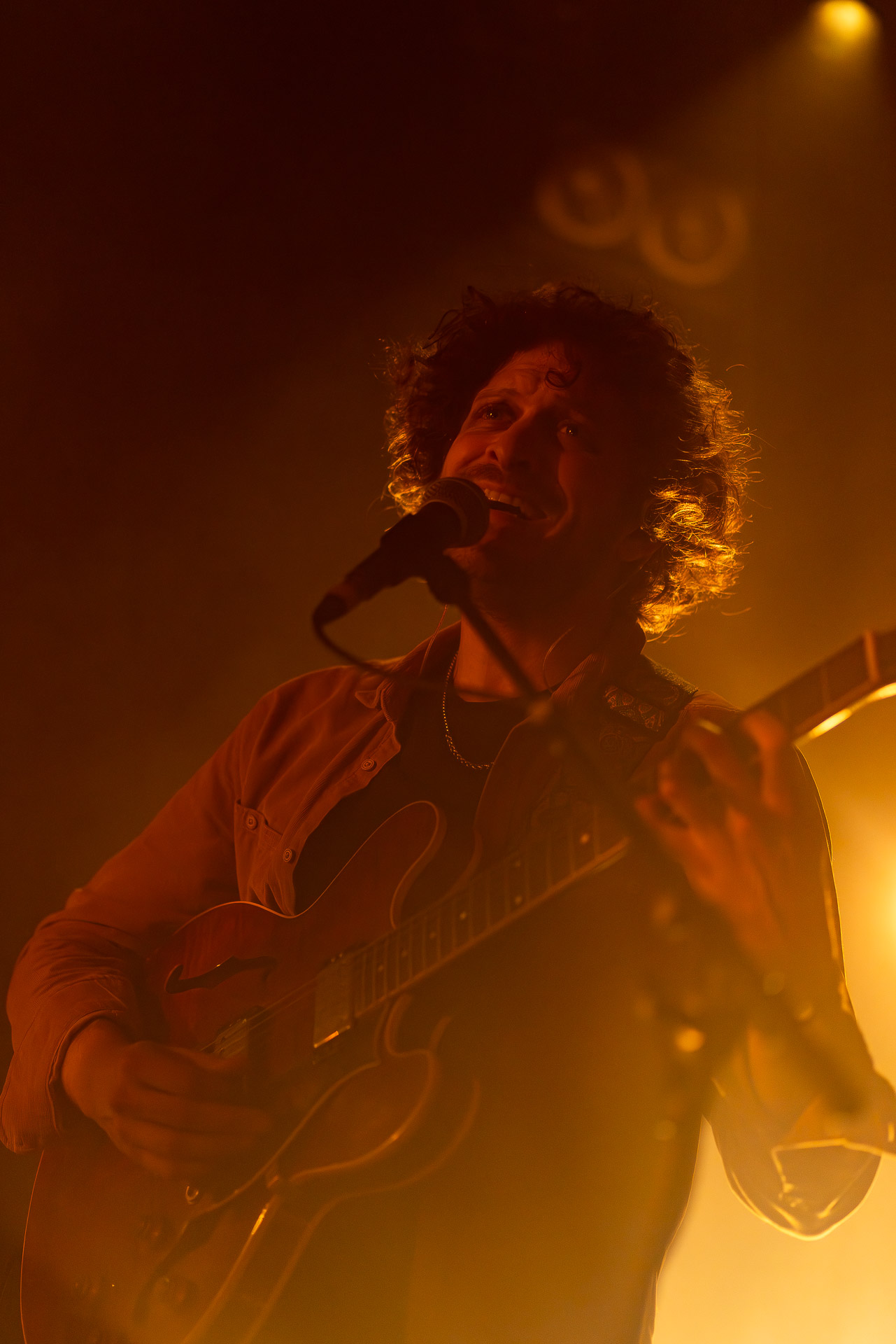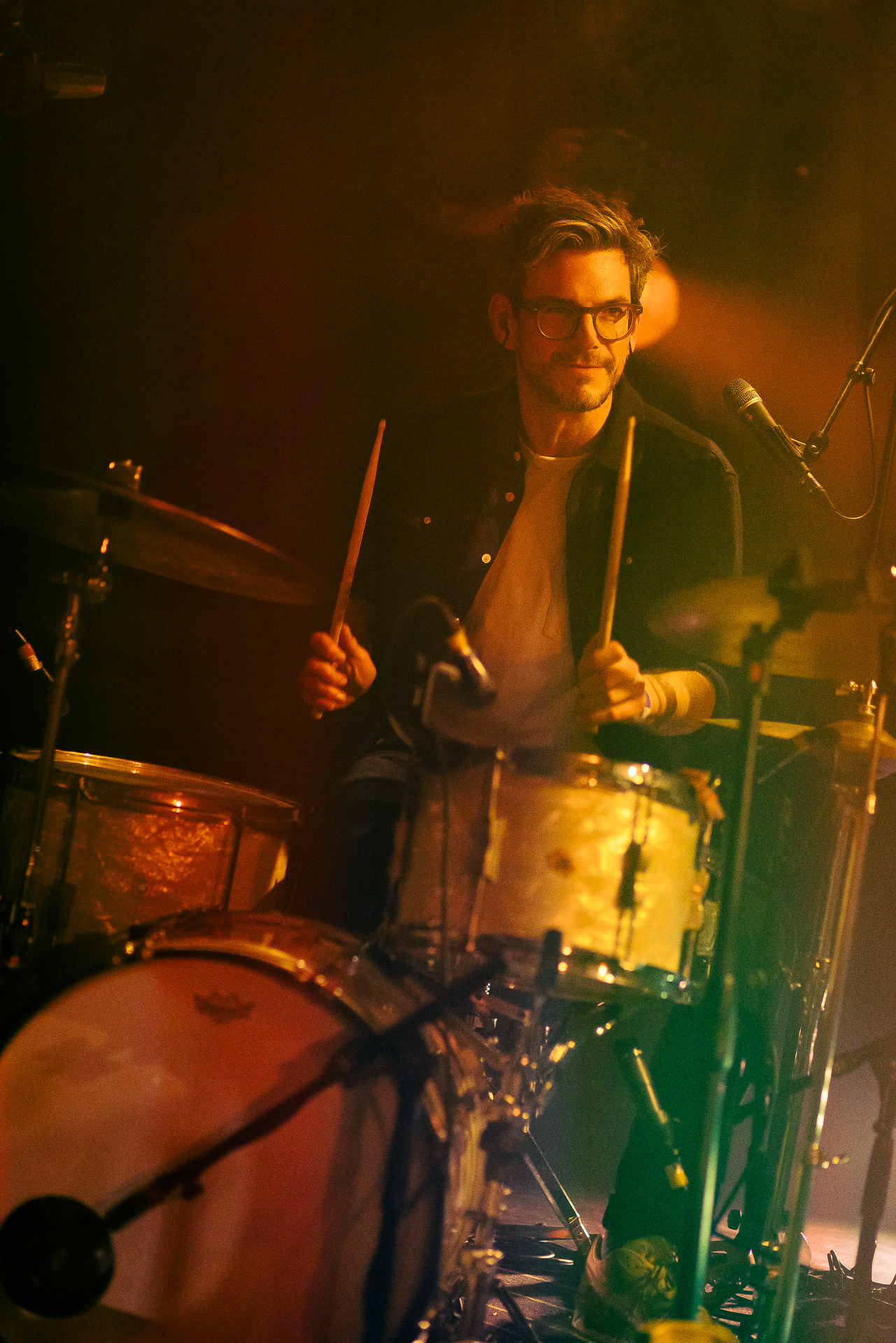 Avec bientôt une décennie de disques (deux albums, trois EPs et pas mal de titres en "single"), Hugo a largement de quoi construire une setlist qui revisite un peu tout son parcours depuis Yelllow sorti en 2019 avec les tubesques "Oh My", "Forgiveness", en passant par Everywhere/Anywhere avec "High Hopes", "Long way from Home" ou encore "Je Pars avec toi", jusqu’à l’EP "As it is" sorti cette année. une bonne partie du show est jouée "full band", avec la batterie et la guitare électrique mais Hugo a aussi prévu un petit clin d’œil à ses débuts en solo avec une pause "unplugged", où les musiciens sont réunis autour de la guitare de Hugo et d’un unique micro, à peine éclairés par les quelques ampoules autour de la scène. Ils jouent "Always", autre titre marquant du premier album dont on se rappelle qu’ils étaient descendu le jouer dansla fosse du café de la Danse il y a quelques années
