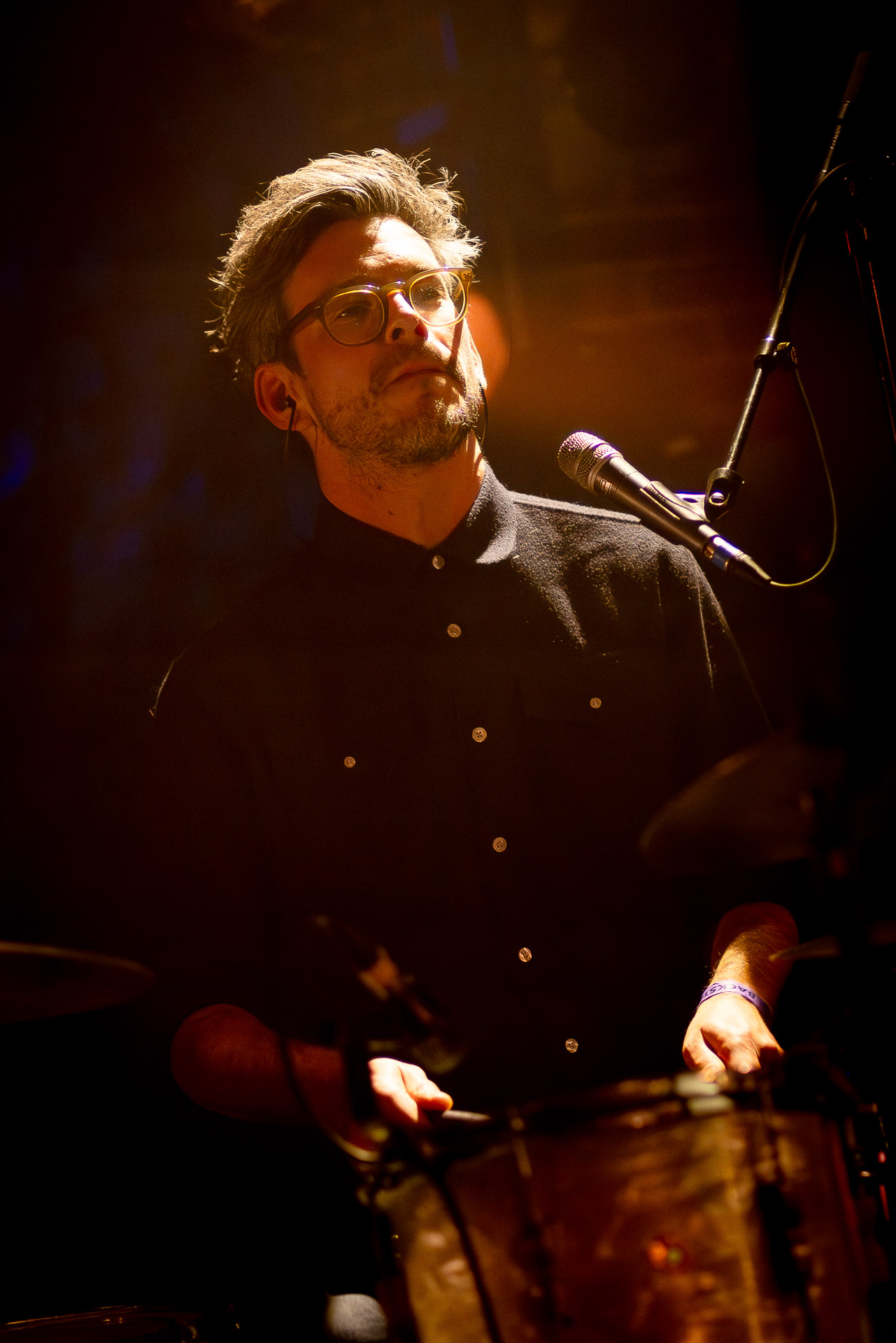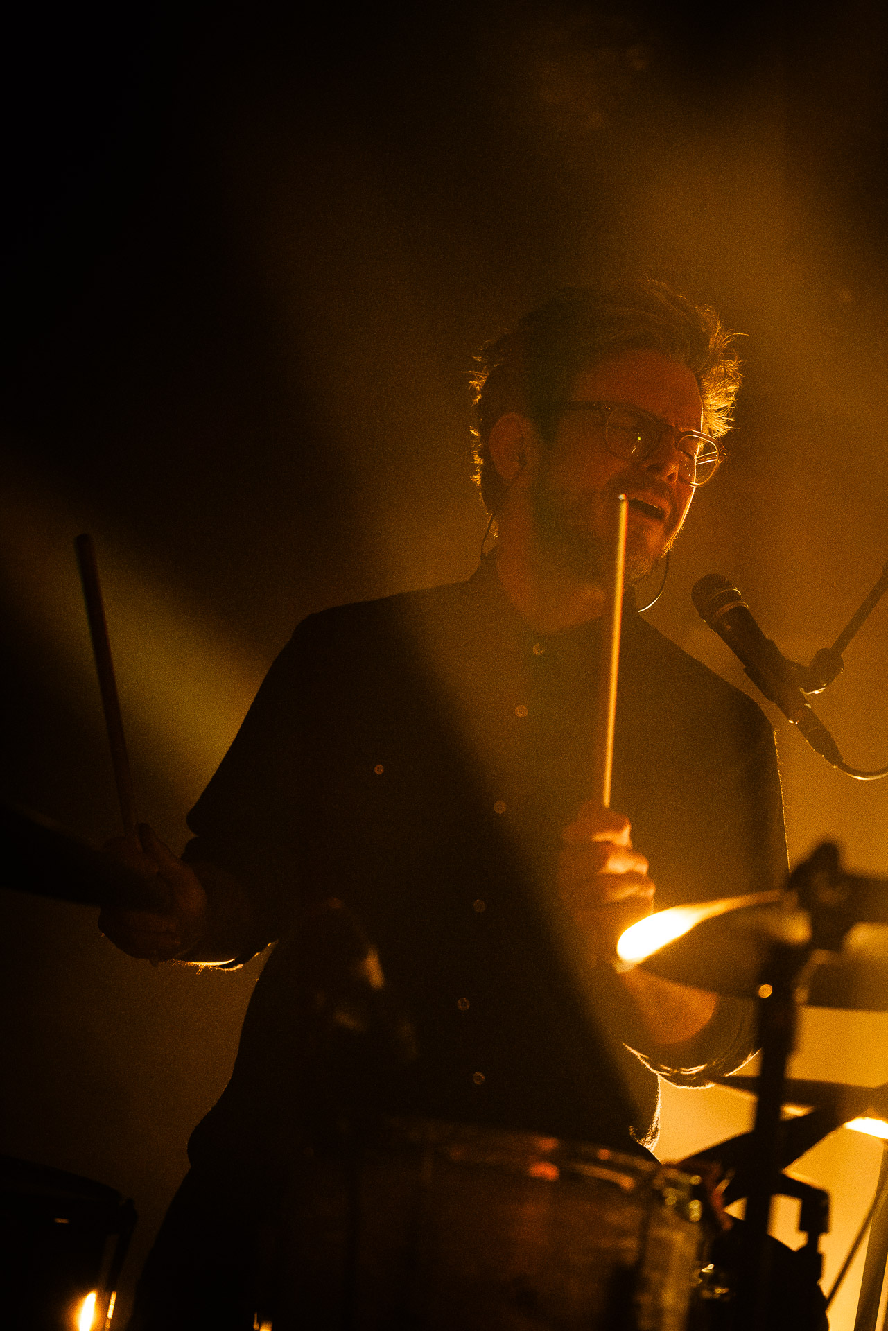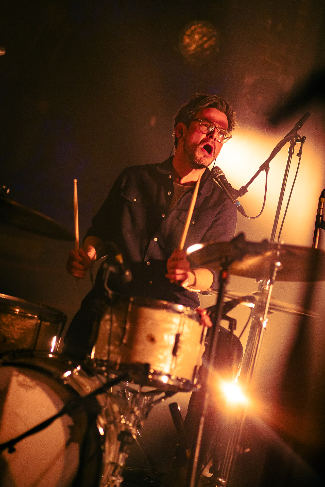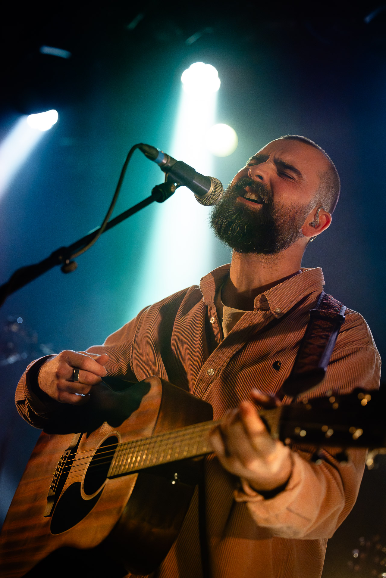 Avec bientôt une décennie de disques (deux albums, trois EPs et pas mal de titres en "single"), Hugo a largement de quoi construire une setlist qui revisite un peu tout son parcours depuis Yelllow sorti en 2019 avec les tubesques "Oh My", "Forgiveness", en passant par Everywhere/Anywhere avec "High Hopes", "Long way from Home" ou encore "Je Pars avec toi", jusqu’à l’EP "As it is" sorti cette année. une bonne partie du show est jouée "full band", avec la batterie et la guitare électrique mais Hugo a aussi prévu un petit clin d’œil à ses débuts en solo avec une pause "unplugged", où les musiciens sont réunis autour de la guitare de Hugo et d’un unique micro, à peine éclairés par les quelques ampoules autour de la scène. Ils jouent "Always", autre titre marquant du premier album dont on se rappelle qu’ils étaient descendu le jouer dansla fosse du café de la Danse il y a quelques années