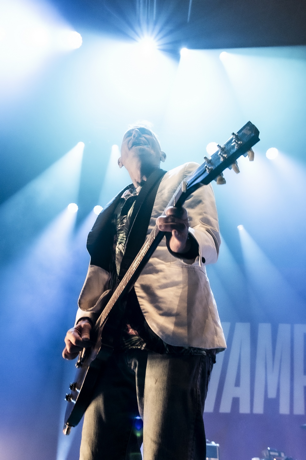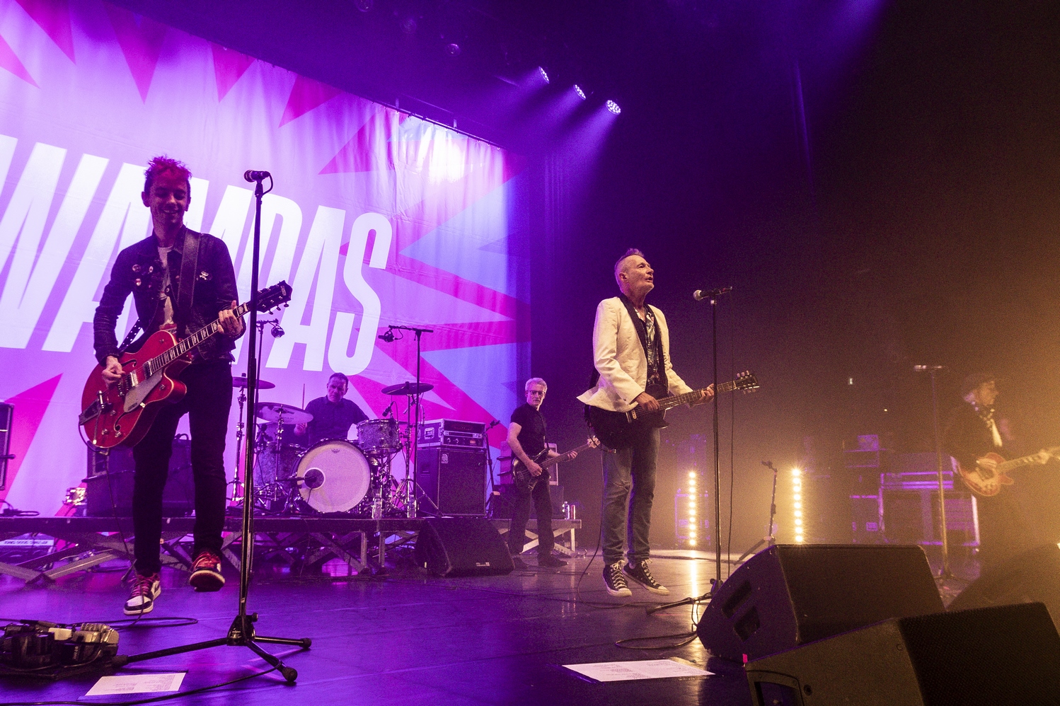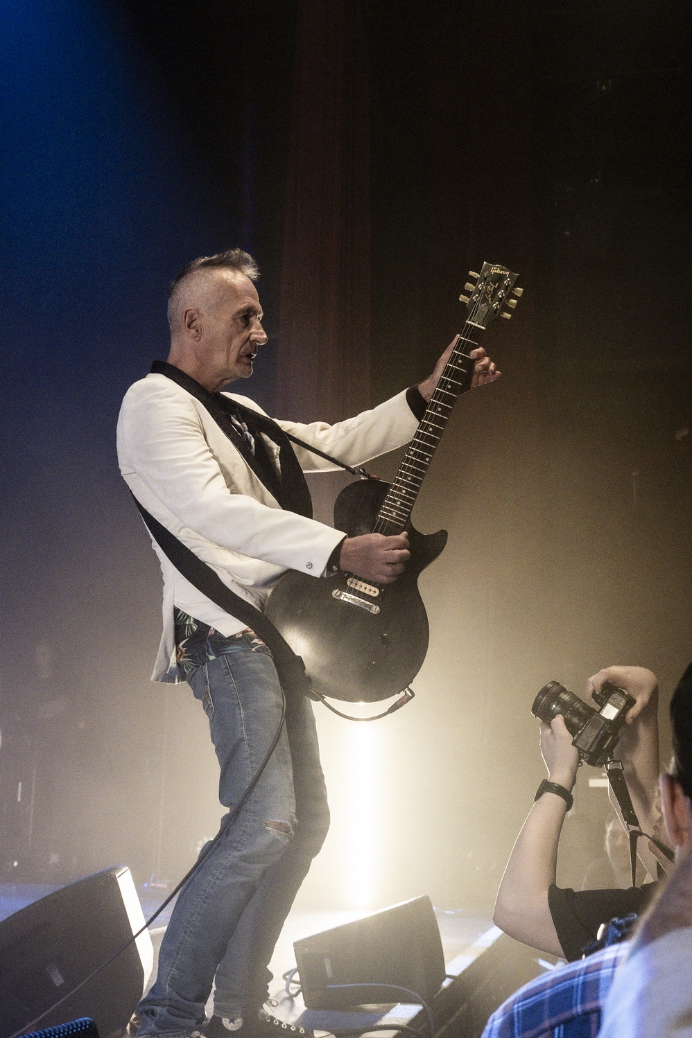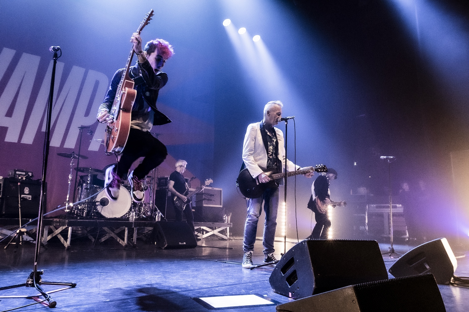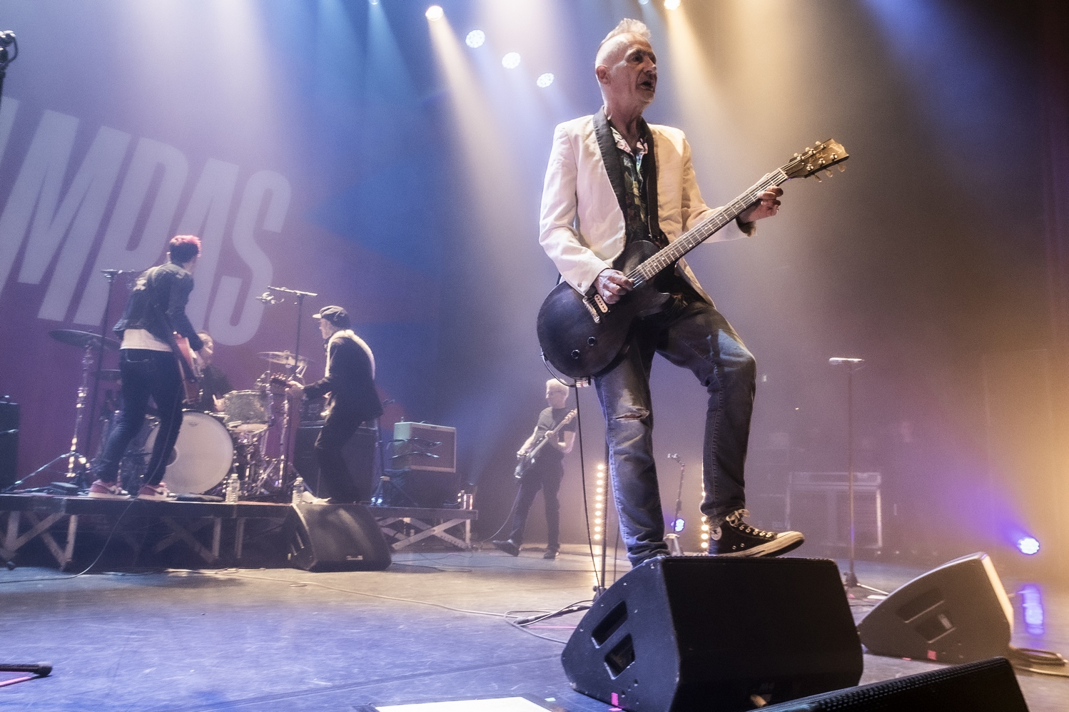 Evacuons tout de suite les sujets qui fâchent. Oui ok, nous sommes à l’Olympia, mais avant tout nous sommes à un concert des Wampas. Alors déjà quand en se rapprochant de la scène, pour aller prendre des photos on entend les réflexions de quelques personnes outrées qu’on puisse les doubler, dont une personne qui me dit "vous croyez allez où là ?", cela donne envie de leur dire mais bordel on est à un concert des Wampas, dans cinq minutes c’est le bordel intégral !! Mais surtout le truc qui pique un peu c’est quand ayant eu le droit à trois morceaux devant les barrières pour prendre des photos (normal faut que la sécu puissent bosser tranquille avec les nombreux et incessants slameurs) on vient nous demander de ressortir en passant par les loges, des couloirs, des pièces en enfilades (c’est grand l’Olympia), pour ensuite déposer nos sacs à la consigne et retourner dans la salle. Déjà ce petit manège prend une petite quinzaine de minutes et nous fait rater entre autres "Les bottes rouges" mais là aussi on se dit qu’il y a un truc qui cloche pour un concert des Wampas. Les ayant vu de très nombreuses fois dans toutes les salles possibles, on se souvient qu’il y a encore peu on pouvait rentrer appareil photo, caméra ou autre et se faire plaisir comme on voulait. Et là il faut bien dire que l’on pensait pouvoir se mettre dans un coin de la salle et continuer de mitrailler le concert, sachant qu’avec Didier et sa bande cela allait monter crescendo dans l’énergie et la folie ! Donc on ne sait pas qui a eu cette idée d’organisation comme si c’était U2 au Stade de France, mais l’idée est pourrie ! Il faut le dire.