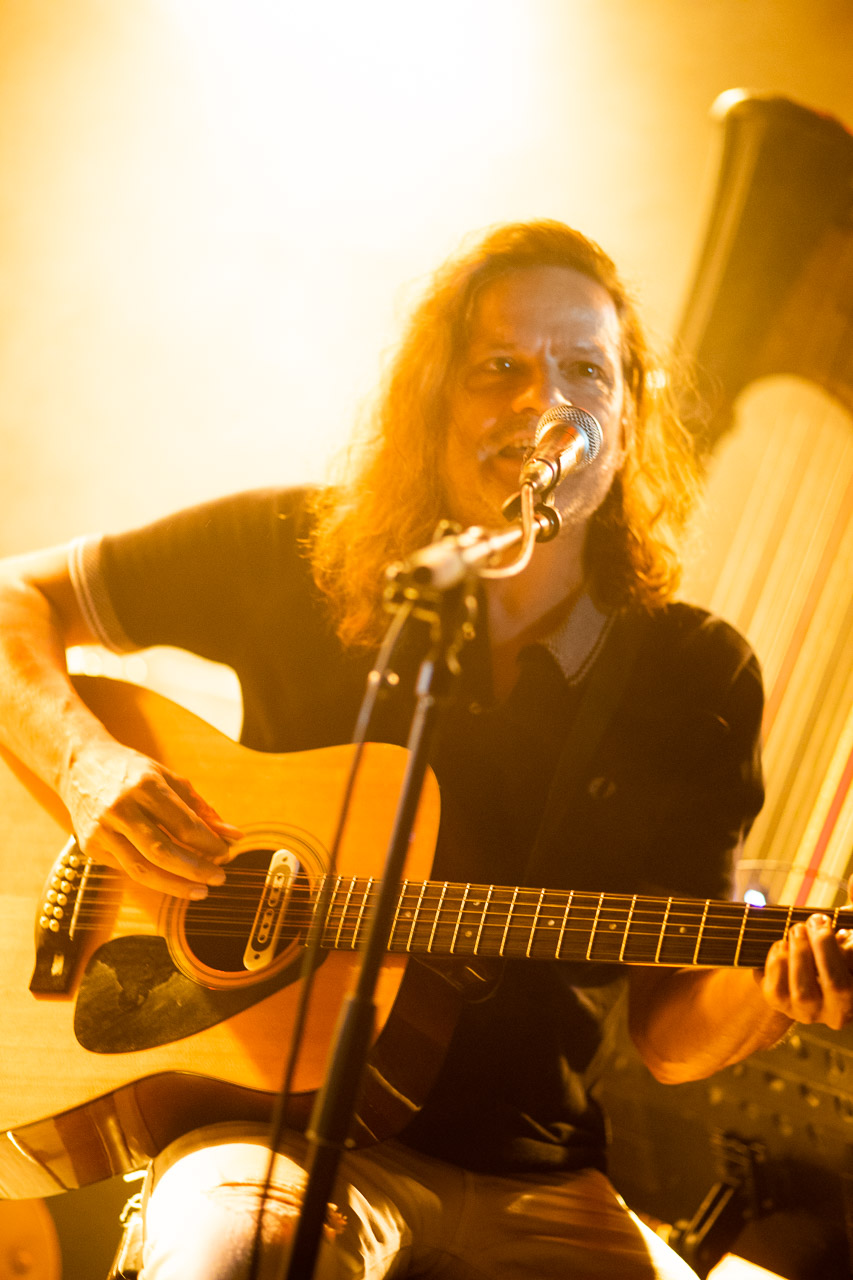 Vous l’avez certainement deviné, pour ce rendez-vous parisien pour présenter son nouvel album L’horizon, c’est en fait Manu et ses musiciens qui font leur propre première partie, plus ou moins en acoustique, dans la configuration de l’abum Entre deux eaux, vol. 1 : avec Christophe Saunière à la harpe, Damien Jarry au violoncelle et Patrick Giordano qui alterne entre douze-cordes acoustique et Gibson Les Paul. Le résultat est à l’image de l’album (et de notre session), de toute beauté. Il y a toute l’émotion produite par l’expressivité des notes graves du violoncelle, la mélancolie, la fragilité des notes de harpe cristallines, le tout savamment arrangé pour sublimer les compositions de Manu sans en altérer la substance, sans changer l’histoire mais en redessinant les décors.