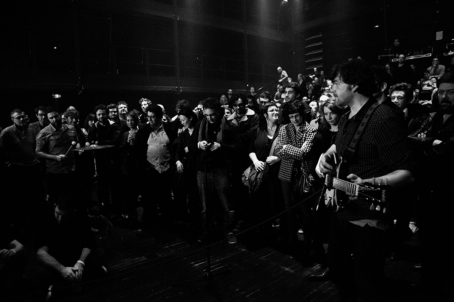 Michel Cloup n’était pas en duo ce soir à la Gaité Lyrique. Il y avait deux invités plus que prestigieux pour le public parisien : Françoise Lebrun que nous avions eu la chance de voir sur scène avec Diabologum à Vendôme pour une inoubliable version de la Maman et la Putain et celui qui ferait passer Gad Elmaleh pour un vulgaire figurant d’une publicité moisie pour une banque quelconque, Pascal Bouaziz de Mendelson !