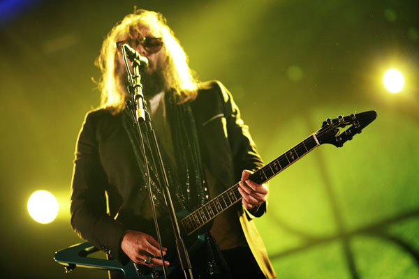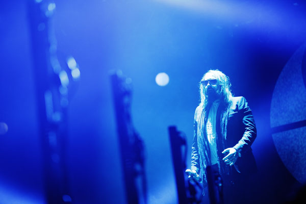 "Ceux qui me connaissent savent qu’il faut me dire ta gueule", sinon il peut continuer longtemps ; pendant des heures il voudrait bien. Il faut dire sur scène il est un peu chez lui, il peut se fumer sa clope tranquille, boire (et perdre) sa bière, évoquer on ne sait plus trop pourquoi les discours de Jospin et nous dire qu’il déteste Mme Dupont ou monsieur Machinchose.On sait pas qui c’est mais en tout cas on n’a pas envie de lui dire ta gueule, tout simplement parce que Sébastien Tellier c’est autant le personnage que la musique, essentiellement à base de claviers, on distingue pas tellement ce qu’il joue sur sa flyin’ V et parfois malheureusement la voix aussi passe à la trappe. Mais peu importe le gros son est là, hors les problèmes intermittents de voix, un mix impeccable sort des enceintes et après un début de festival très moyen, on apprécie la prestation et cette volonté affichée de donner de l’amour (euh c’est lui qu’il le dit)