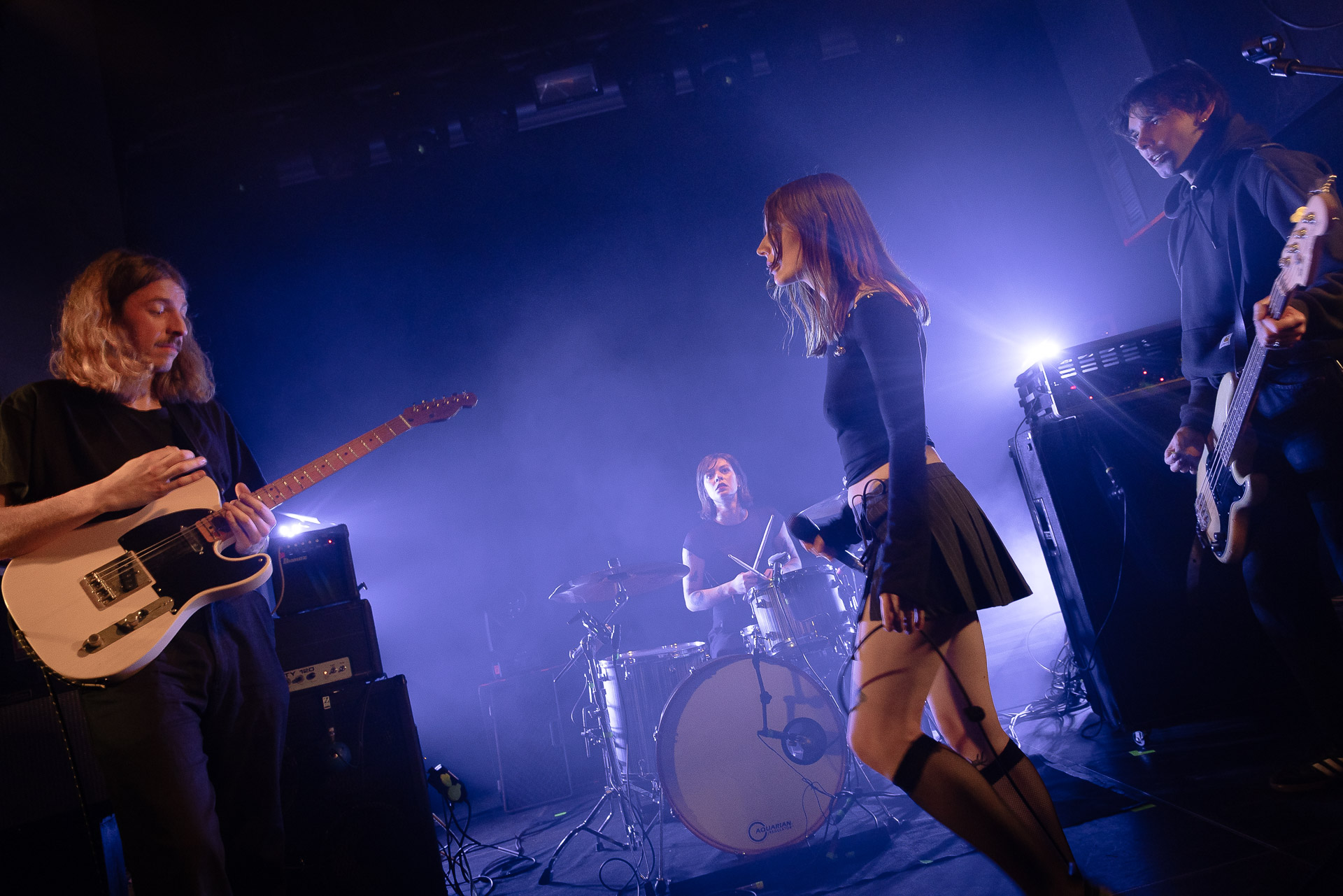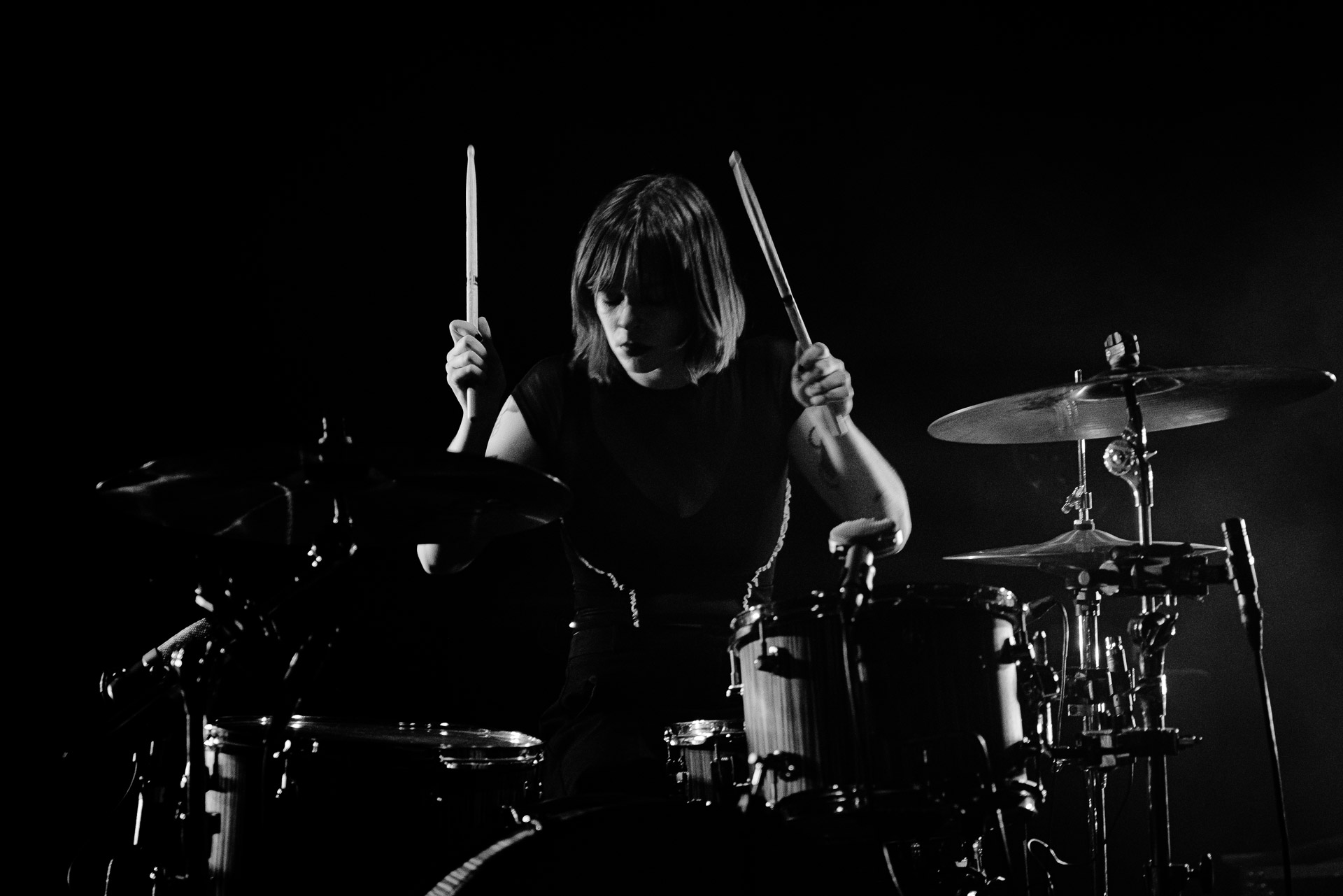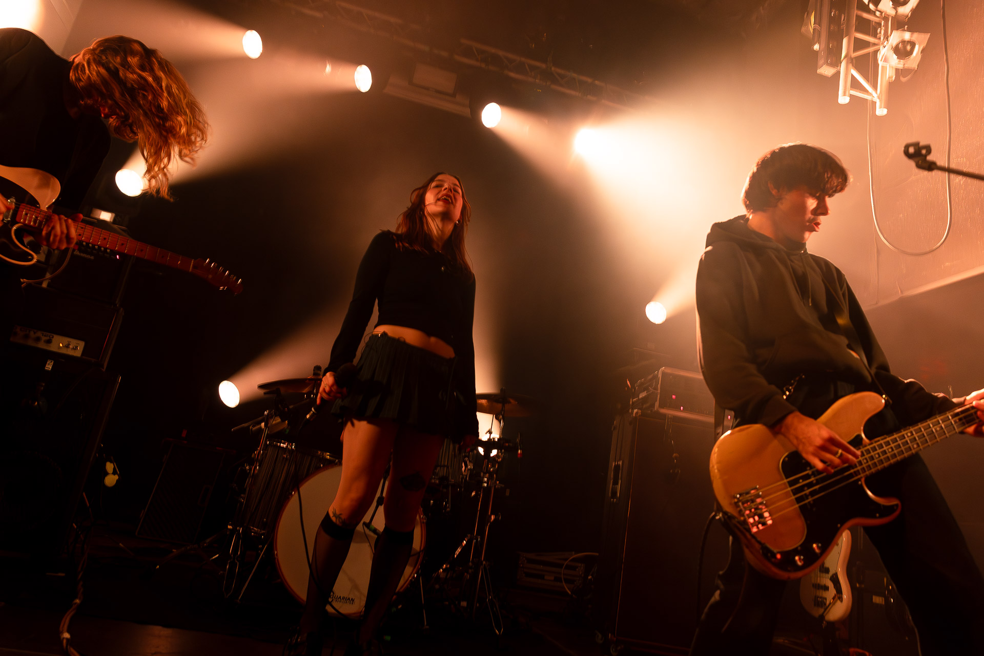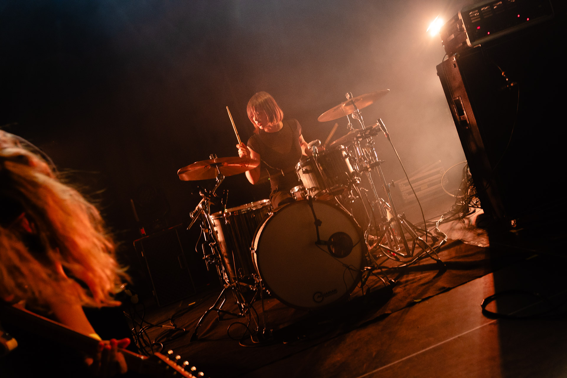 Quasiment un an jour pour jour après La Maroquinerie, on retrouve We Hate You Please Die sur la scène de Petit Bain pour la fin d’une tournée bien remplie autour de leur album Chamber Songs . Pas de suspens, dès le premier morceau, le groupe déploie toute l’énergie qu’on lui connait et le pogo s’enclenche très vite dans la fosse. Dans les tous premiers rangs, c’est une expérience chaotique et jubilatoire, furieuse mais pleine de bonne humeur, on se régale de la guitare de Joseph, qui assure à la fois une rythmique solide et hargneuse et en même temps varie les plaisirs avec plein de petites trouvailles, des petits riffs inattendus, des interventions mélodiques. Chez Chloé, on sent que cette année à tourner a amené un rab de confiance et d’assurance dans son rôle frontal de chanteuse de WHYPD, le chant a progressé et ce soir il est aidé par un mix beaucoup plus réussi qu’à la Maro, on a donc les conditions réunies pour conclure en beauté la tournée par une superbe soirée, au cours de laquelle Chloé se livrera même à un bain de "fosse" pendant le titre où un quatrième larron la remplace à la basse. Une configuration à quatre où elle n’est qu’au micro dont on se dit qu’elle pourrait durer un peu plus qu’un morceau. Pas de rappel mais fatigué qu’on ait après tout un concert dans une fosse bien agité, on ne leur en voudra pas, après tout c’est un peu comme s’ils repartaient d’un premier album et surtout ce soir tout était là : l’énergie, la présence scénique, servis par un son où on entend tout les instruments et la voix correctement, sans pour autant faire de concession sur la puissance, le côté rageur de la musique