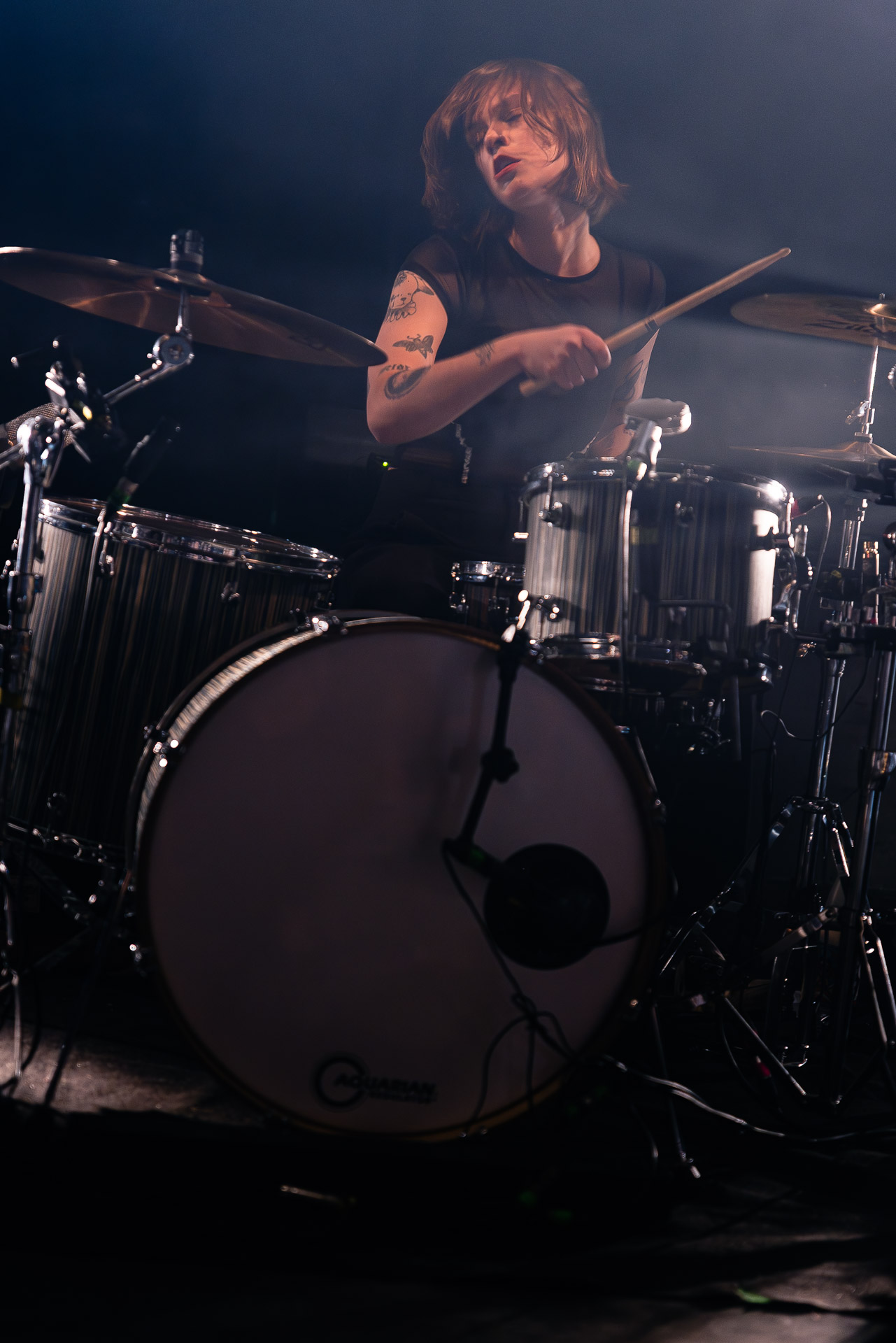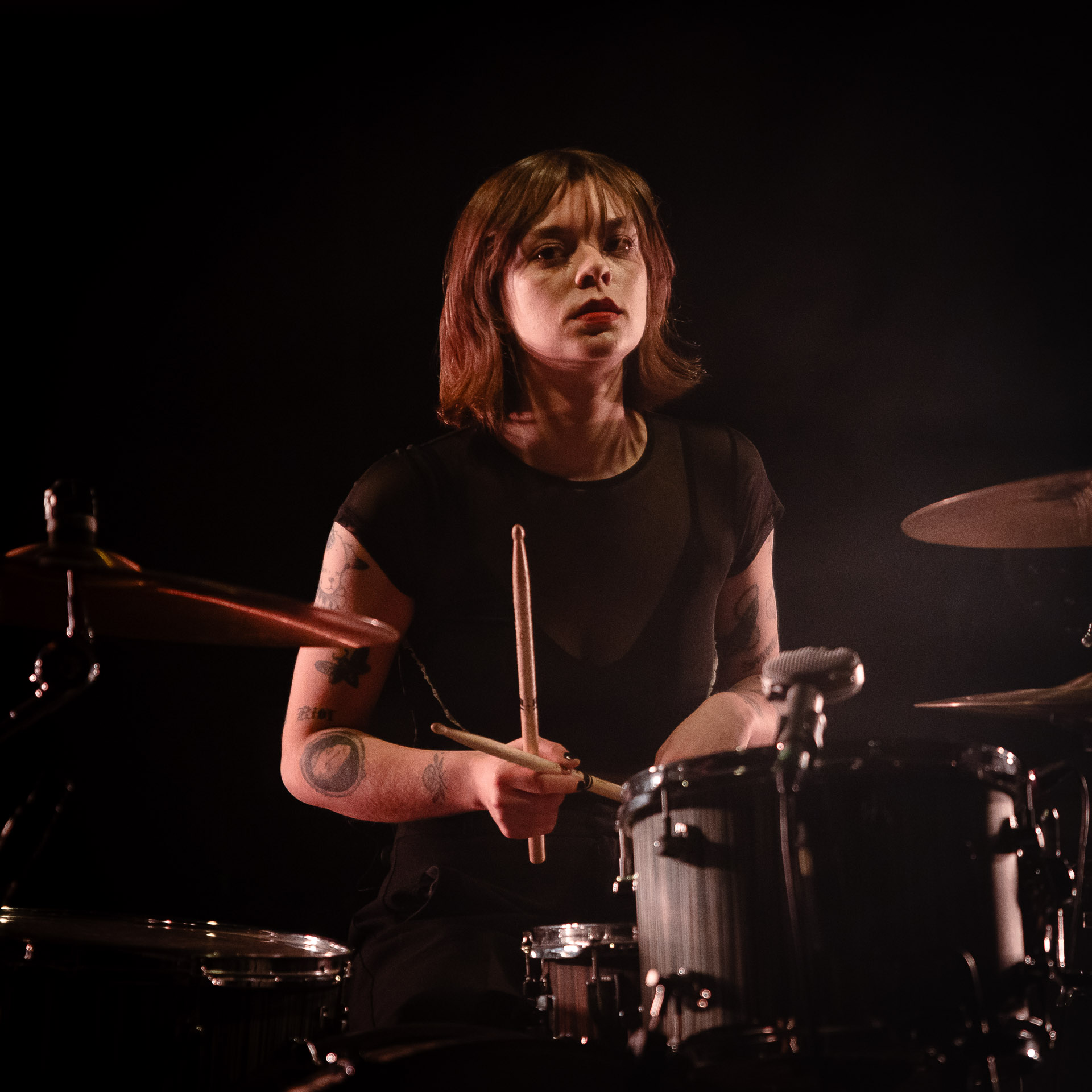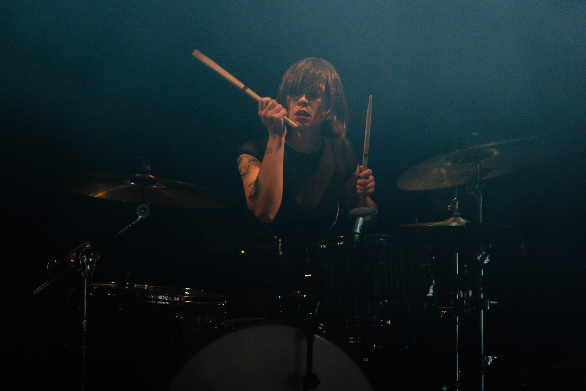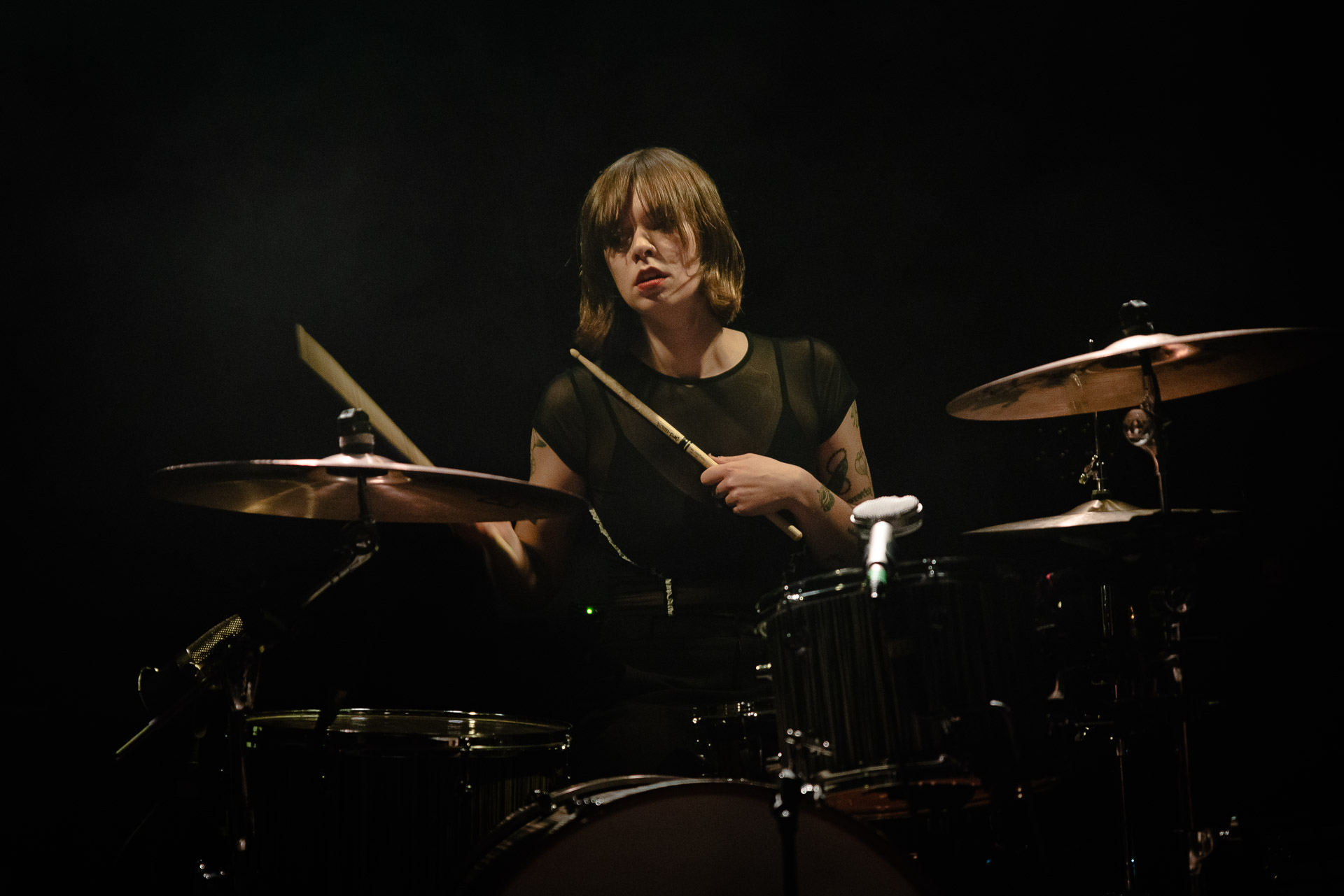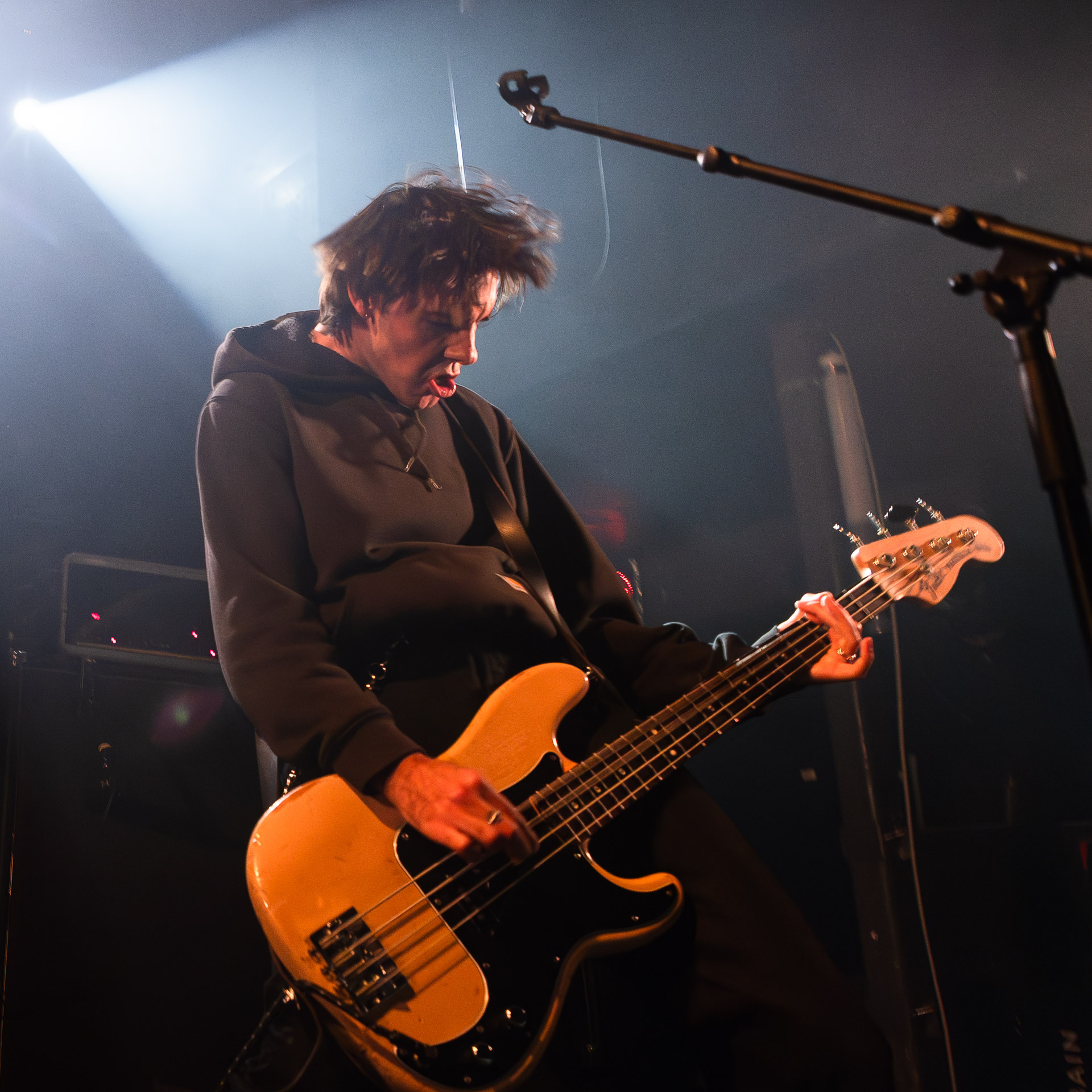 Quasiment un an jour pour jour après La Maroquinerie, on retrouve We Hate You Please Die sur la scène de Petit Bain pour la fin d’une tournée bien remplie autour de leur album Chamber Songs . Pas de suspens, dès le premier morceau, le groupe déploie toute l’énergie qu’on lui connait et le pogo s’enclenche très vite dans la fosse. Dans les tous premiers rangs, c’est une expérience chaotique et jubilatoire, furieuse mais pleine de bonne humeur, on se régale de la guitare de Joseph, qui assure à la fois une rythmique solide et hargneuse et en même temps varie les plaisirs avec plein de petites trouvailles, des petits riffs inattendus, des interventions mélodiques. Chez Chloé, on sent que cette année à tourner a amené un rab de confiance et d’assurance dans son rôle frontal de chanteuse de WHYPD, le chant a progressé et ce soir il est aidé par un mix beaucoup plus réussi qu’à la Maro, on a donc les conditions réunies pour conclure en beauté la tournée par une superbe soirée, au cours de laquelle Chloé se livrera même à un bain de "fosse" pendant le titre où un quatrième larron la remplace à la basse. Une configuration à quatre où elle n’est qu’au micro dont on se dit qu’elle pourrait durer un peu plus qu’un morceau. Pas de rappel mais fatigué qu’on ait après tout un concert dans une fosse bien agité, on ne leur en voudra pas, après tout c’est un peu comme s’ils repartaient d’un premier album et surtout ce soir tout était là : l’énergie, la présence scénique, servis par un son où on entend tout les instruments et la voix correctement, sans pour autant faire de concession sur la puissance, le côté rageur de la musique