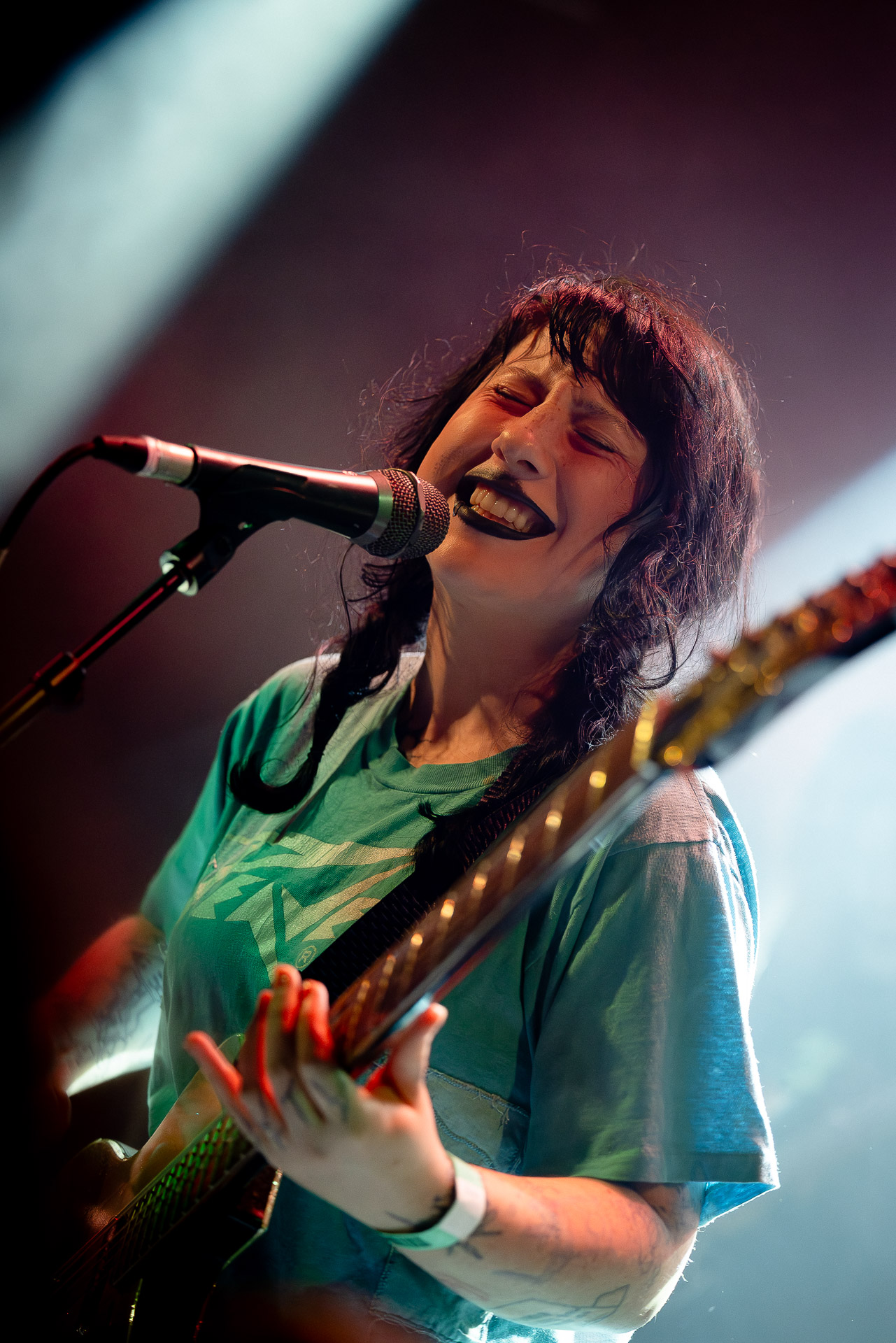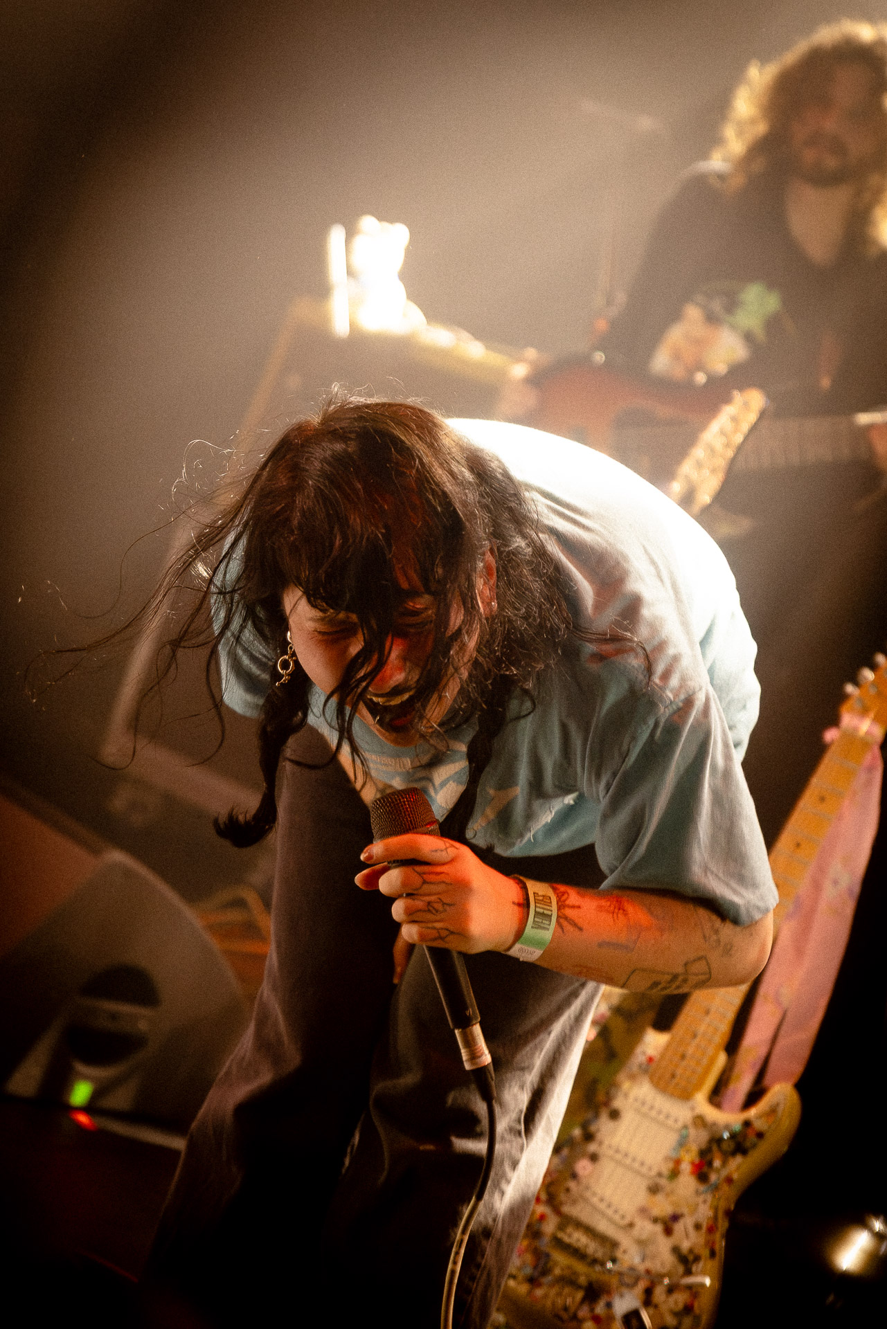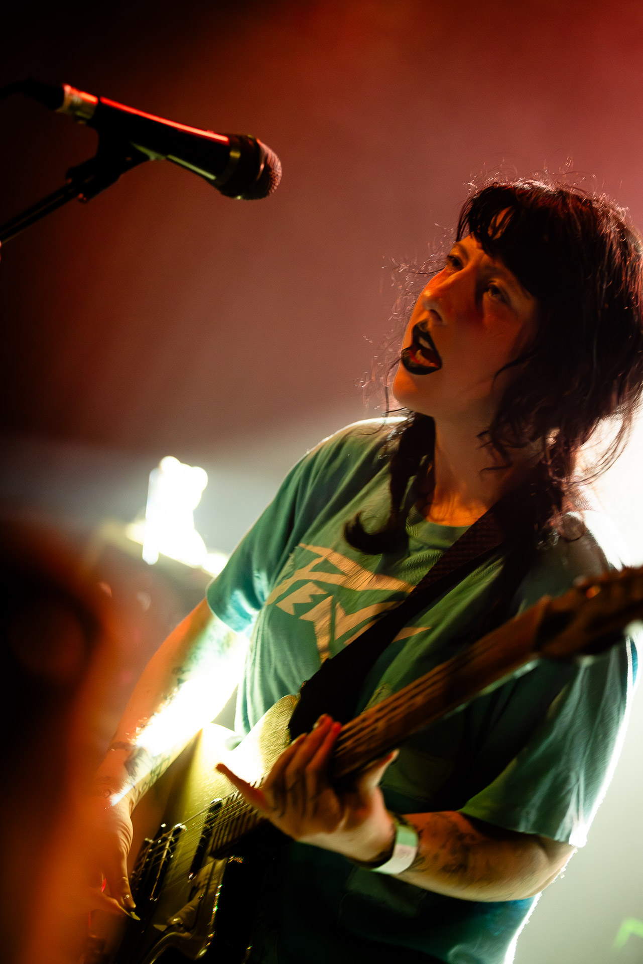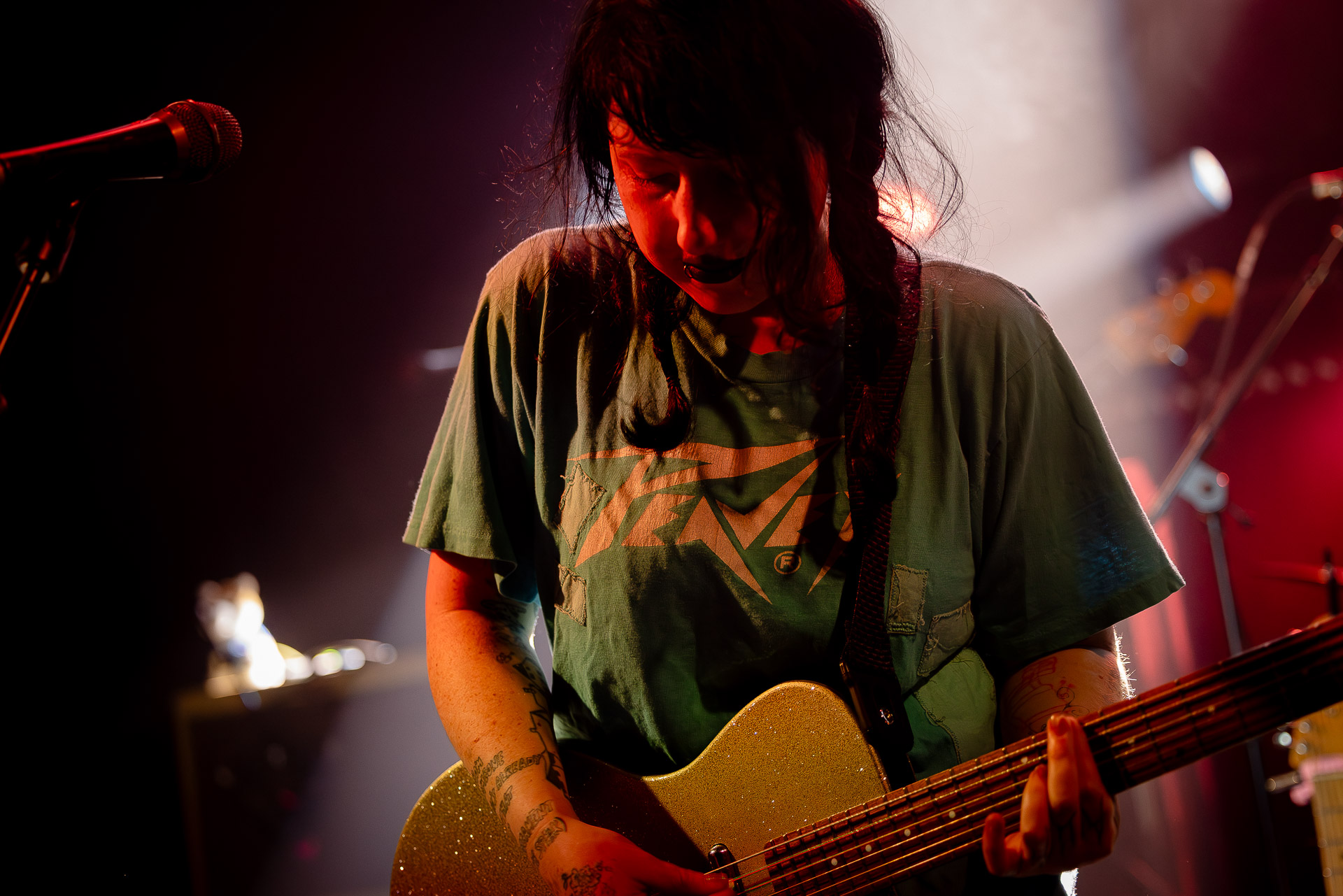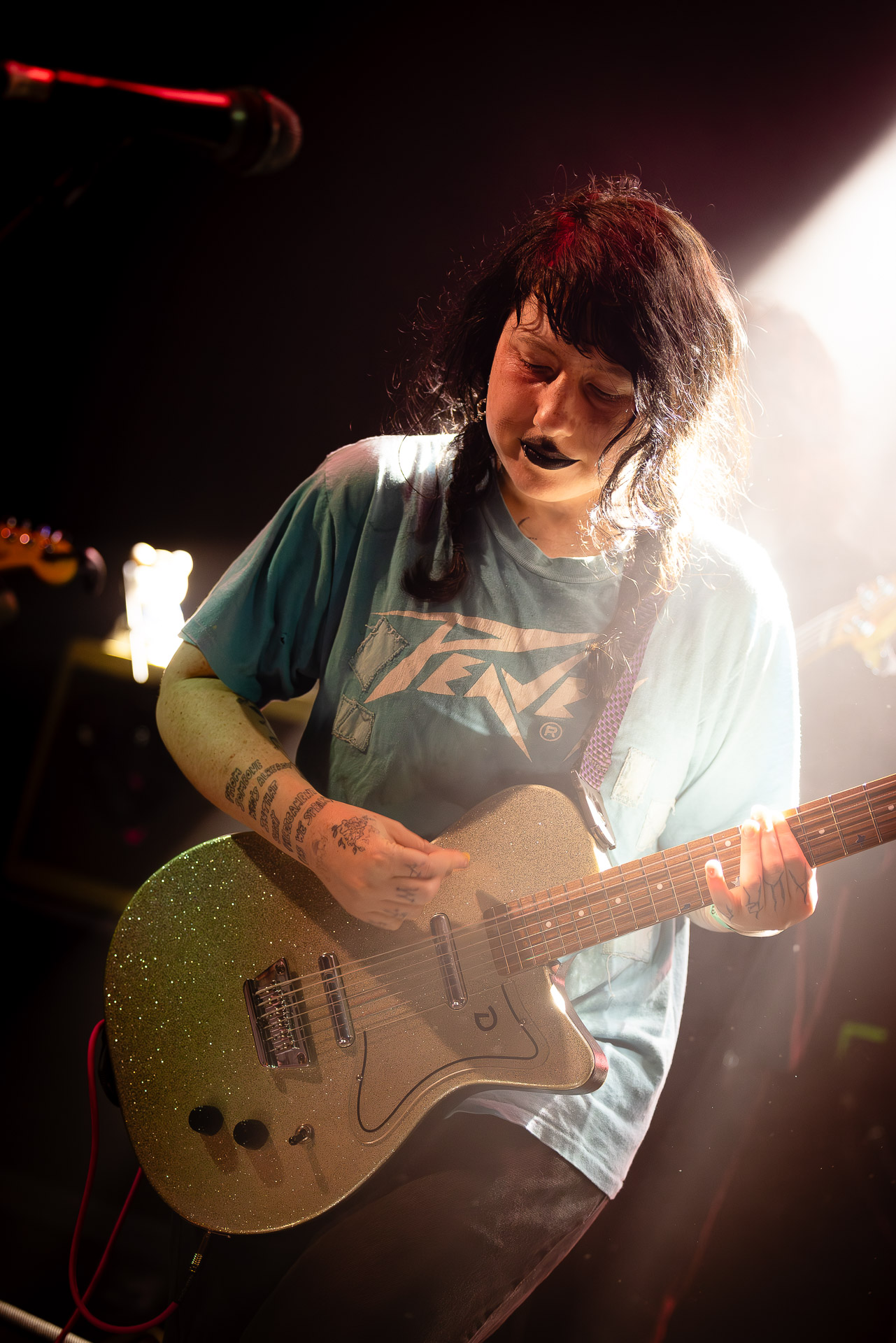 On se rend compte rapidement que tout comme la musique du groupe, un mélange détonnant de folk-country mélodique joliment parsemé de pedal steel et de riffs brutaux au son cradingue, Karly a plusieurs facettes : il y a la fille qui commence le concert avec cette mine fatiguée mais qui impressionne sur "Pick Up That Knife", la tête renversée, la bouche ouvert le plus grand possible, à hurlant tout ce qu’elle peut, encore ou encore dans un "Wasp" en final monstrueux et chaotique où elle laisse la guitare et donne tout ce qu’elle peut, à genoux par terre ou pliée en deux.. Celle qui écrit les textes plutôt sombres du groupe dont certains sur le dernier album évoquent sa rupture avec le guitariste MJ Lenderman, toujours membre du groupe mais qui ne tourne plus avec eux... Mais il y a aussi celle qui rigole en observant une fille qui fait "le slam le plus long qu’elle ait jamais vu" ou qui entre deux chansons fait un sondage pour savoir s’il y a des américains dans la salle, découvre qu’une autre fille est du même bled de Caroline du Nord qu’elle. Et elles commencent un peu à se raconter leur vie, leur lycée commun etc et qui alterne entre une danelectro à paillettes et une stratocaster avec un million de bidules colorés collés dessus et ce fameux t-shirt de vieux métalleux donc.