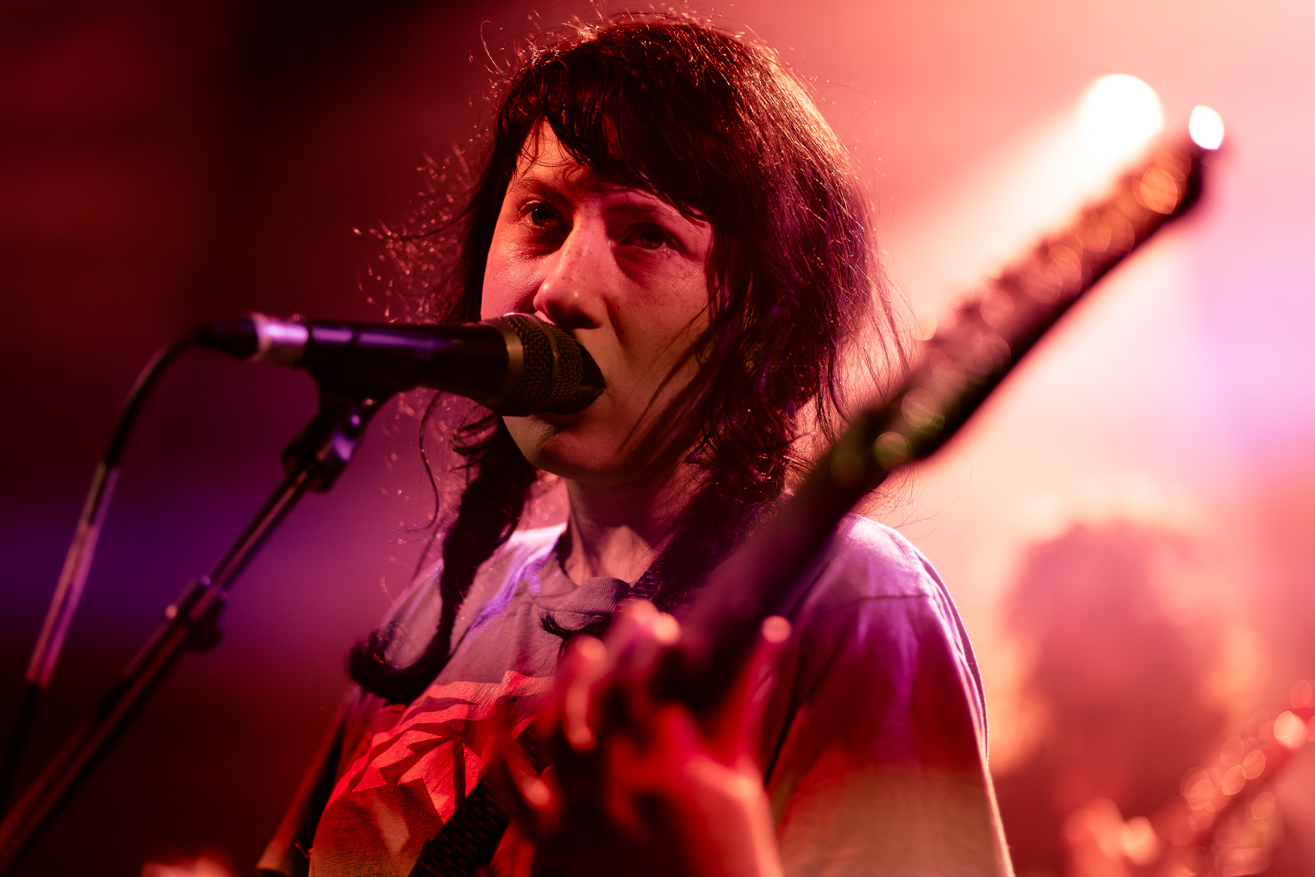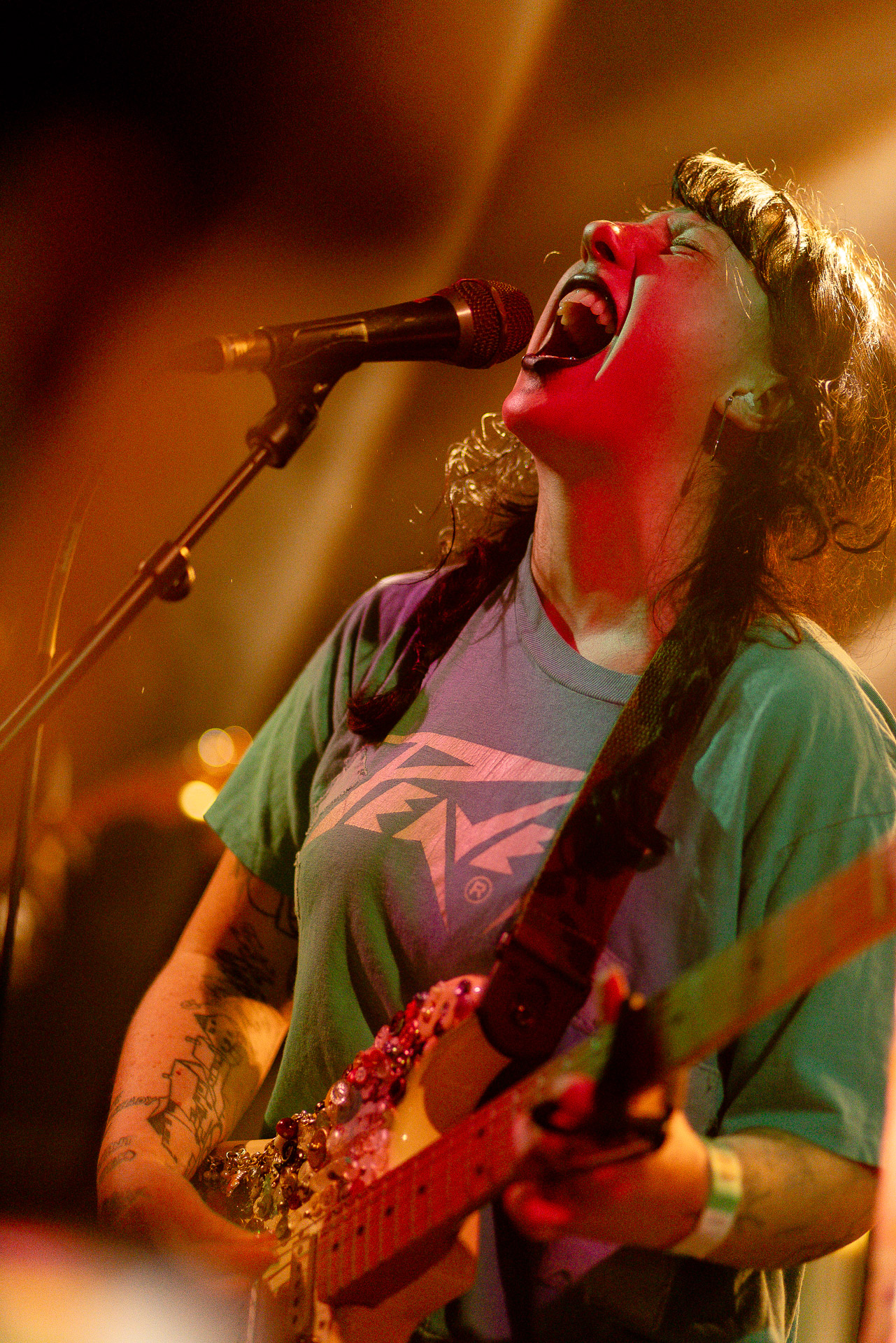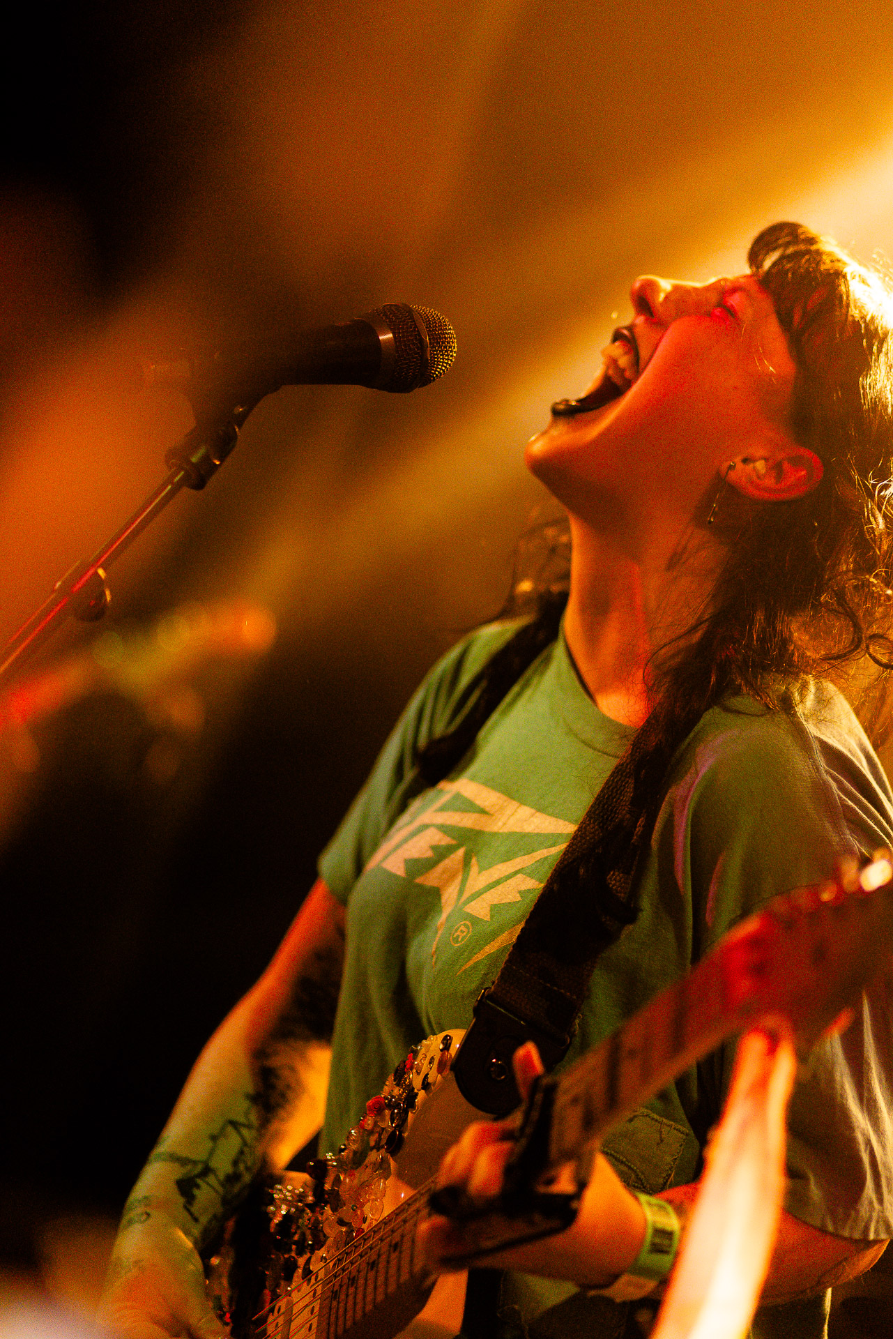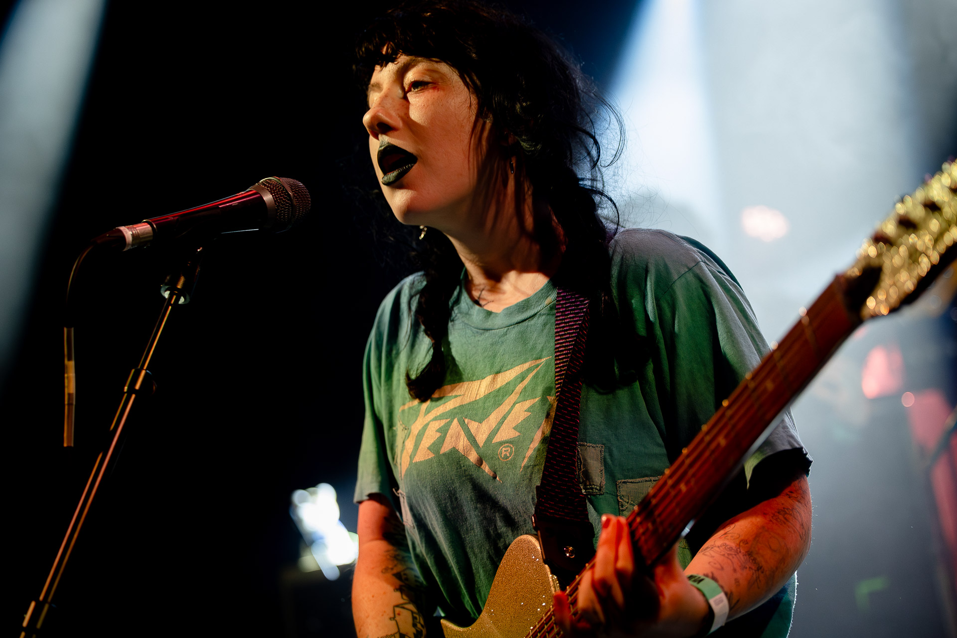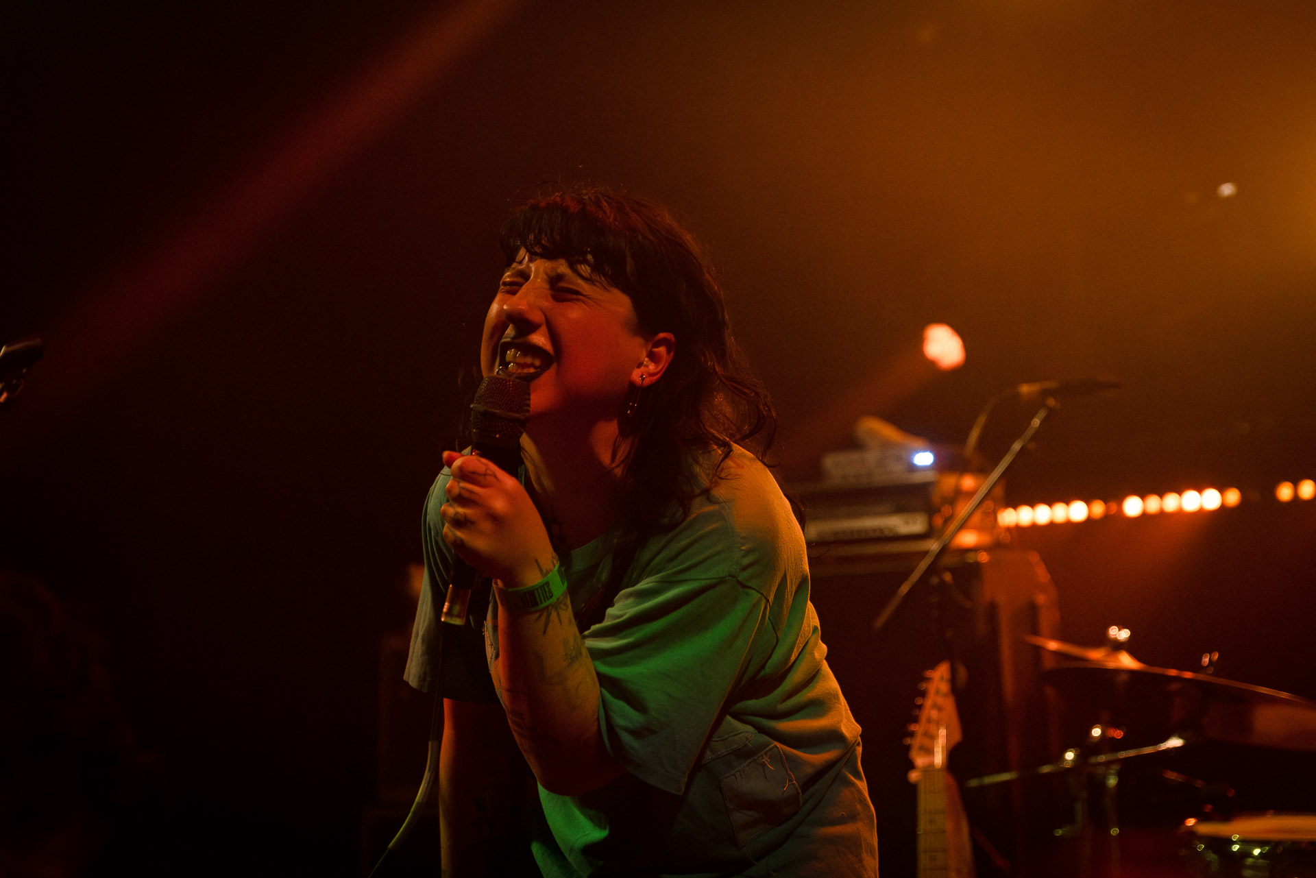 On se rend compte rapidement que tout comme la musique du groupe, un mélange détonnant de folk-country mélodique joliment parsemé de pedal steel et de riffs brutaux au son cradingue, Karly a plusieurs facettes : il y a la fille qui commence le concert avec cette mine fatiguée mais qui impressionne sur "Pick Up That Knife", la tête renversée, la bouche ouvert le plus grand possible, à hurlant tout ce qu’elle peut, encore ou encore dans un "Wasp" en final monstrueux et chaotique où elle laisse la guitare et donne tout ce qu’elle peut, à genoux par terre ou pliée en deux.. Celle qui écrit les textes plutôt sombres du groupe dont certains sur le dernier album évoquent sa rupture avec le guitariste MJ Lenderman, toujours membre du groupe mais qui ne tourne plus avec eux... Mais il y a aussi celle qui rigole en observant une fille qui fait "le slam le plus long qu’elle ait jamais vu" ou qui entre deux chansons fait un sondage pour savoir s’il y a des américains dans la salle, découvre qu’une autre fille est du même bled de Caroline du Nord qu’elle. Et elles commencent un peu à se raconter leur vie, leur lycée commun etc et qui alterne entre une danelectro à paillettes et une stratocaster avec un million de bidules colorés collés dessus et ce fameux t-shirt de vieux métalleux donc.