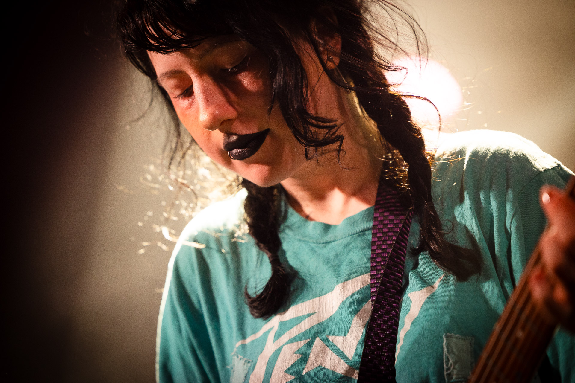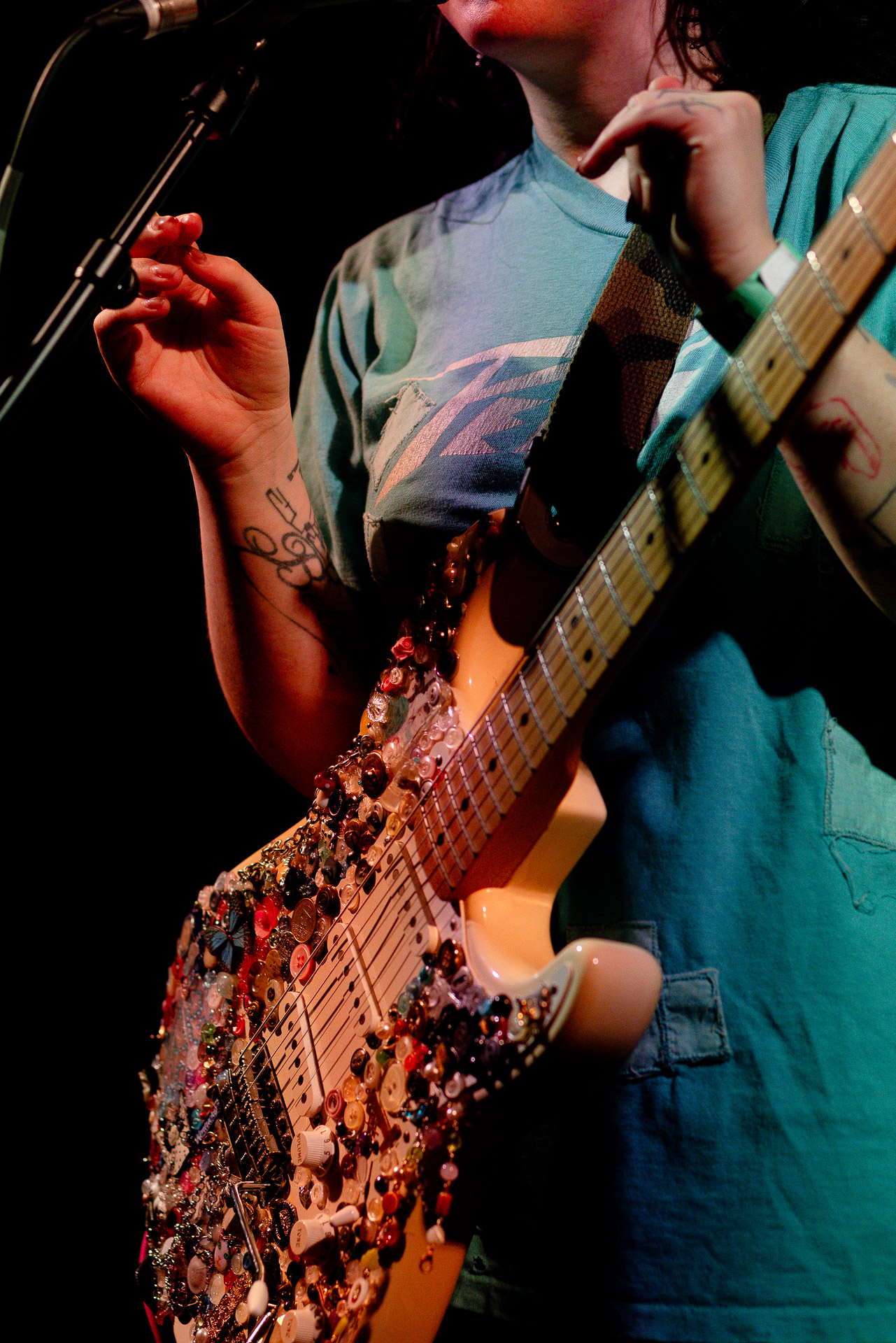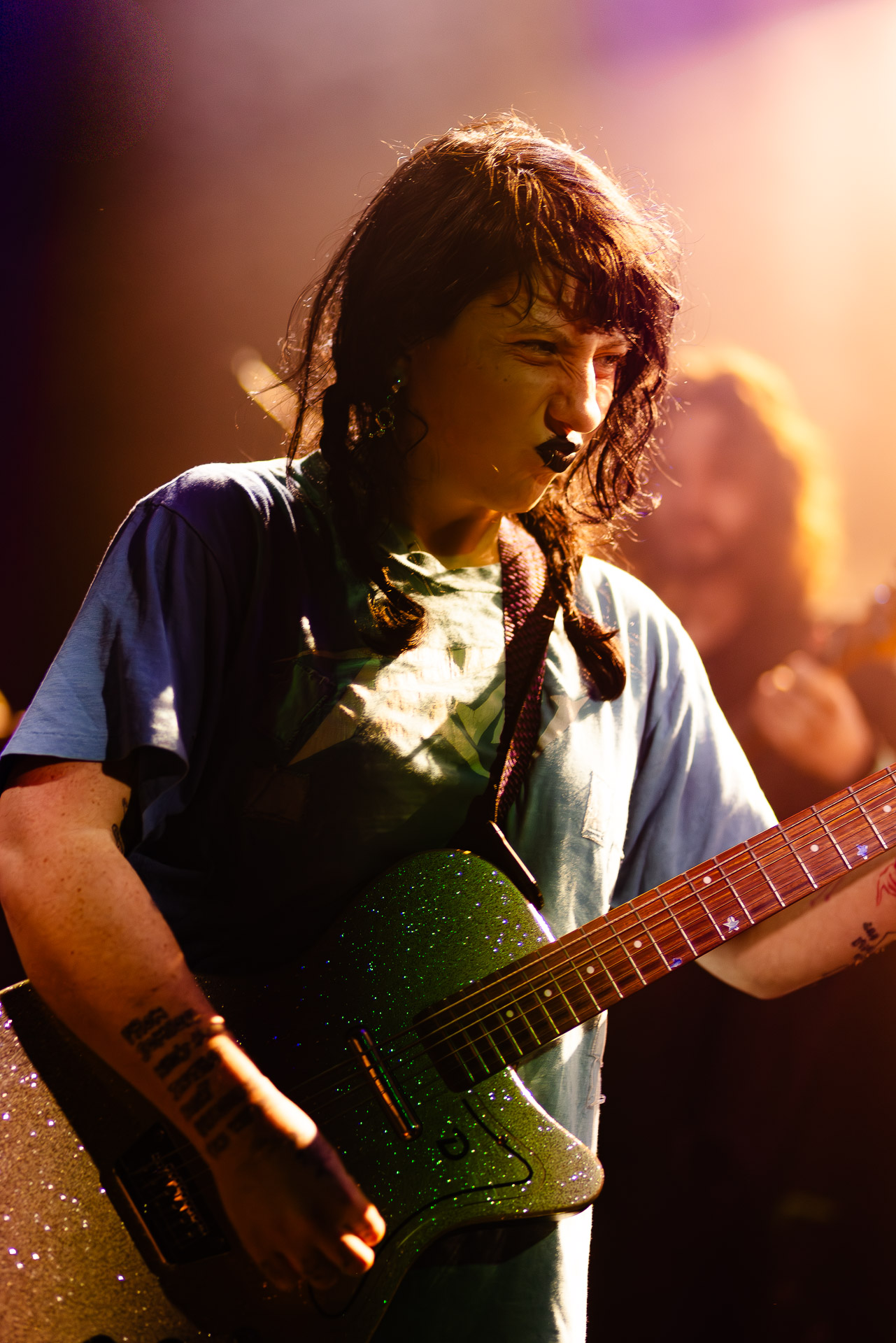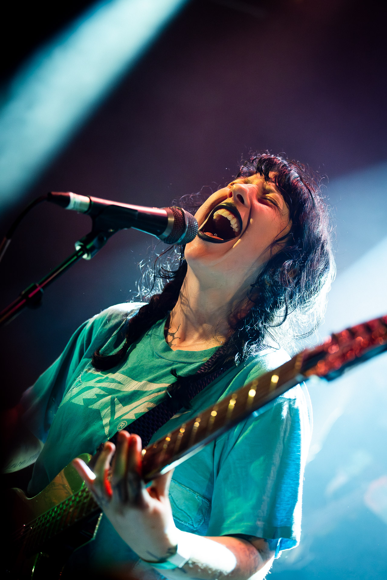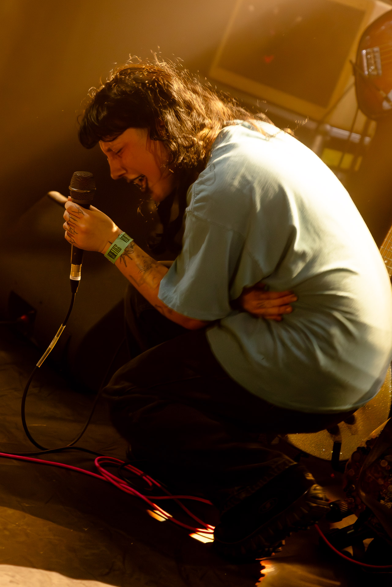 On se rend compte rapidement que tout comme la musique du groupe, un mélange détonnant de folk-country mélodique joliment parsemé de pedal steel et de riffs brutaux au son cradingue, Karly a plusieurs facettes : il y a la fille qui commence le concert avec cette mine fatiguée mais qui impressionne sur "Pick Up That Knife", la tête renversée, la bouche ouvert le plus grand possible, à hurlant tout ce qu’elle peut, encore ou encore dans un "Wasp" en final monstrueux et chaotique où elle laisse la guitare et donne tout ce qu’elle peut, à genoux par terre ou pliée en deux.. Celle qui écrit les textes plutôt sombres du groupe dont certains sur le dernier album évoquent sa rupture avec le guitariste MJ Lenderman, toujours membre du groupe mais qui ne tourne plus avec eux... Mais il y a aussi celle qui rigole en observant une fille qui fait "le slam le plus long qu’elle ait jamais vu" ou qui entre deux chansons fait un sondage pour savoir s’il y a des américains dans la salle, découvre qu’une autre fille est du même bled de Caroline du Nord qu’elle. Et elles commencent un peu à se raconter leur vie, leur lycée commun etc et qui alterne entre une danelectro à paillettes et une stratocaster avec un million de bidules colorés collés dessus et ce fameux t-shirt de vieux métalleux donc.