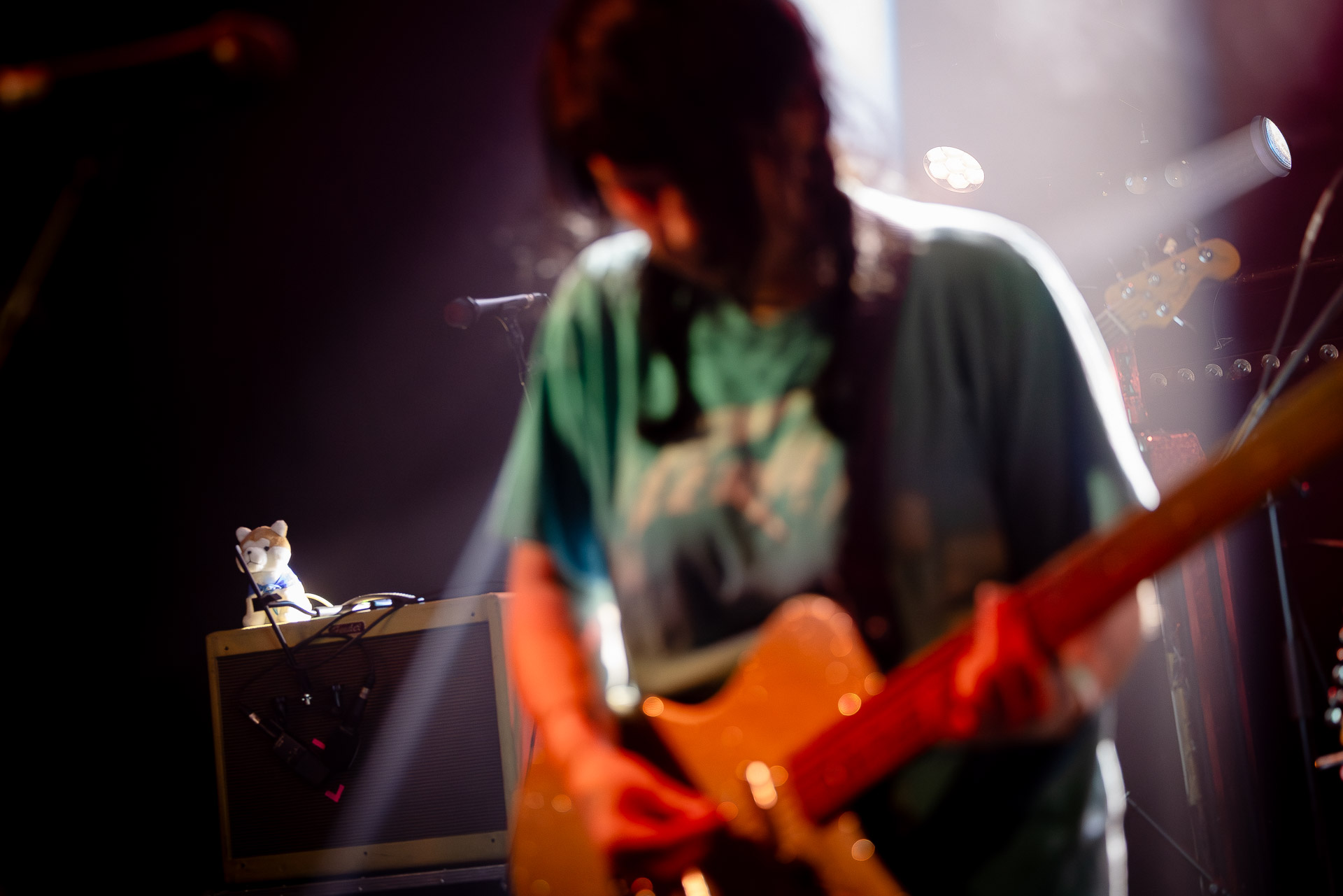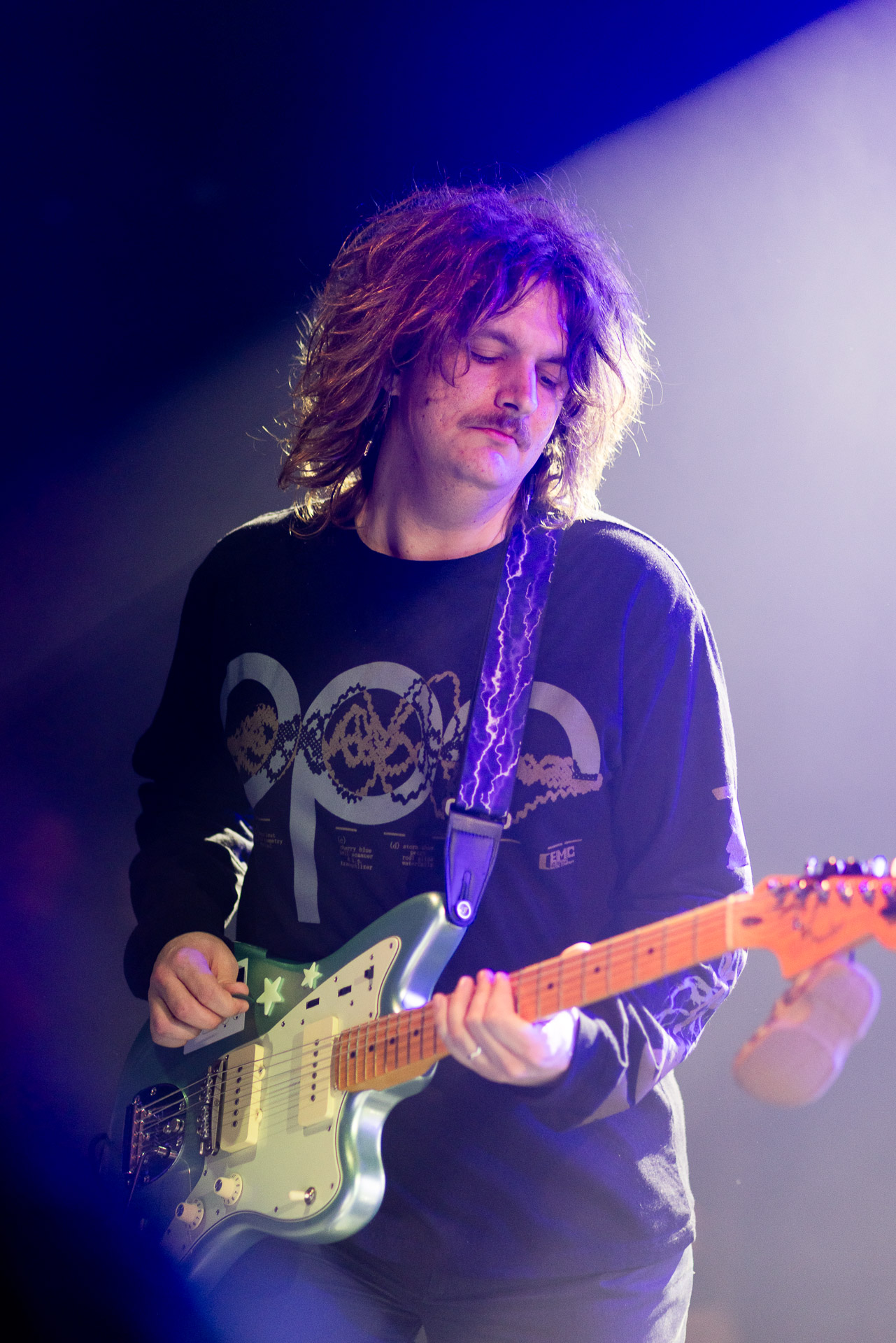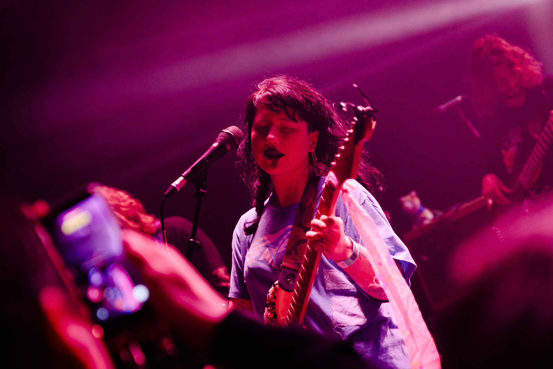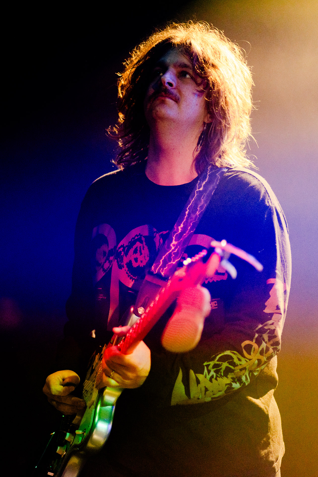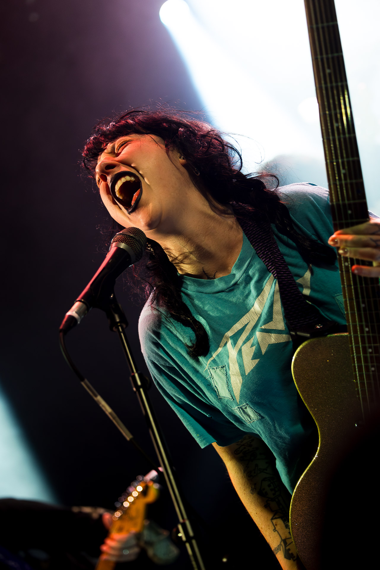 On se rend compte rapidement que tout comme la musique du groupe, un mélange détonnant de folk-country mélodique joliment parsemé de pedal steel et de riffs brutaux au son cradingue, Karly a plusieurs facettes : il y a la fille qui commence le concert avec cette mine fatiguée mais qui impressionne sur "Pick Up That Knife", la tête renversée, la bouche ouvert le plus grand possible, à hurlant tout ce qu’elle peut, encore ou encore dans un "Wasp" en final monstrueux et chaotique où elle laisse la guitare et donne tout ce qu’elle peut, à genoux par terre ou pliée en deux.. Celle qui écrit les textes plutôt sombres du groupe dont certains sur le dernier album évoquent sa rupture avec le guitariste MJ Lenderman, toujours membre du groupe mais qui ne tourne plus avec eux... Mais il y a aussi celle qui rigole en observant une fille qui fait "le slam le plus long qu’elle ait jamais vu" ou qui entre deux chansons fait un sondage pour savoir s’il y a des américains dans la salle, découvre qu’une autre fille est du même bled de Caroline du Nord qu’elle. Et elles commencent un peu à se raconter leur vie, leur lycée commun etc et qui alterne entre une danelectro à paillettes et une stratocaster avec un million de bidules colorés collés dessus et ce fameux t-shirt de vieux métalleux donc.