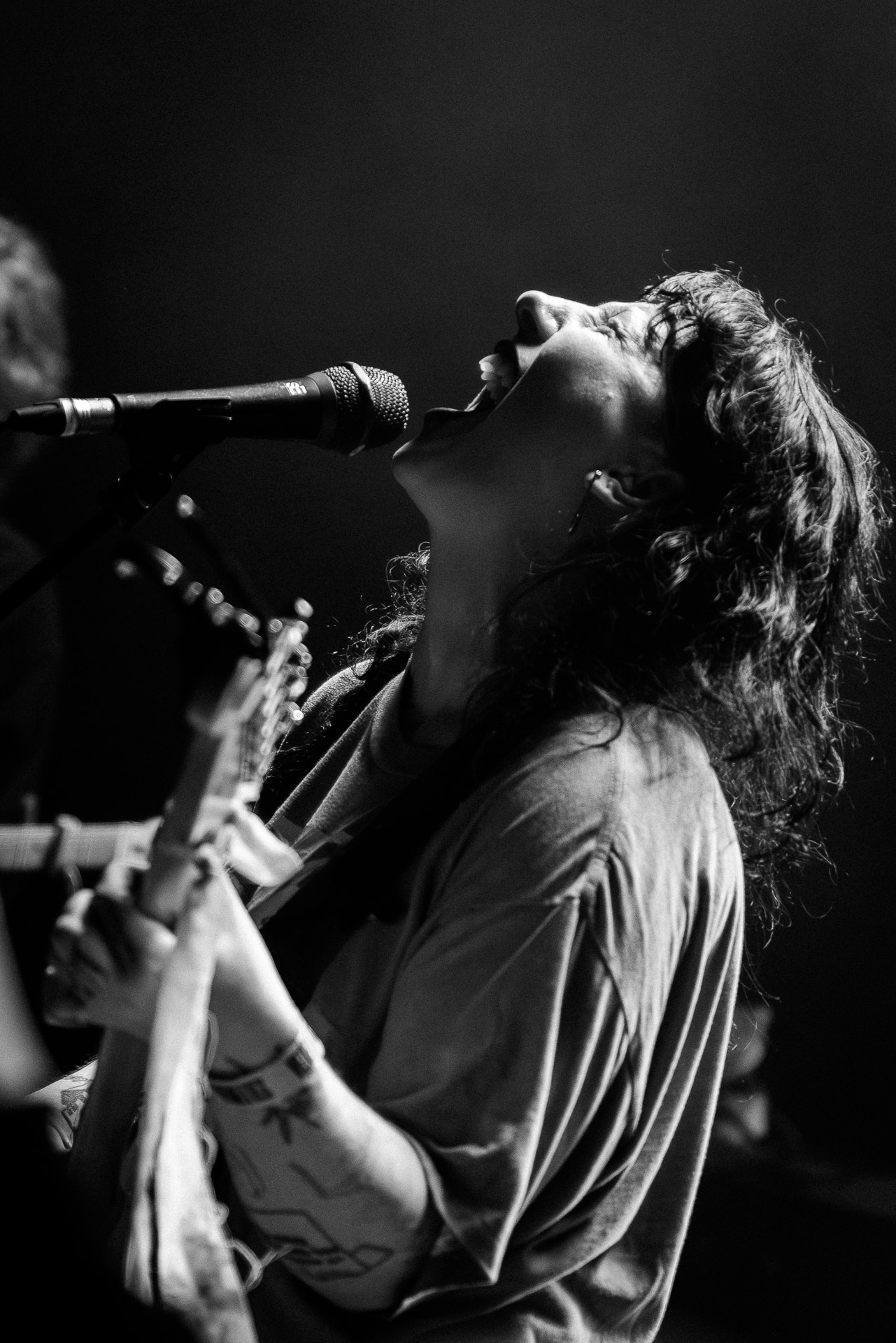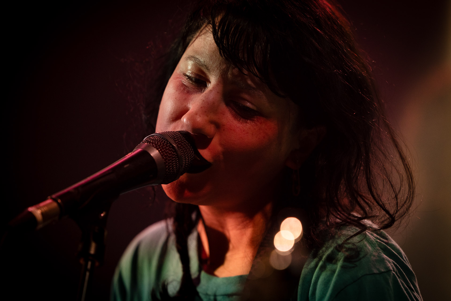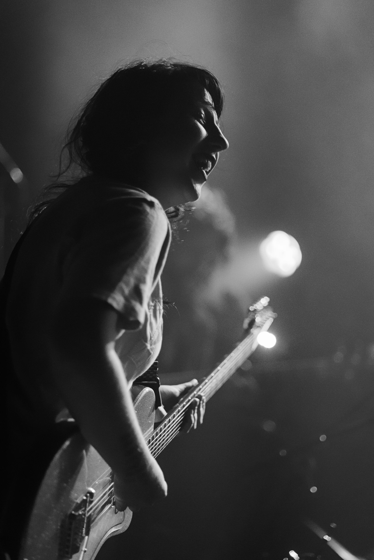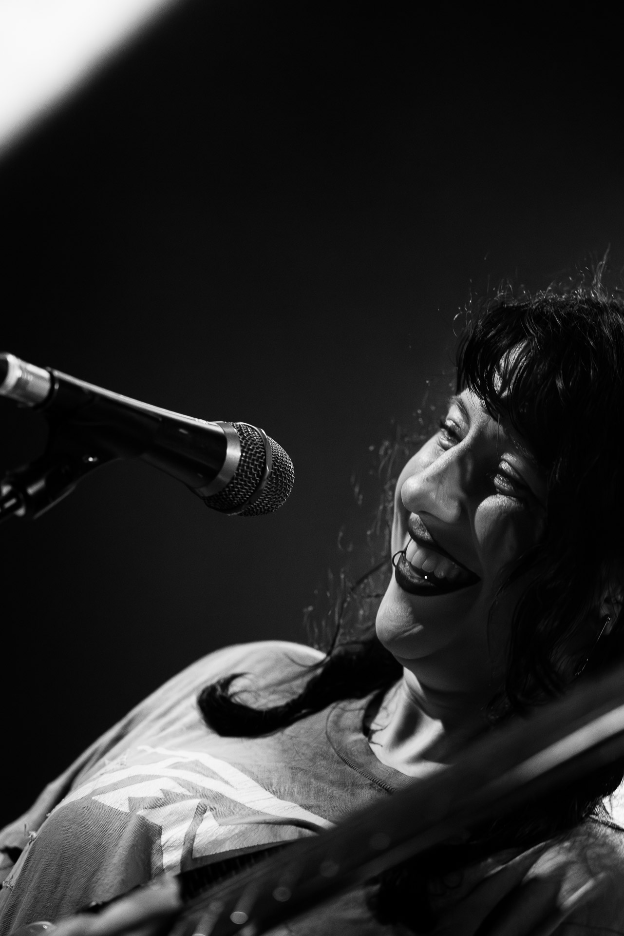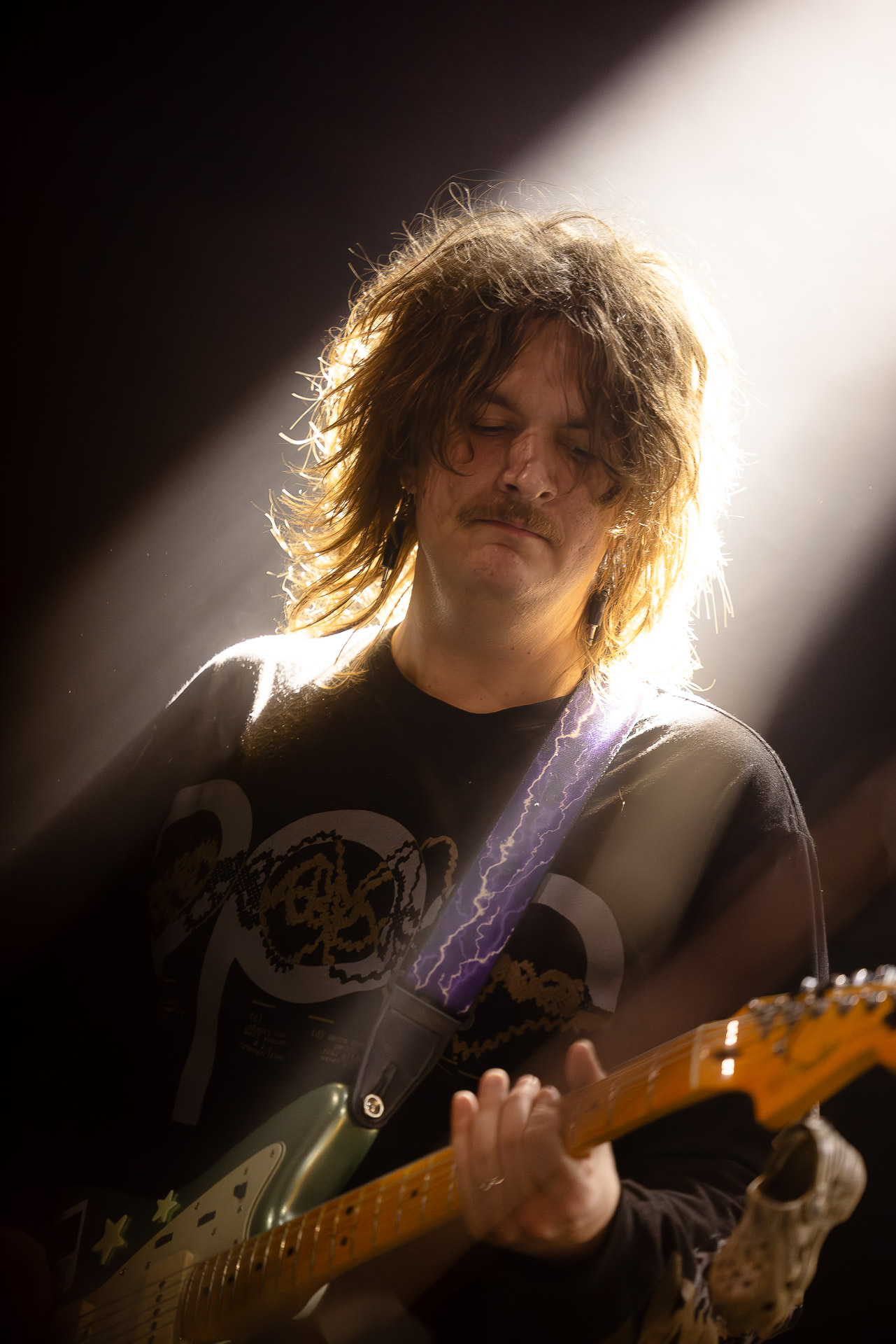 On se rend compte rapidement que tout comme la musique du groupe, un mélange détonnant de folk-country mélodique joliment parsemé de pedal steel et de riffs brutaux au son cradingue, Karly a plusieurs facettes : il y a la fille qui commence le concert avec cette mine fatiguée mais qui impressionne sur "Pick Up That Knife", la tête renversée, la bouche ouvert le plus grand possible, à hurlant tout ce qu’elle peut, encore ou encore dans un "Wasp" en final monstrueux et chaotique où elle laisse la guitare et donne tout ce qu’elle peut, à genoux par terre ou pliée en deux.. Celle qui écrit les textes plutôt sombres du groupe dont certains sur le dernier album évoquent sa rupture avec le guitariste MJ Lenderman, toujours membre du groupe mais qui ne tourne plus avec eux... Mais il y a aussi celle qui rigole en observant une fille qui fait "le slam le plus long qu’elle ait jamais vu" ou qui entre deux chansons fait un sondage pour savoir s’il y a des américains dans la salle, découvre qu’une autre fille est du même bled de Caroline du Nord qu’elle. Et elles commencent un peu à se raconter leur vie, leur lycée commun etc et qui alterne entre une danelectro à paillettes et une stratocaster avec un million de bidules colorés collés dessus et ce fameux t-shirt de vieux métalleux donc.