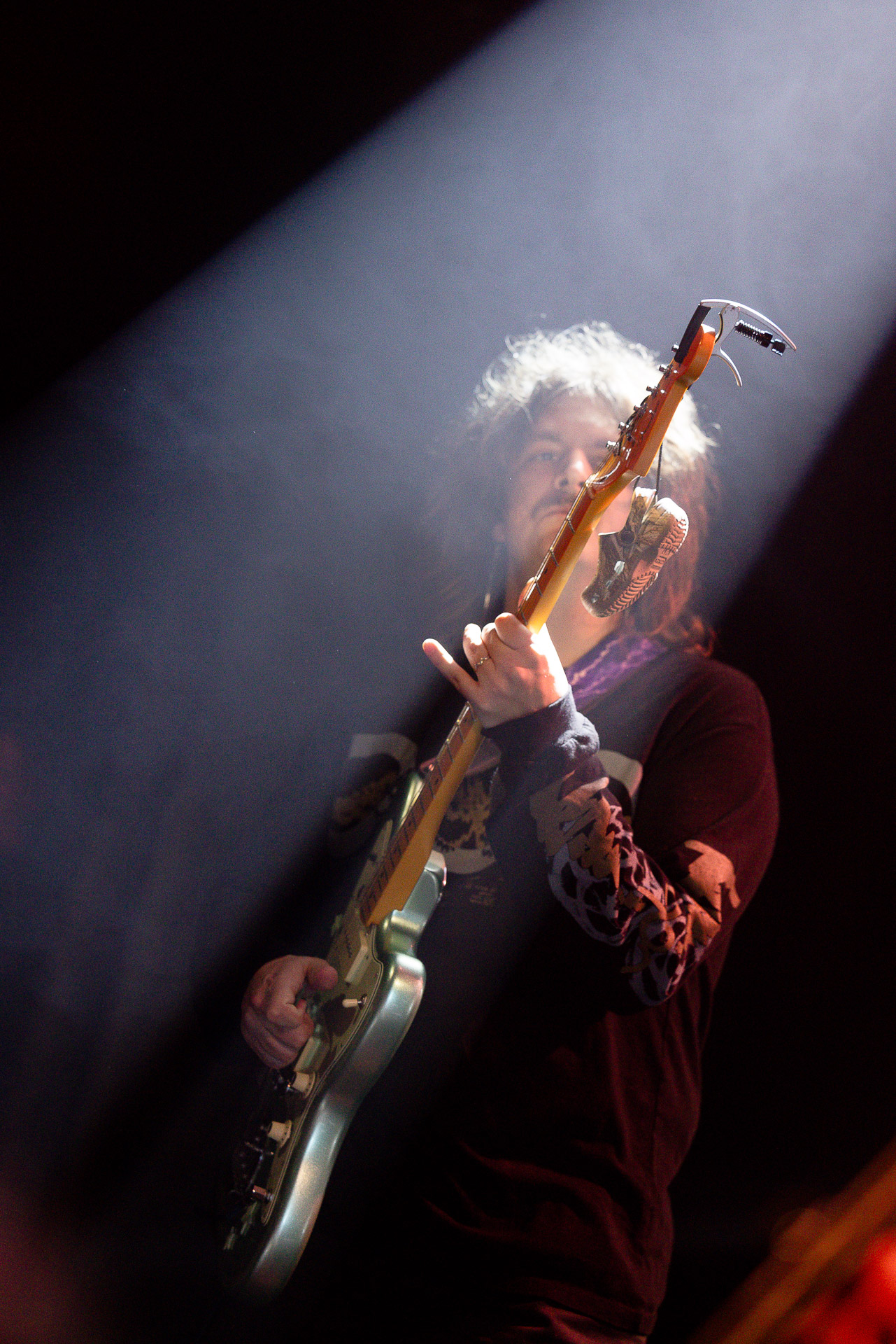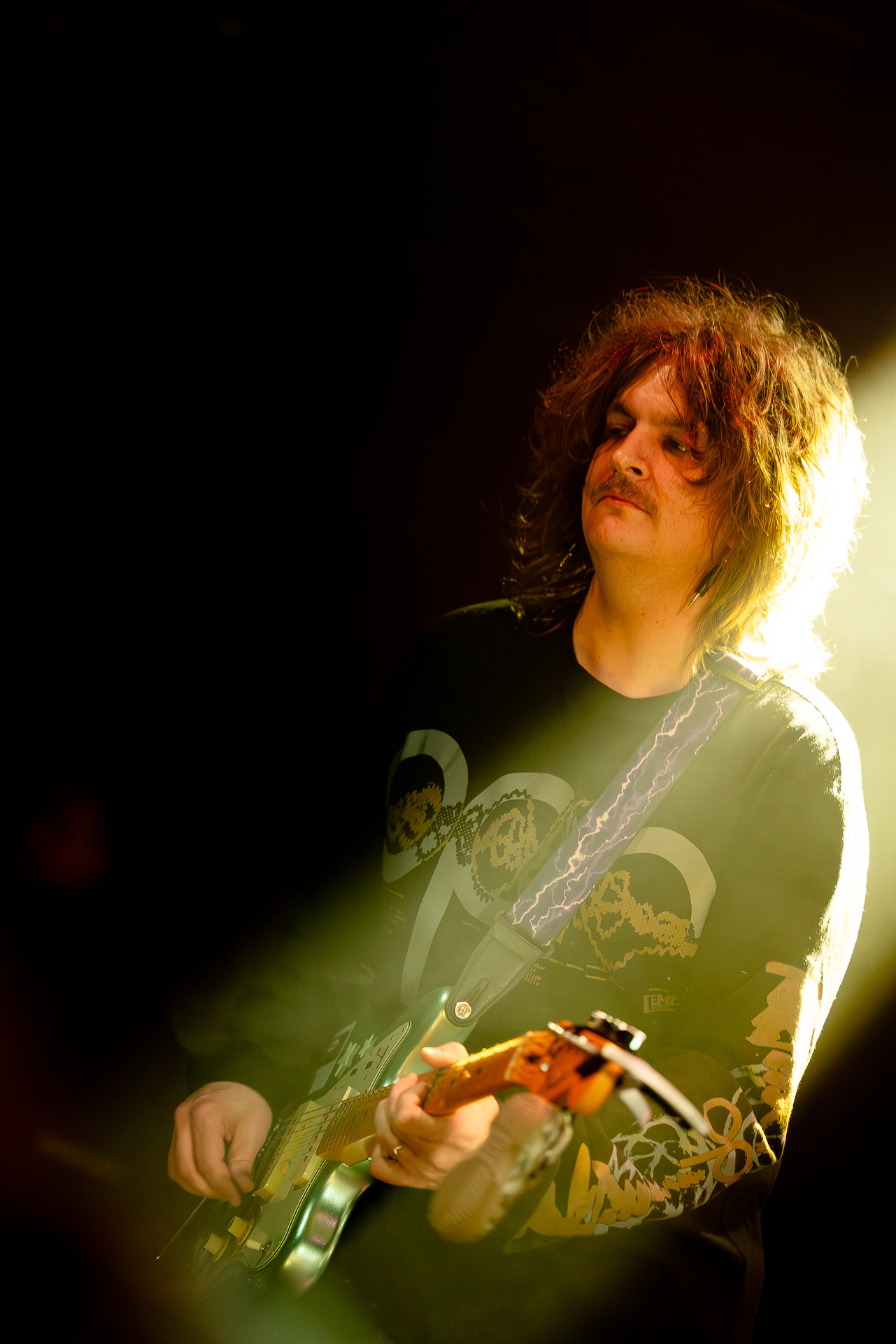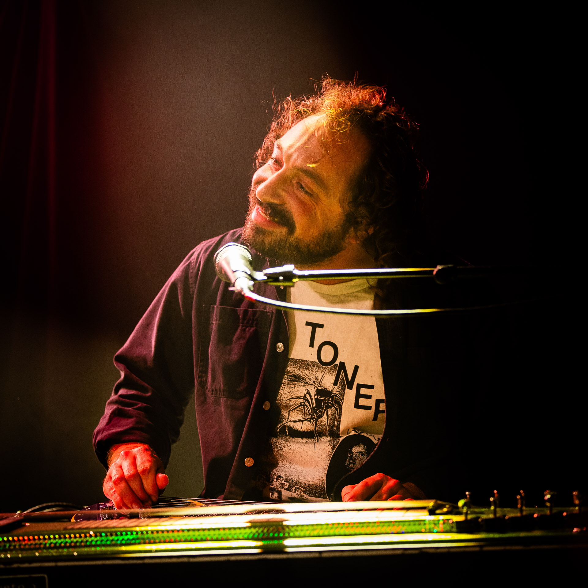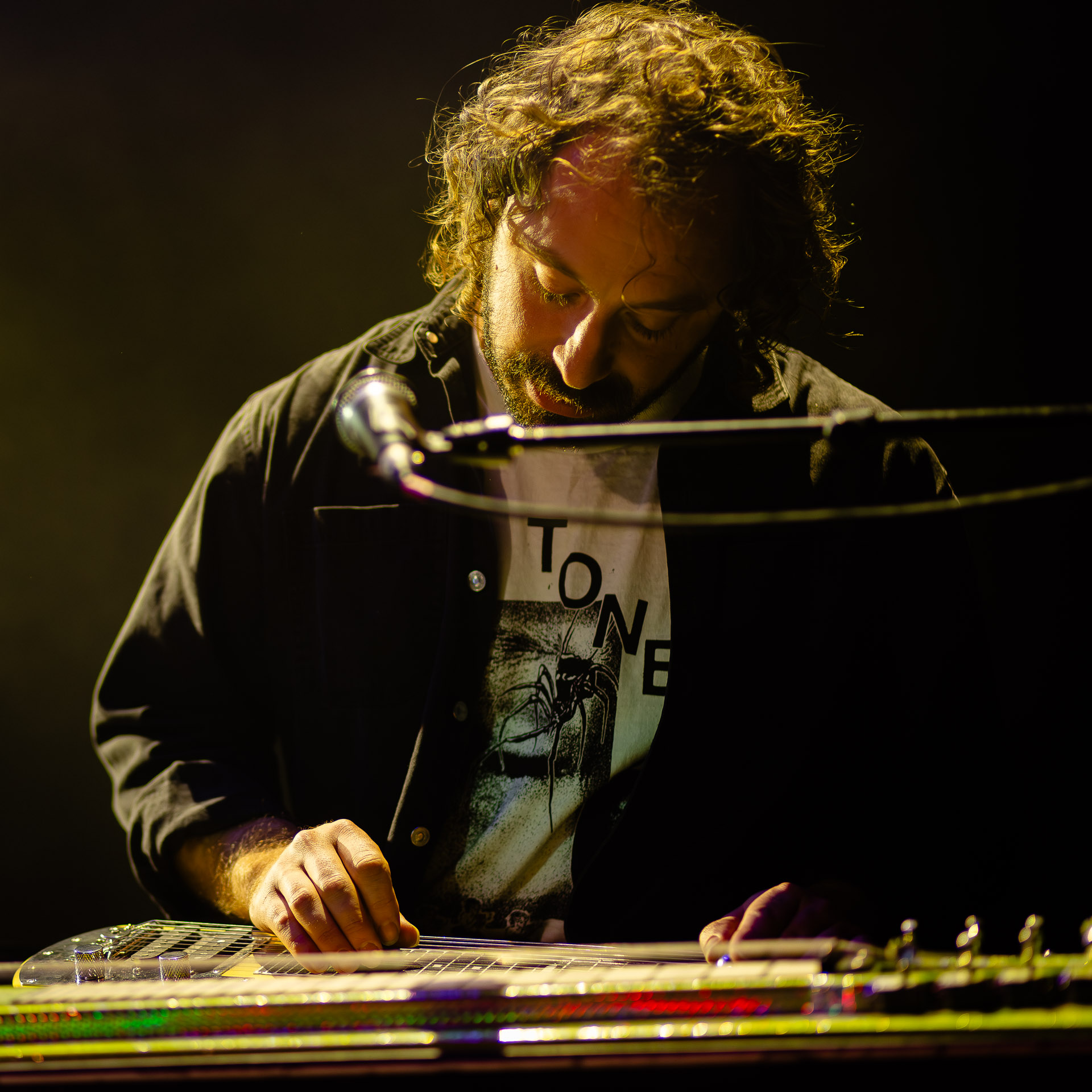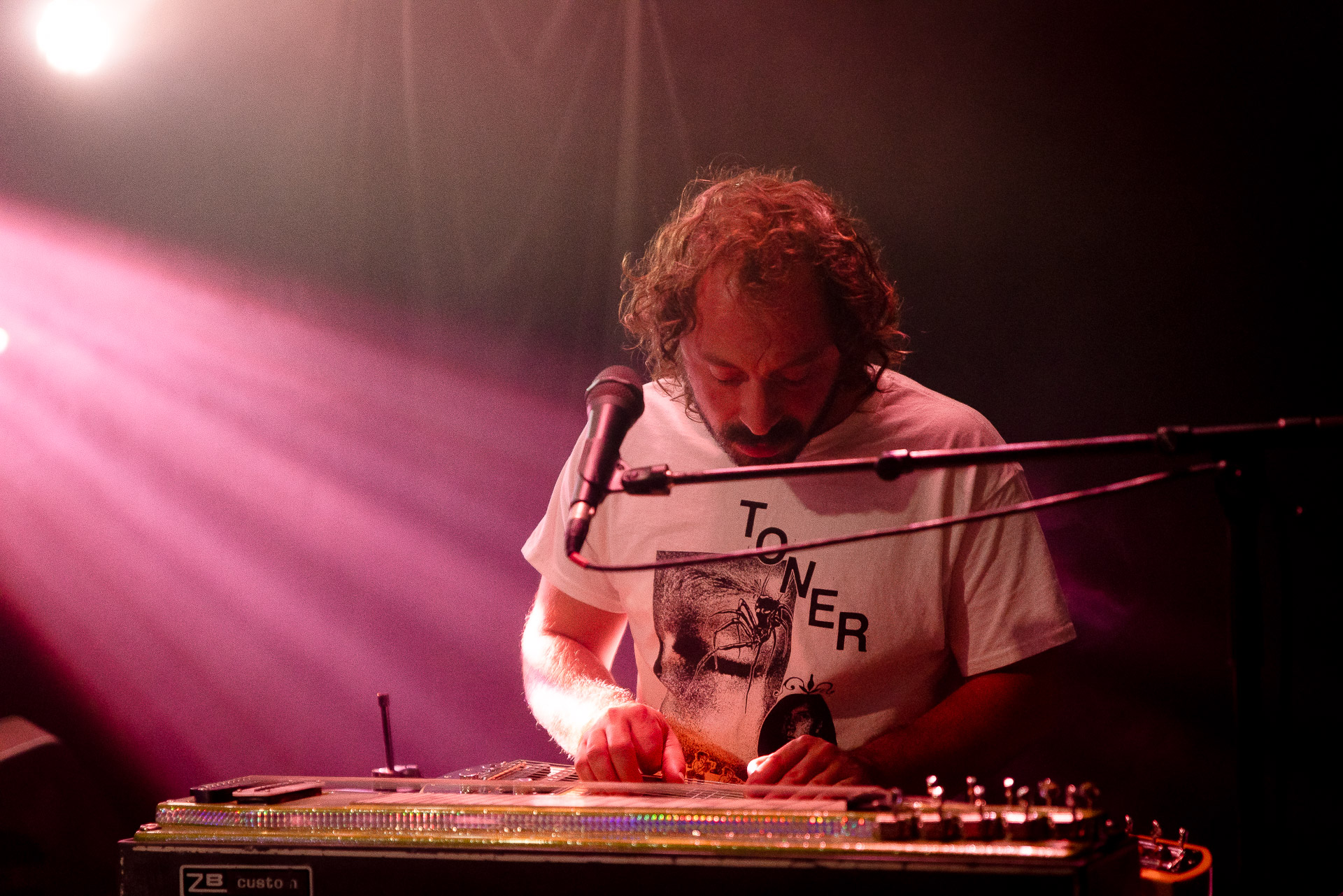 Mais évidemment l’ambiance monte tout de suite d’un can quand on passe au "dur" et on est ravis de se prendre dans les oreilles une bonne dose de distorsion délivrés par trois guitares (dont un "Twin Plagues" aussi monumental et étrange et chaotique et beau en live qu’on l’imaginait en écoutant le disque du même nom), dont le fameux pedalsteel qu’en écoutant l’album on avait surtout associé aux morceaux country et en fait Xandy Chelmis est aussi responsable d’une grande partie des son saturés qui font le son énorme et délicieux du groupe sur Bleeds, et si le lapsteel country c’est sublime quand c’est bien fait (prenons au hasard Paul Niehaus avec Calexico et Lambchop), on découvre le lapsteel noisy et en terme de graou ça n’a rien à envier à une les paul entrain de larsener dans un stack de marshalls.