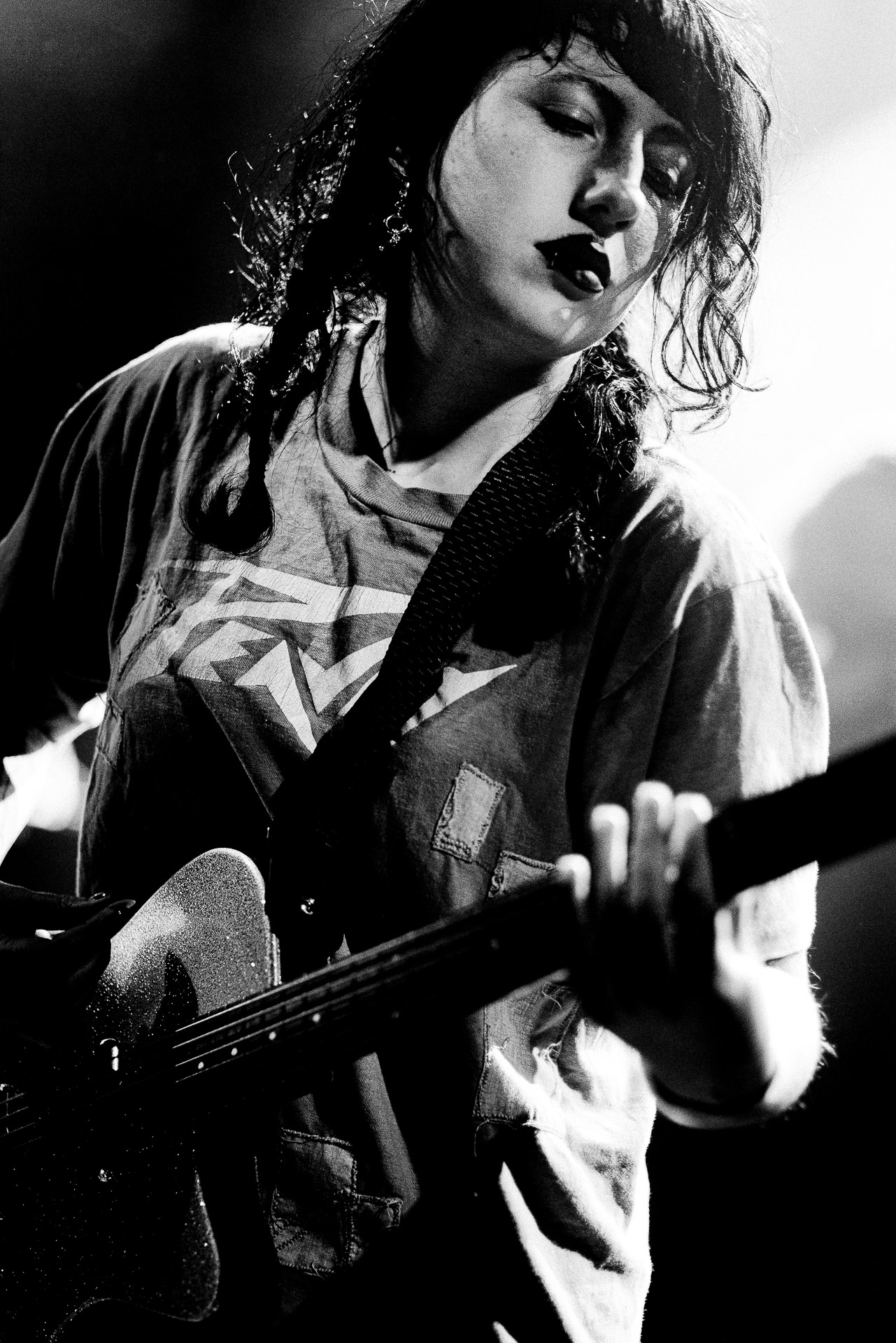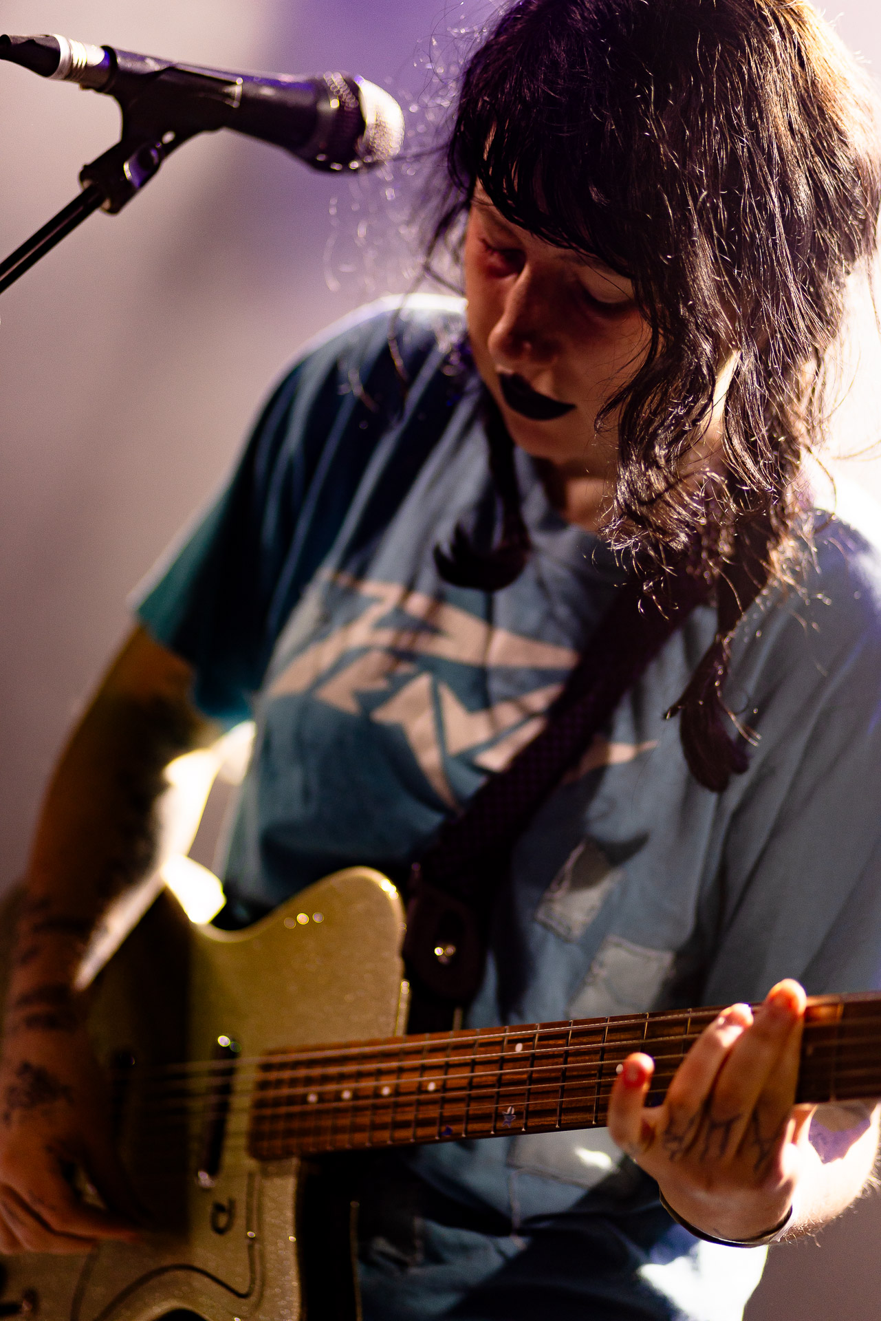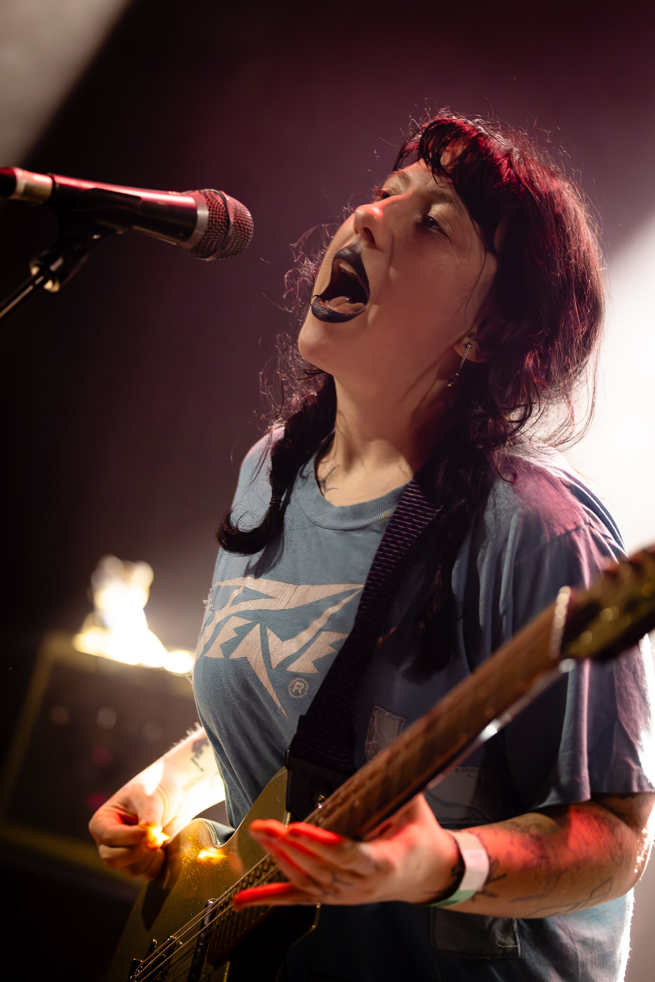 Devant un Trabendo complet voir plus que complet (y a les concerts complets où on garde quand même un petit espace personnel et ceux où l’on est vraiment tous serrés les uns contre les autres là c’est cette seconde option), Karly Hartzman, rouge à lèvres noir , jean noir, et t-shirt bleu Peavey* à la collection de trous conséquente par endroits, a l’air un peu crevée alors qu’elle salue son public parisien mais on est rassuré (?) quand elle nous explique que la tournée est déjà longue mais qu’elle est à un stade où n’a plus envie de se tuer et que ça devrait être bien ce soir. En rigolant of course, mais il y a de quoi poser un personnage plutôt "dark" et punk, entre la Mercredi de la famille Addams (forcément) et Daria et euh Courtney Love ?....