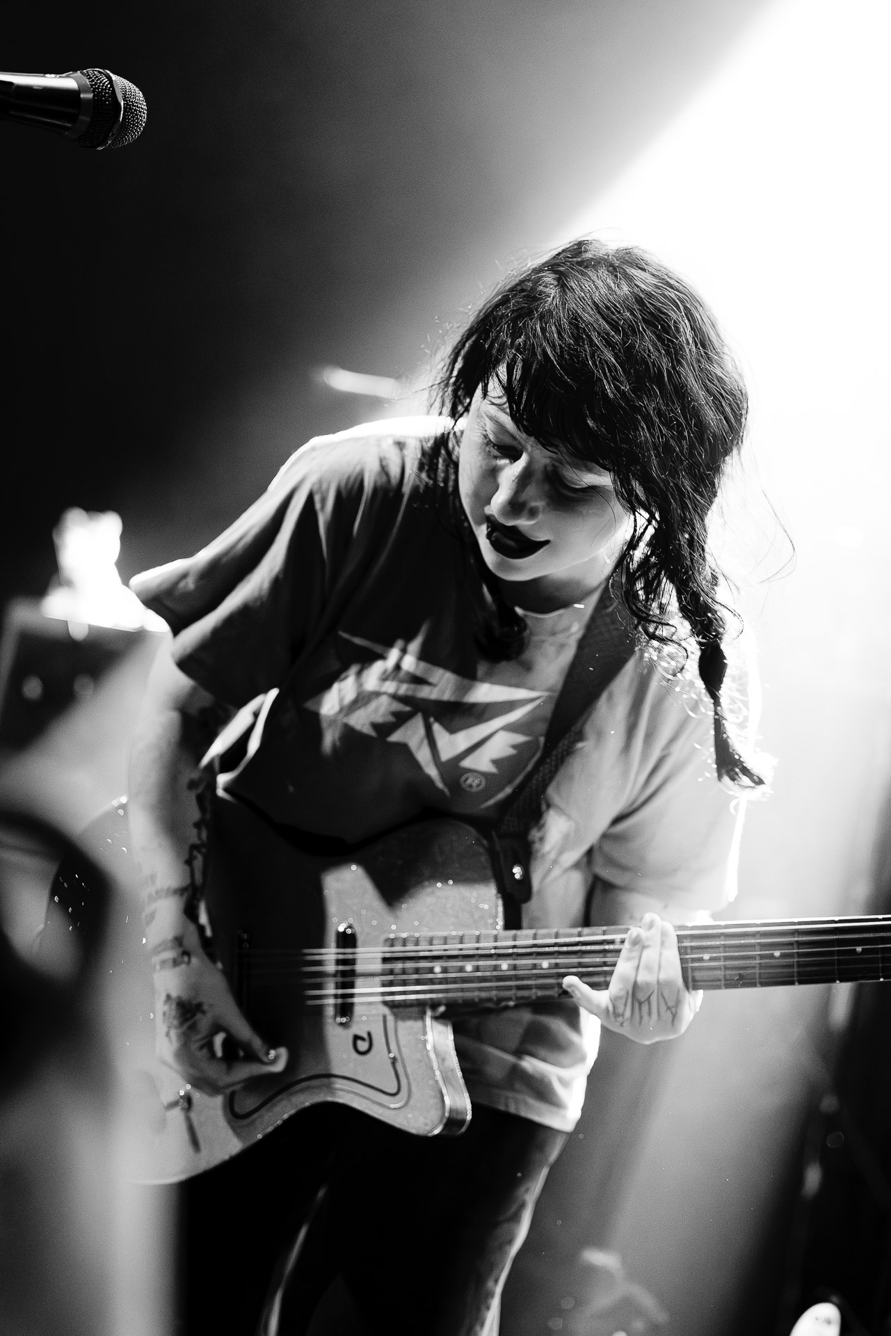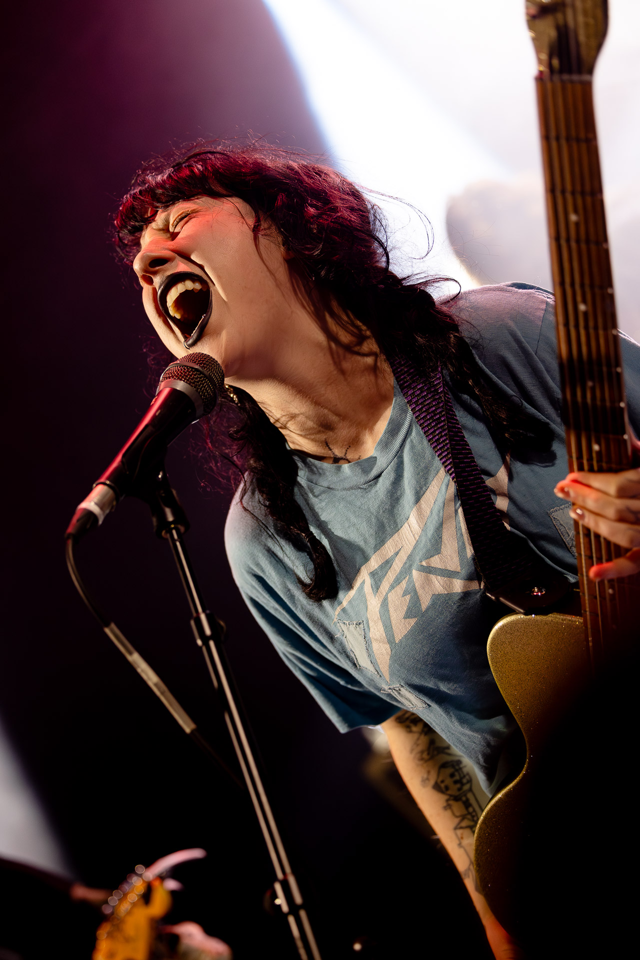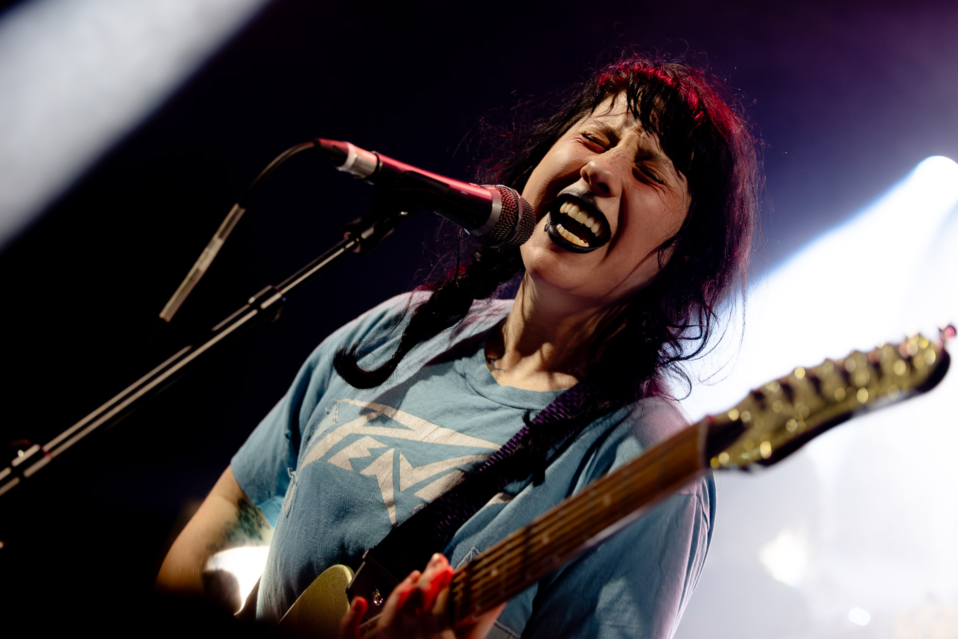Devant un Trabendo complet voir plus que complet (y a les concerts complets où on garde quand même un petit espace personnel et ceux où l’on est vraiment tous serrés les uns contre les autres là c’est cette seconde option), Karly Hartzman, rouge à lèvres noir , jean noir, et t-shirt bleu Peavey* à la collection de trous conséquente par endroits, a l’air un peu crevée alors qu’elle salue son public parisien mais on est rassuré (?) quand elle nous explique que la tournée est déjà longue mais qu’elle est à un stade où n’a plus envie de se tuer et que ça devrait être bien ce soir. En rigolant of course, mais il y a de quoi poser un personnage plutôt "dark" et punk, entre la Mercredi de la famille Addams (forcément) et Daria et euh Courtney Love ?....