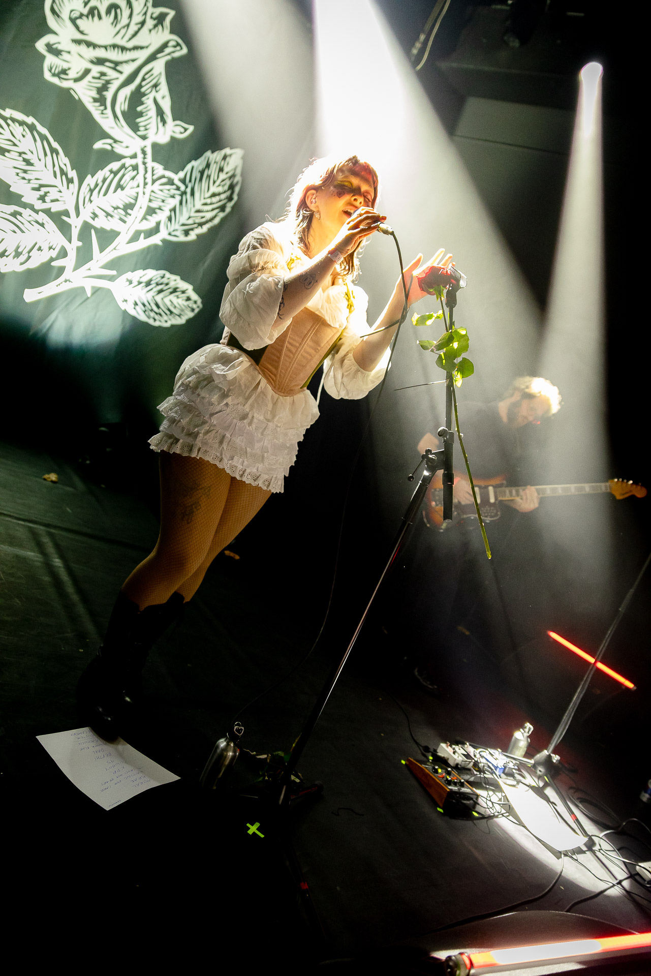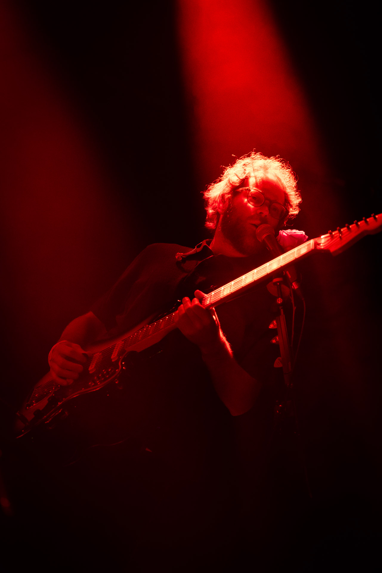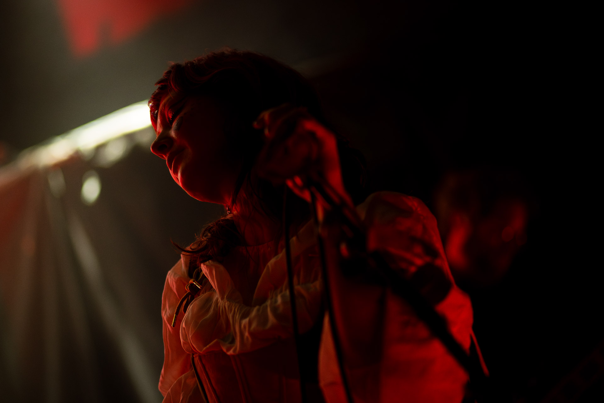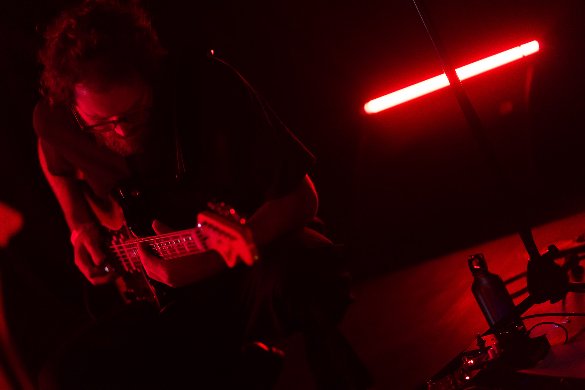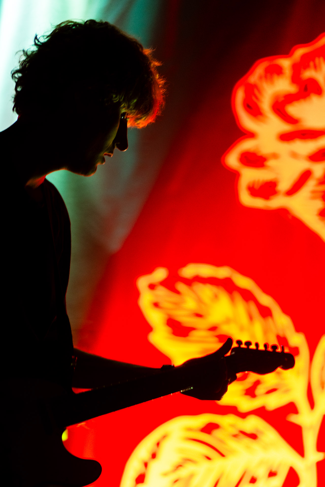 Le groupe a fait le choix un peu malheureux pour nous aussi de jouer dans la pénombre avec quelques moments rouges monochrome ou de lumière blanche aveuglante, difficile dès lors de se "connecter" aux musiciens dont on devine les silhouettes mais pas les expression sauf tout devant (et encore) Et le mix de la boite à rythme nous parait un peu faiblard, ce qui nous donne l’impression que le début de concert se traine et que le groupe, un peu comme nous a du mal à rentrer dedans.