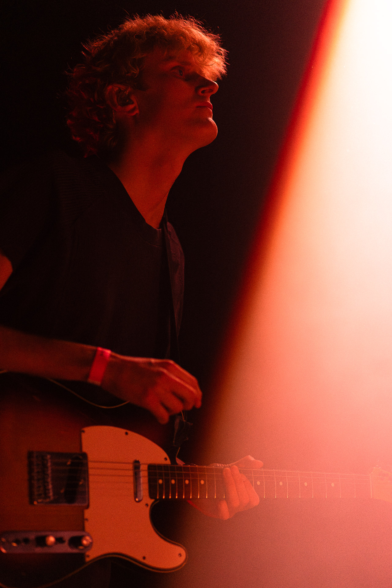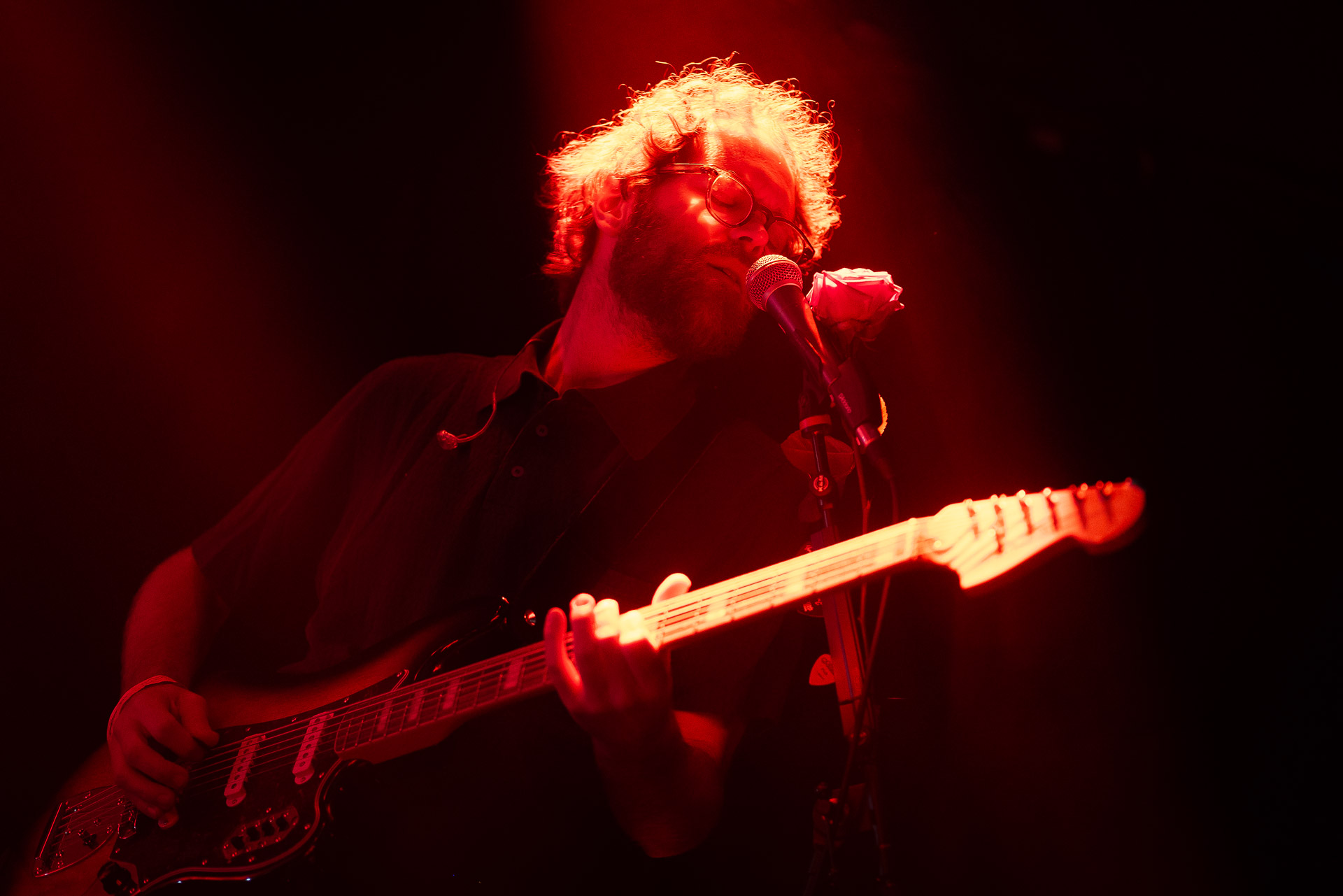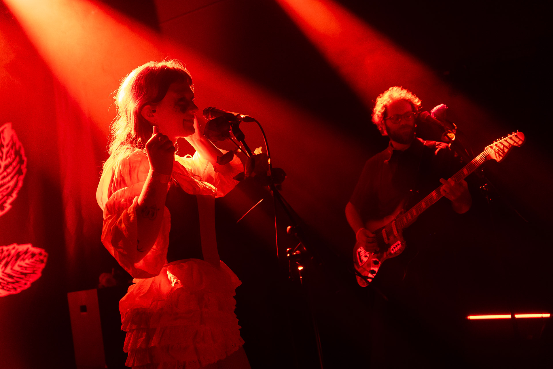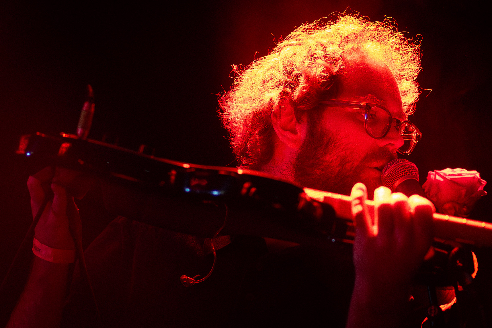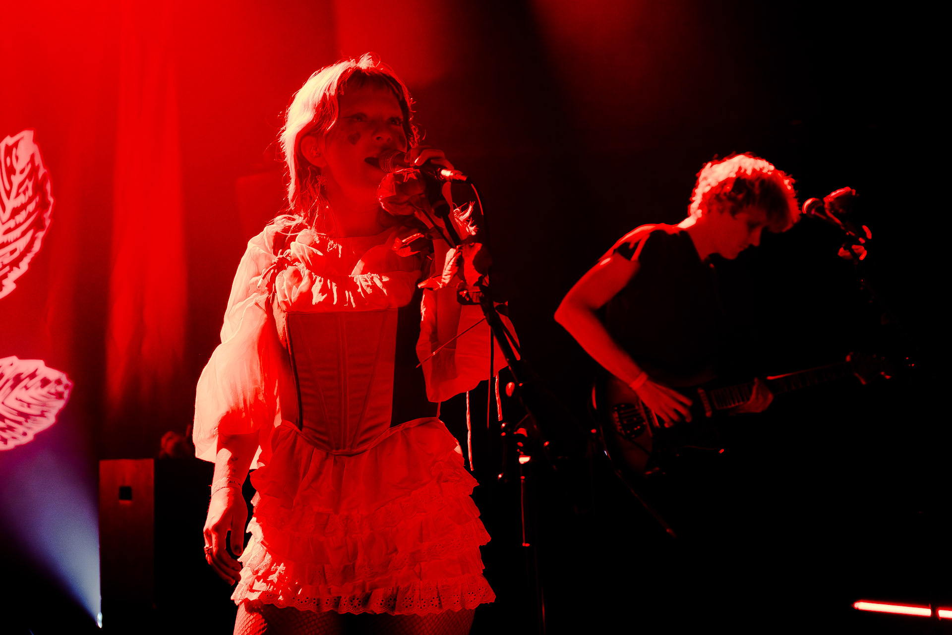 Le groupe a fait le choix un peu malheureux pour nous aussi de jouer dans la pénombre avec quelques moments rouges monochrome ou de lumière blanche aveuglante, difficile dès lors de se "connecter" aux musiciens dont on devine les silhouettes mais pas les expression sauf tout devant (et encore) Et le mix de la boite à rythme nous parait un peu faiblard, ce qui nous donne l’impression que le début de concert se traine et que le groupe, un peu comme nous a du mal à rentrer dedans.