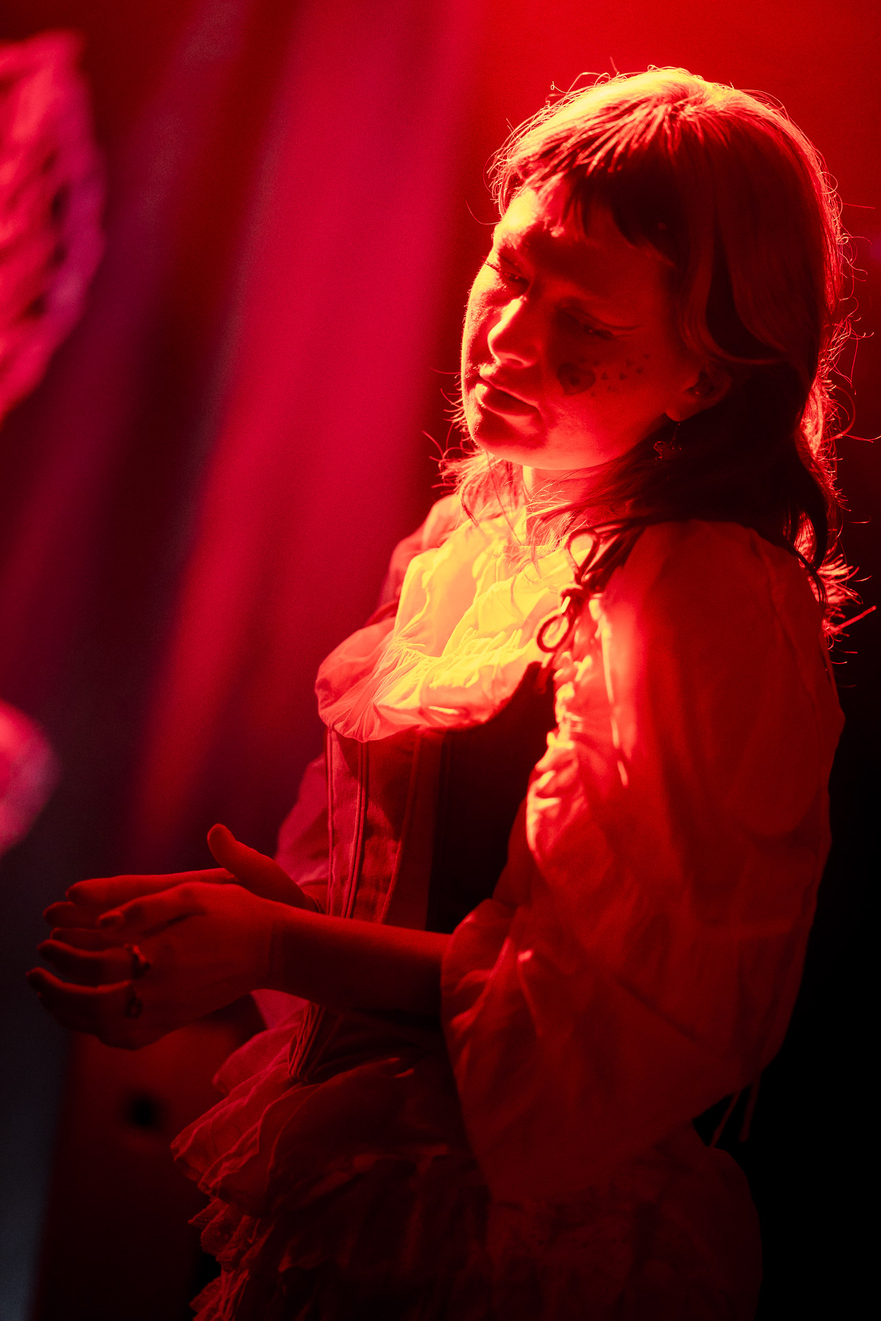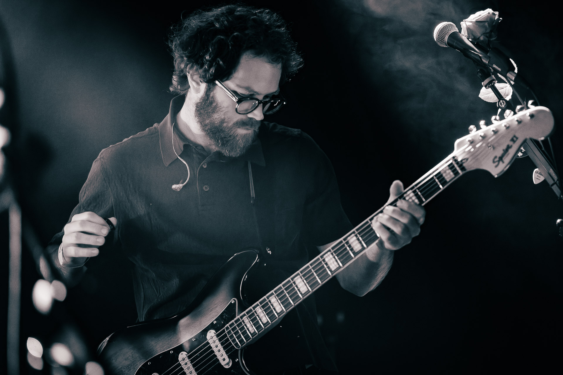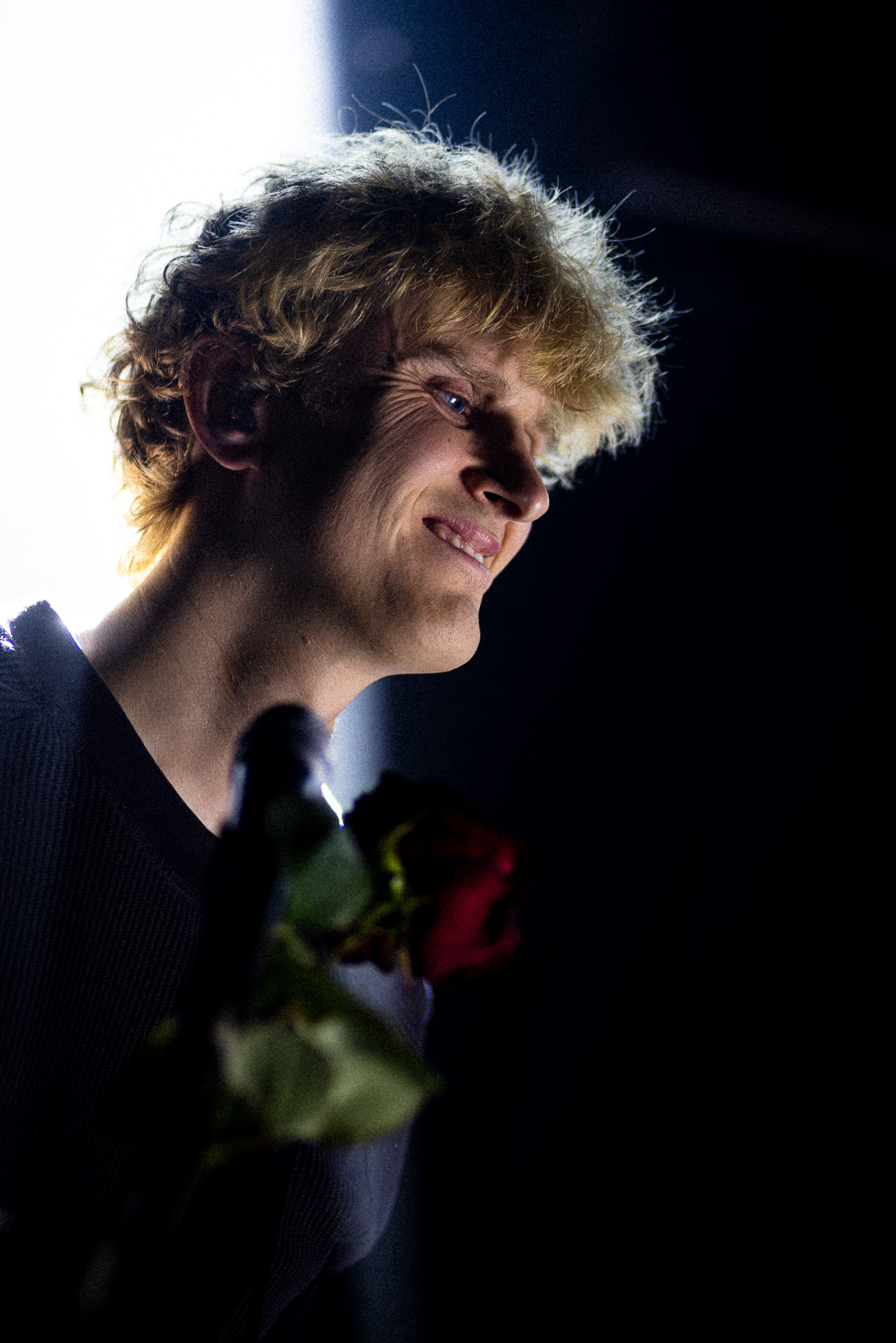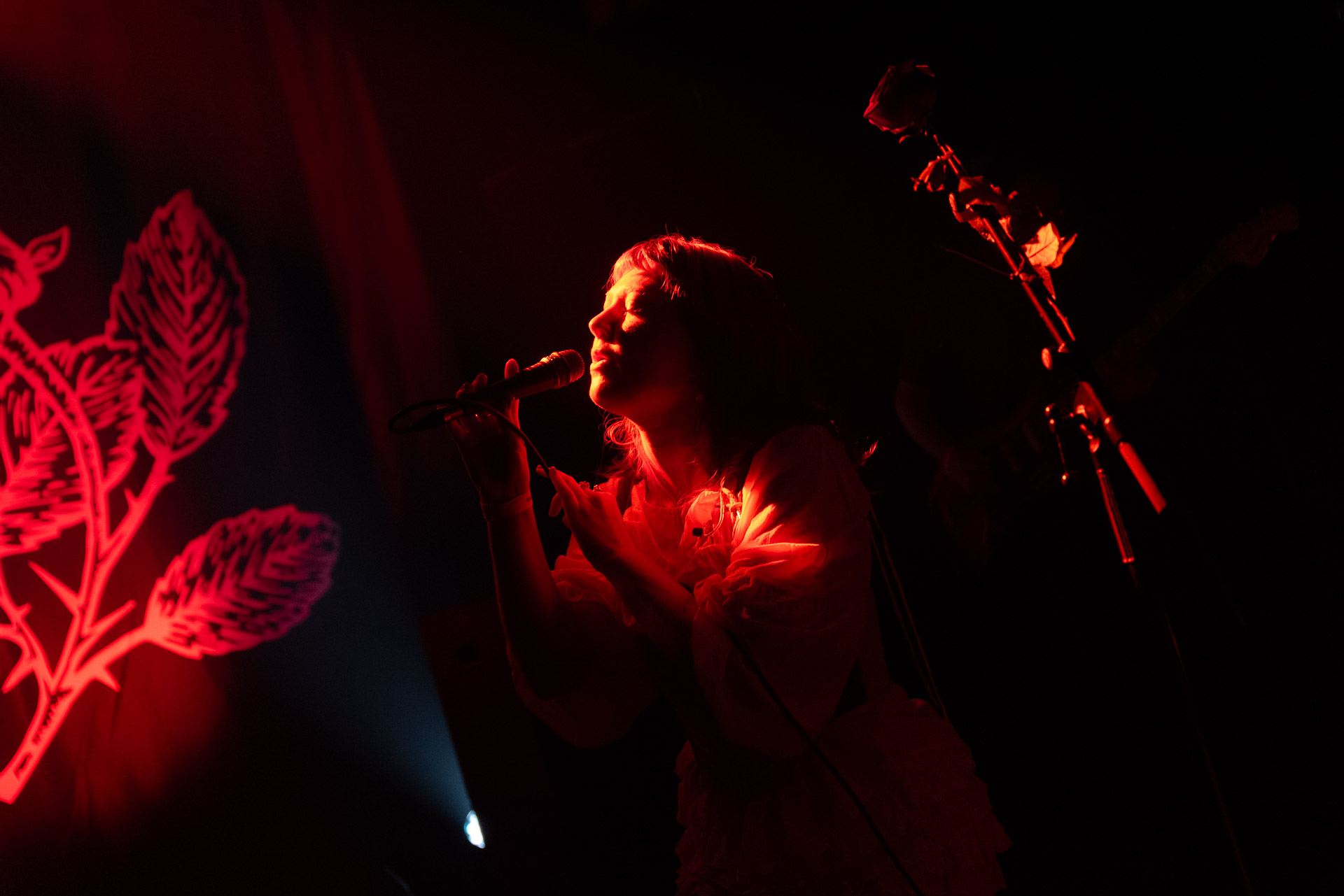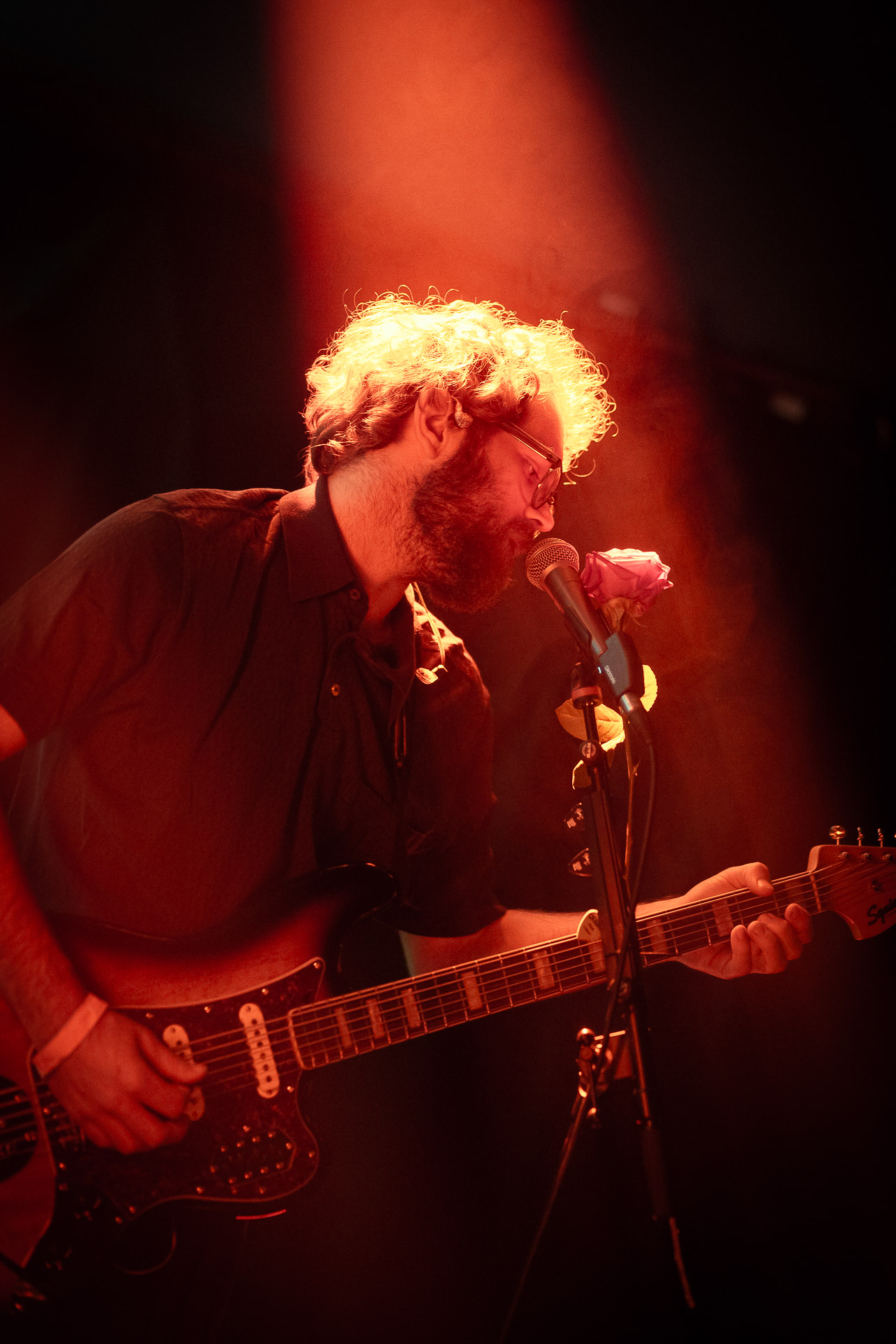 Le groupe a fait le choix un peu malheureux pour nous aussi de jouer dans la pénombre avec quelques moments rouges monochrome ou de lumière blanche aveuglante, difficile dès lors de se "connecter" aux musiciens dont on devine les silhouettes mais pas les expression sauf tout devant (et encore) Et le mix de la boite à rythme nous parait un peu faiblard, ce qui nous donne l’impression que le début de concert se traine et que le groupe, un peu comme nous a du mal à rentrer dedans.
