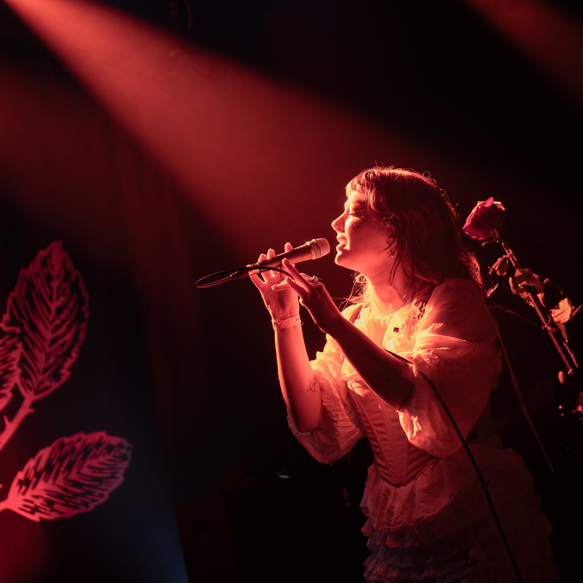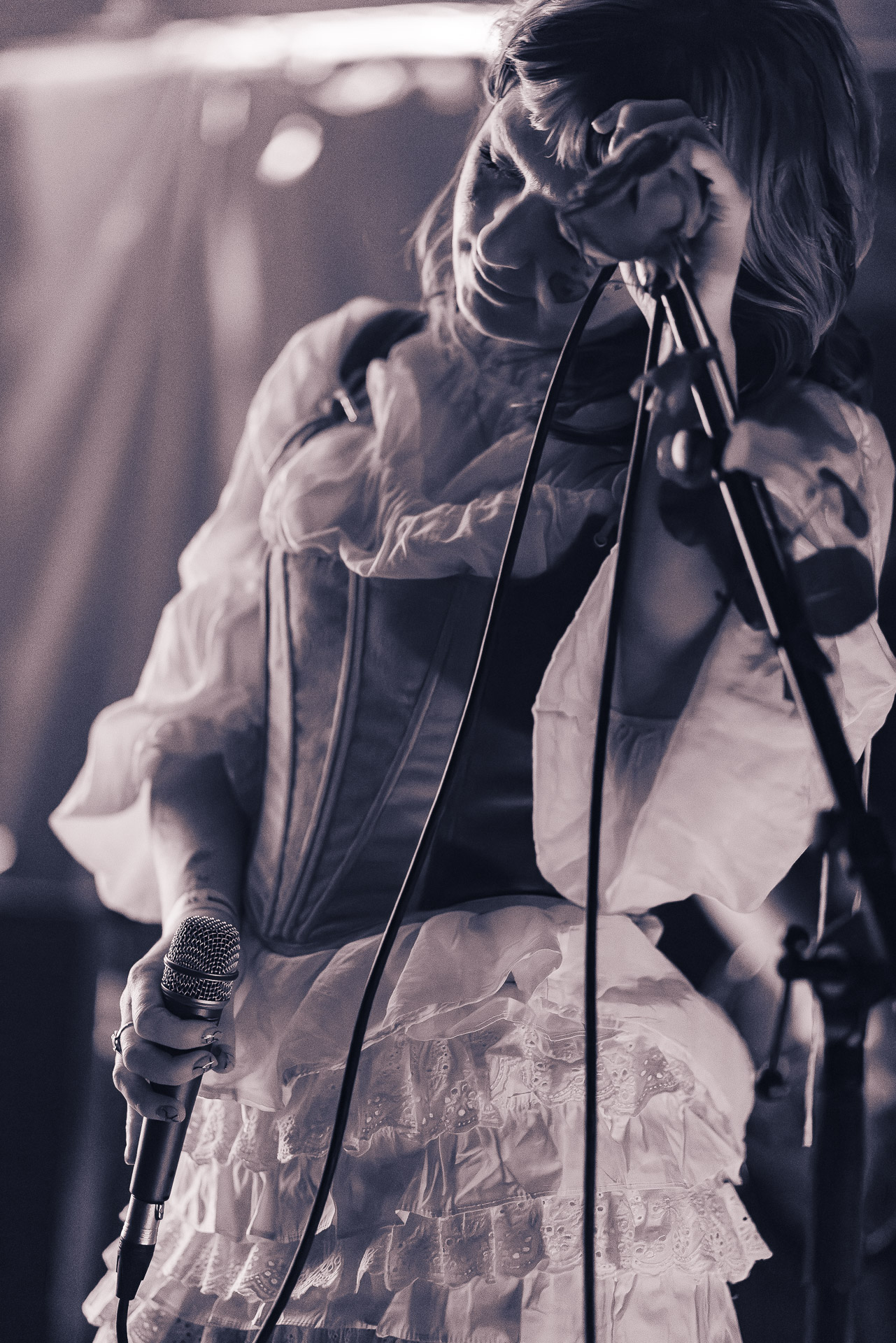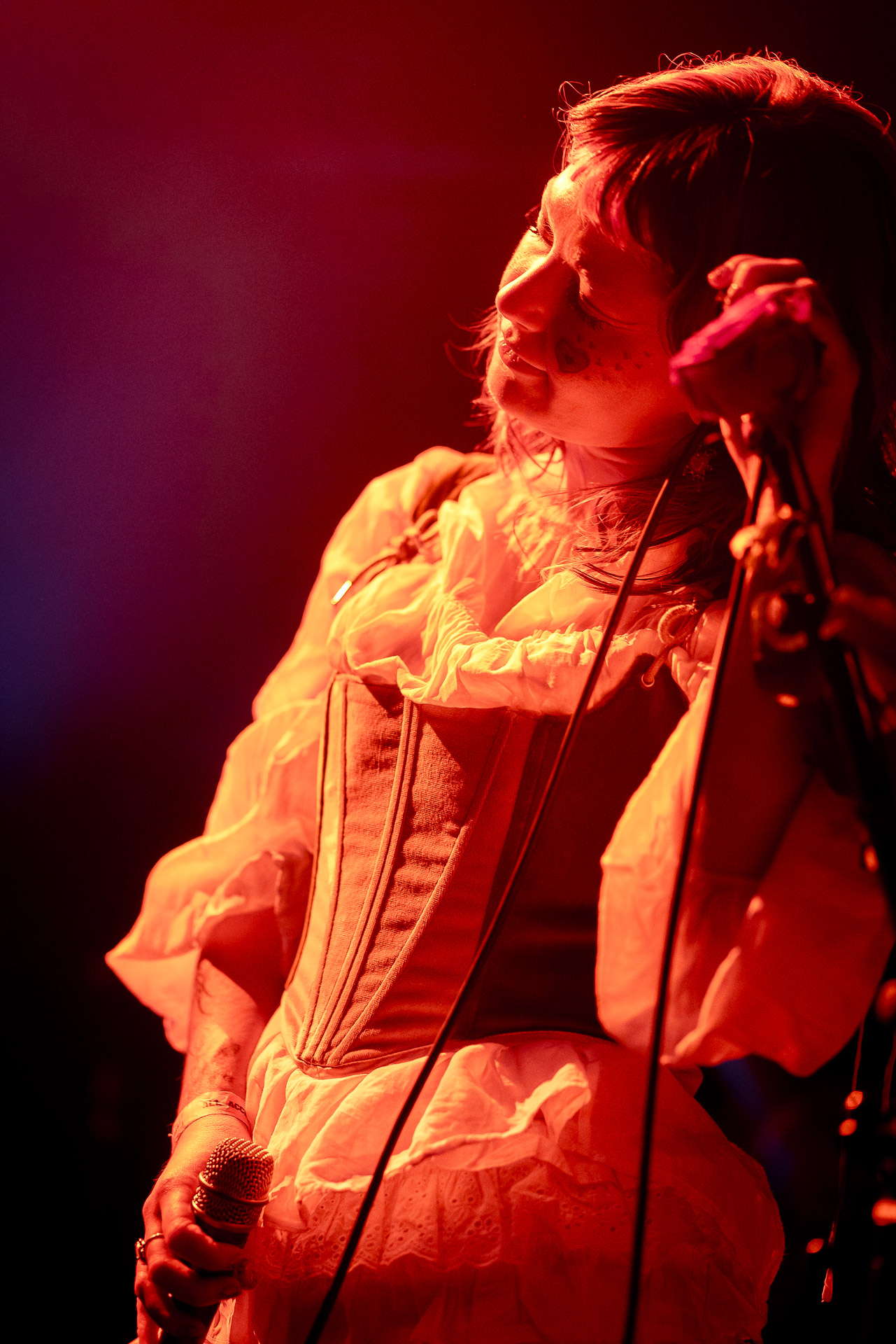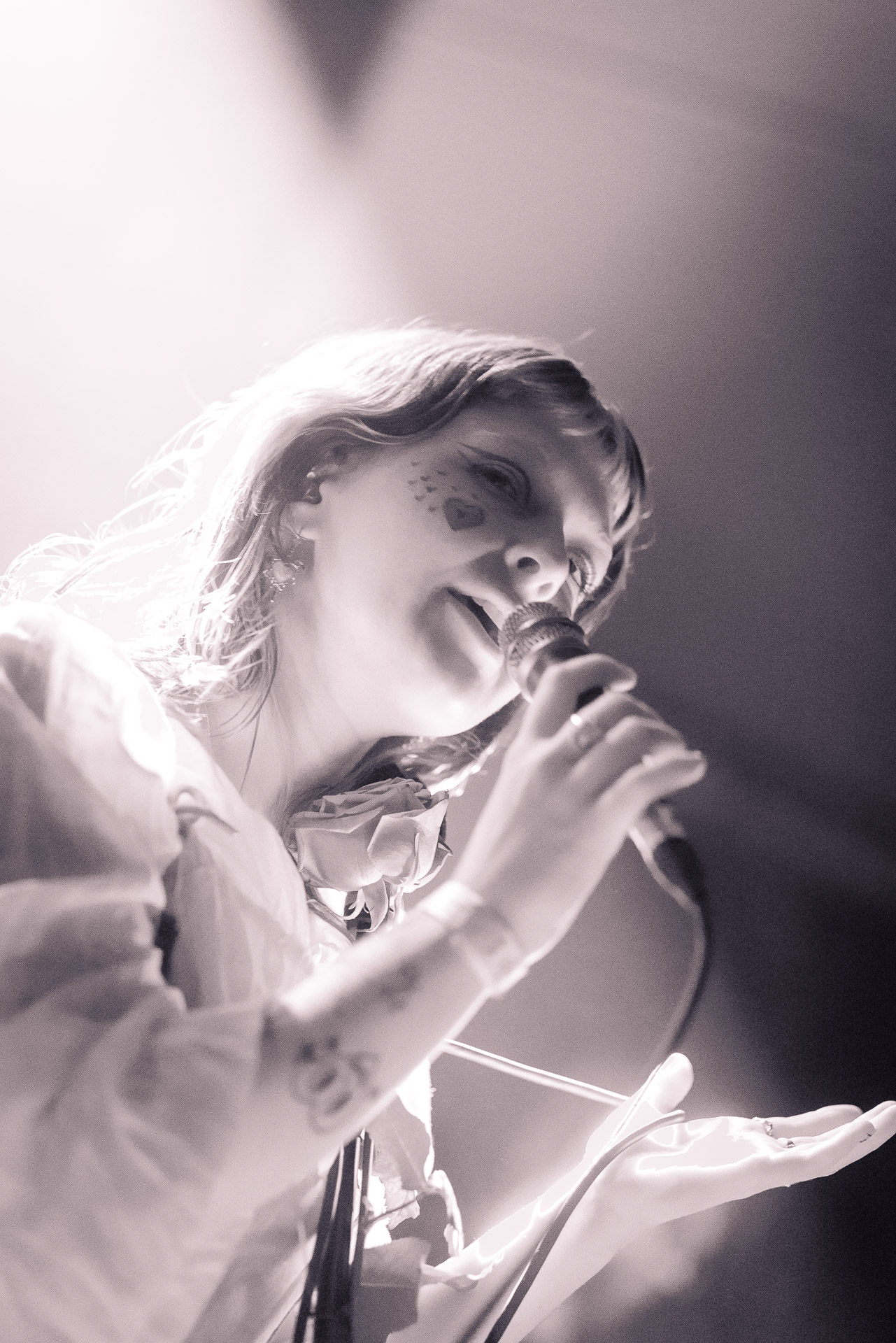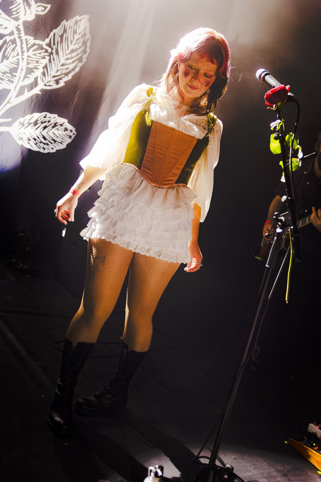 Le groupe a fait le choix un peu malheureux pour nous aussi de jouer dans la pénombre avec quelques moments rouges monochrome ou de lumière blanche aveuglante, difficile dès lors de se "connecter" aux musiciens dont on devine les silhouettes mais pas les expression sauf tout devant (et encore) Et le mix de la boite à rythme nous parait un peu faiblard, ce qui nous donne l’impression que le début de concert se traine et que le groupe, un peu comme nous a du mal à rentrer dedans.
