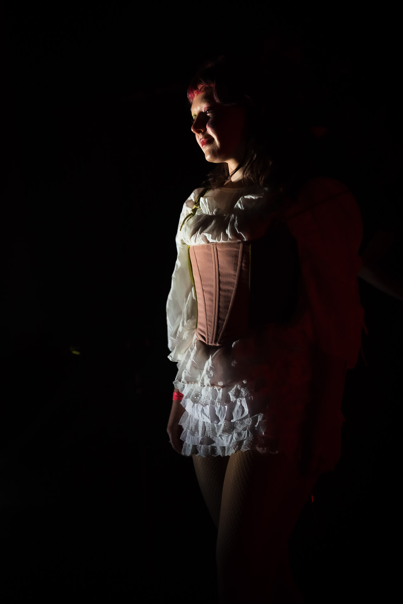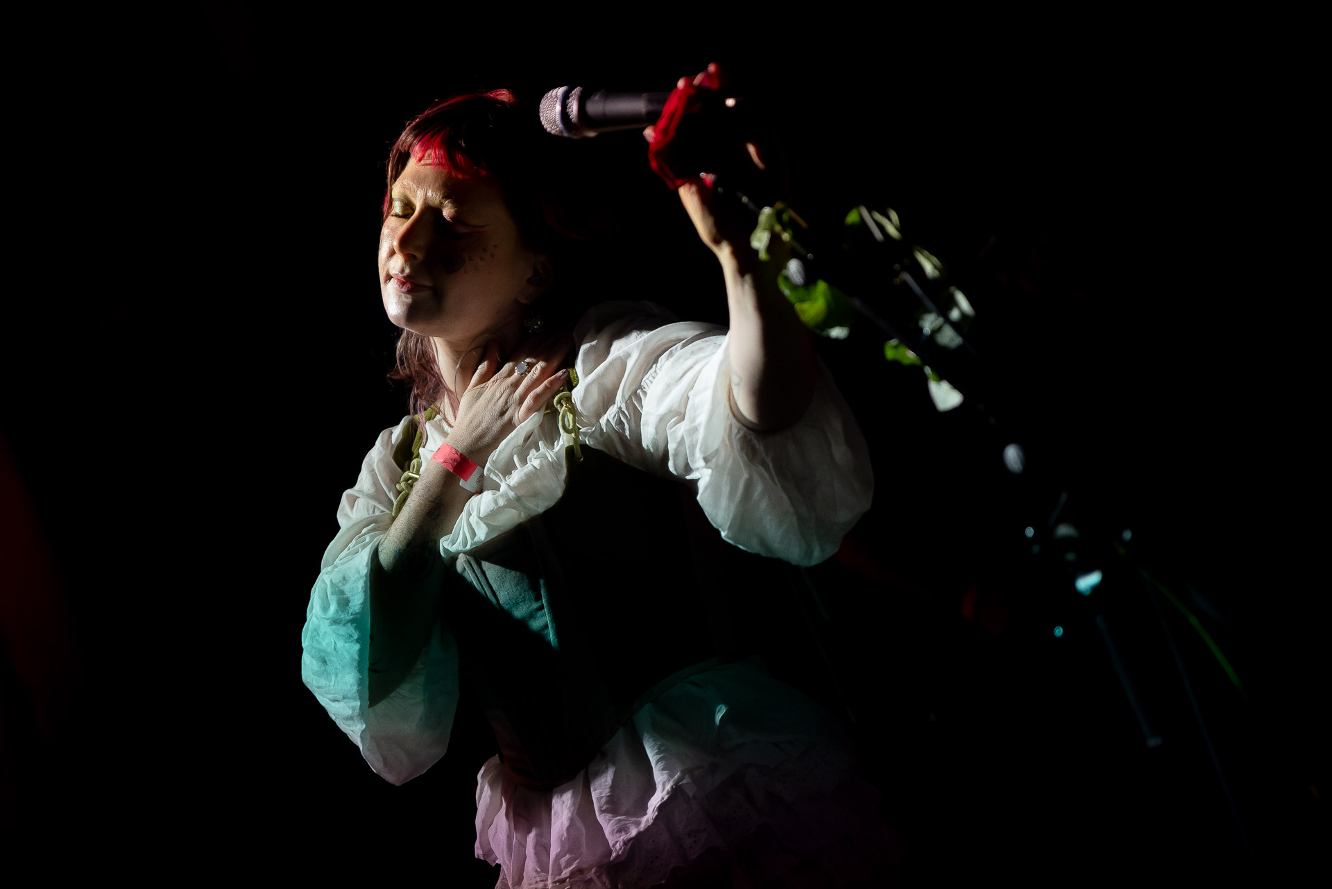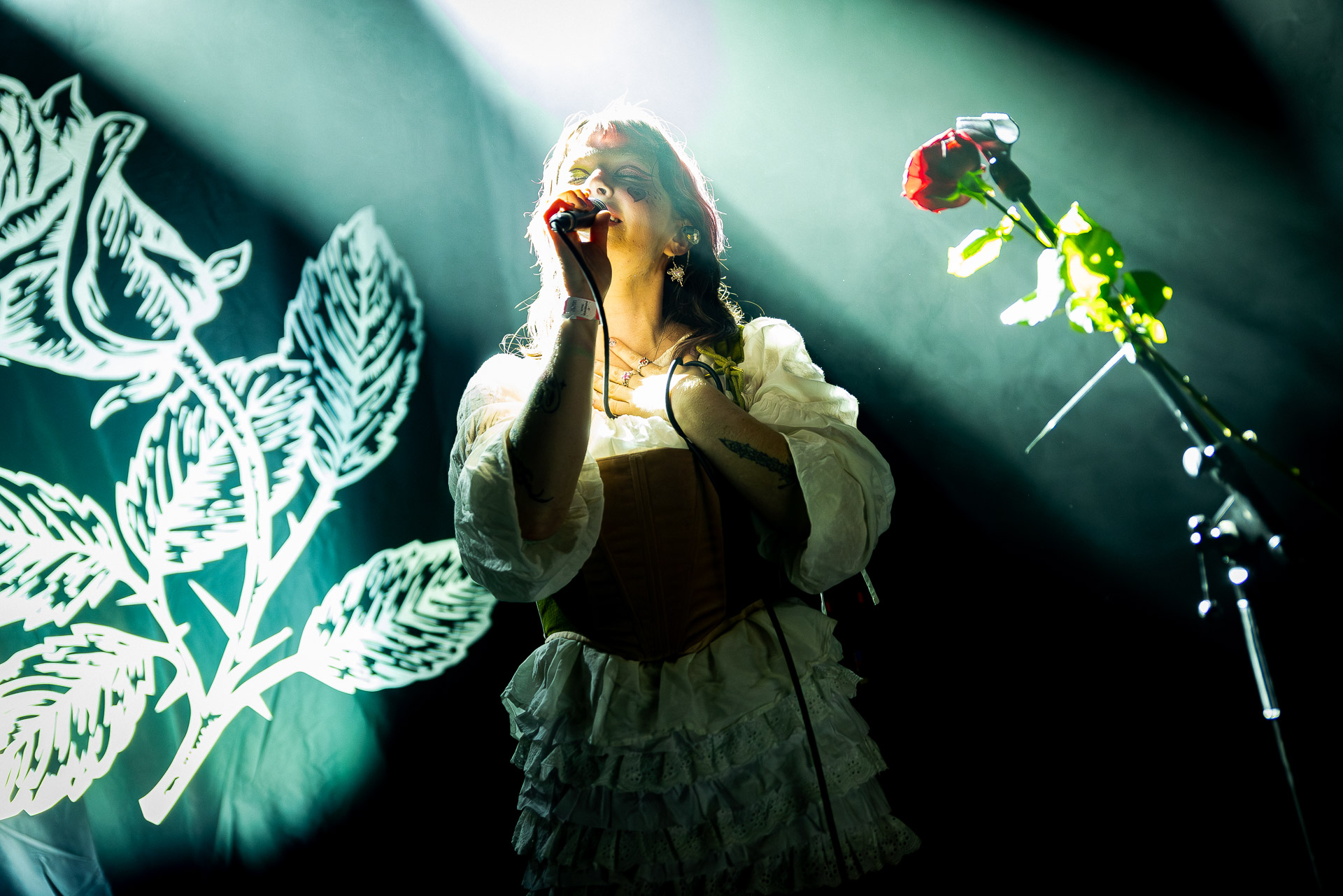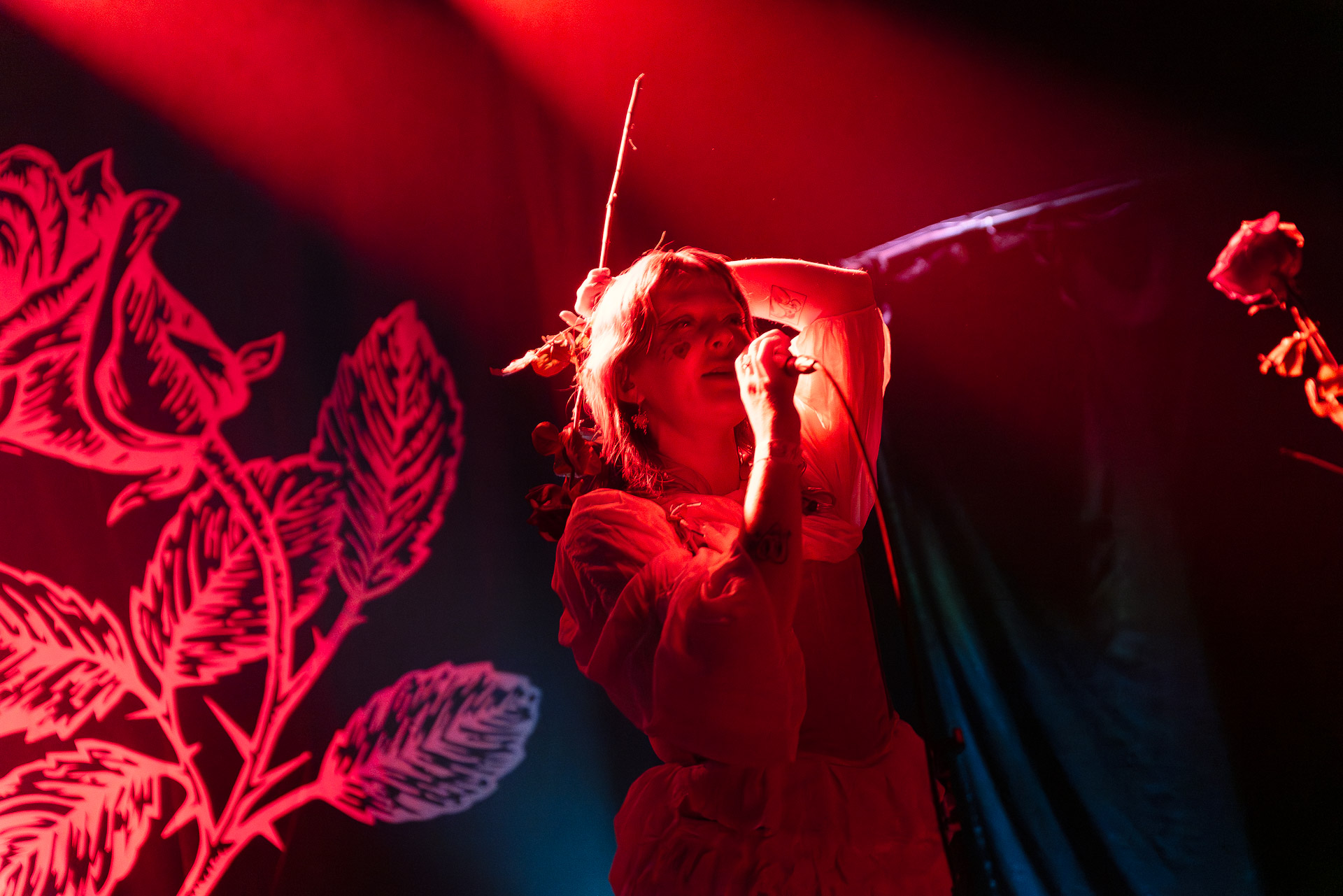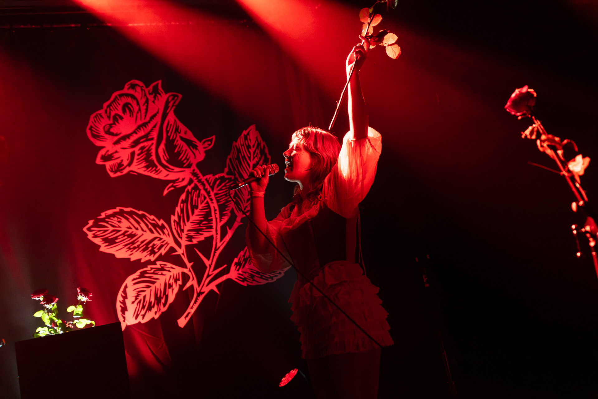 Le groupe a fait le choix un peu malheureux pour nous aussi de jouer dans la pénombre avec quelques moments rouges monochrome ou de lumière blanche aveuglante, difficile dès lors de se "connecter" aux musiciens dont on devine les silhouettes mais pas les expression sauf tout devant (et encore) Et le mix de la boite à rythme nous parait un peu faiblard, ce qui nous donne l’impression que le début de concert se traine et que le groupe, un peu comme nous a du mal à rentrer dedans.